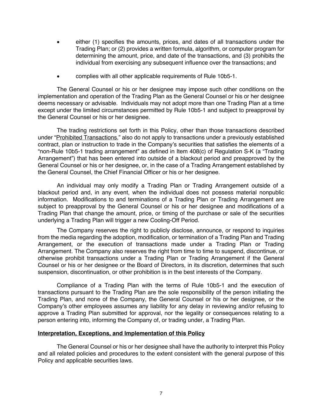 7 • either (1) specifies the amounts, prices, and dates of all transactions under the Trading Plan; or (2) provides a written formula, algorithm, or computer program for determining the amount, price, and date of the transactions, and (3) prohibits the individual from exercising any subsequent influence over the transactions; and • complies with all other applicable requirements of Rule 10b5-1. The General Counsel or his or her designee may impose such other conditions on the implementation and operation of the Trading Plan as the General Counsel or his or her designee deems necessary or advisable. Individuals may not adopt more than one Trading Plan at a time except under the limited circumstances permitted by Rule 10b5-1 and subject to preapproval by the General Counsel or his or her designee. The trading restrictions set forth in this Policy, other than those transactions described under “Prohibited Transactions,” also do not apply to transactions under a previously established contract, plan or instruction to trade in the Company’s securities that satisfies the elements of a “non-Rule 10b5-1 trading arrangement” as defined in Item 408(c) of Regulation S-K (a “Trading Arrangement”) that has been entered into outside of a blackout period and preapproved by the General Counsel or his or her designee, or, in the case of a Trading Arrangement established by the General Counsel, the Chief Financial Officer or his or her designee. An individual may only modify a Trading Plan or Trading Arrangement outside of a blackout period and, in any event, when the individual does not possess material nonpublic information. Modifications to and terminations of a Trading Plan or Trading Arrangement are subject to preapproval by the General Counsel or his or her designee and modifications of a Trading Plan that change the amount, price, or timing of the purchase or sale of the securities underlying a Trading Plan will trigger a new Cooling-Off Period. The Company reserves the right to publicly disclose, announce, or respond to inquiries from the media regarding the adoption, modification, or termination of a Trading Plan and Trading Arrangement, or the execution of transactions made under a Trading Plan or Trading Arrangement. The Company also reserves the right from time to time to suspend, discontinue, or otherwise prohibit transactions under a Trading Plan or Trading Arrangement if the General Counsel or his or her designee or the Board of Directors, in its discretion, determines that such suspension, discontinuation, or other prohibition is in the best interests of the Company. Compliance of a Trading Plan with the terms of Rule 10b5-1 and the execution of transactions pursuant to the Trading Plan are the sole responsibility of the person initiating the Trading Plan, and none of the Company, the General Counsel or his or her designee, or the Company’s other employees assumes any liability for any delay in reviewing and/or refusing to approve a Trading Plan submitted for approval, nor the legality or consequences relating to a person entering into, informing the Company of, or trading under, a Trading Plan. Interpretation, Exceptions, and Implementation of this Policy The General Counsel or his or her designee shall have the authority to interpret this Policy and all related policies and procedures to the extent consistent with the general purpose of this Policy and applicable securities laws.