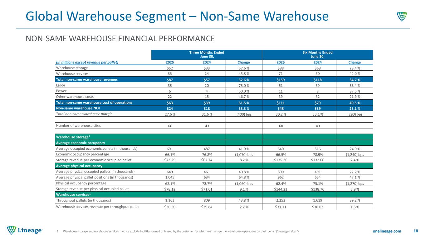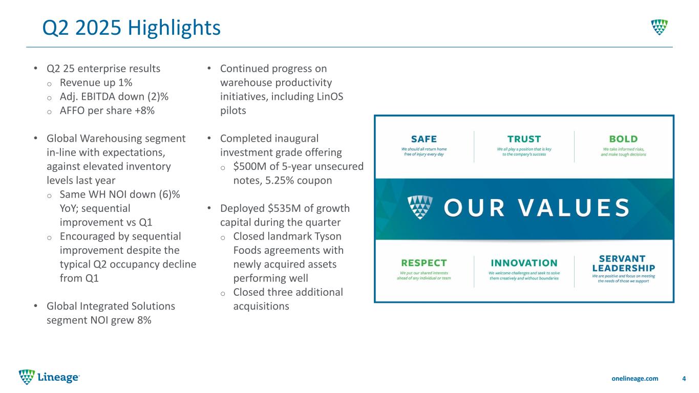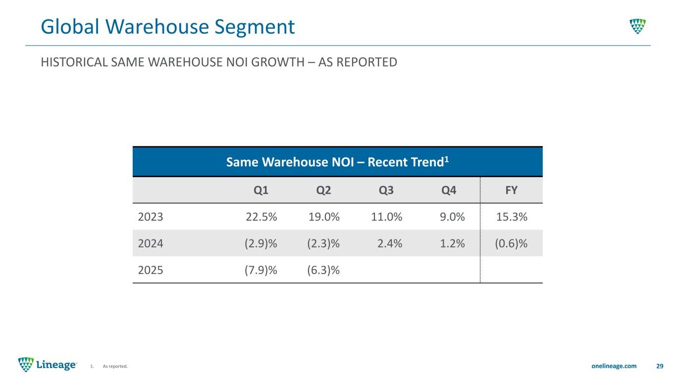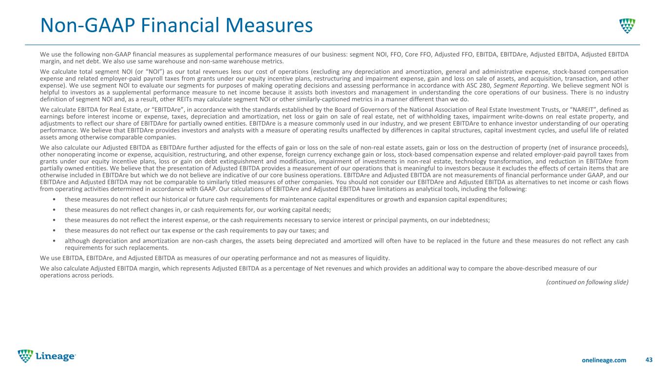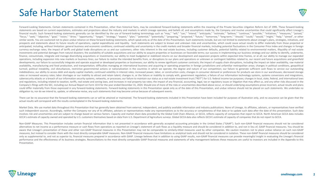 Certain statements contained in this Press Release, other than historical facts, may be considered forward-looking statements within the meaning of the Private Securities Litigation Reform Act of 1995. These forward-looking statements are based on current expectations, estimates and projections about the industry and markets in which Lineage operates, and beliefs of, and assumptions made by, the Company and involve uncertainties that could significantly affect Lineage’s financial results. Such forward-looking statements generally can be identified by the use of forward-looking terminology such as “may,” “will,” “can,” “intend,” “anticipate,” “estimate,” “believe,” “continue,” “possible,” “initiatives,” “measures,” “poised,” “focus,” “seek,” “objective,” “goal,” “vision,” “drive,” “opportunity,” “target,” “strategy,” “expect,” “plan,” “potential,” “potentially,” “preparing,” “projected,” “future,” “tomorrow,” “long-term,” “should,” “could,” “would,” “might,” “help,” “aimed”, or other similar words. You are cautioned not to place undue reliance on these forward-looking statements, which speak only as of the date of this Press Release. Such statements include, but are not limited to statements about Lineage’s plans, strategies, initiatives, and prospects and statements about its future results of operations, capital expenditures and liquidity. Such statements are subject to known and unknown risks and uncertainties, which could cause actual results to differ materially from those projected or anticipated, including, without limitation: general business and economic conditions; continued volatility and uncertainty in the credit markets and broader financial markets, including potential fluctuations in the Consumer Price Index and changes in foreign currency exchange rates; the impact of tariffs and global trade disruptions on us and our customers; other risks inherent in the real estate business, including customer defaults, potential liability related to environmental matters, illiquidity of real estate investments and potential damages from natural disasters; the availability of suitable acquisitions and our ability to acquire properties or businesses on favorable terms; our success in implementing our business strategy and our ability to identify, underwrite, finance, consummate, integrate and manage diversifying acquisitions or investments; our ability to meet budgeted or stabilized returns on our development and expansion projects within expected time frames, or at all; our ability to manage our expanded operations, including expansion into new markets or business lines; our failure to realize the intended benefits from, or disruptions to our plans and operations or unknown or contingent liabilities related to, our recent and future acquisitions and greenfield developments; our failure to successfully integrate and operate acquired or developed properties or businesses; our ability to renew significant customer contracts; the impact of supply chain disruptions, including the impact on labor availability, raw material availability, manufacturing and food production, and transportation; difficulties managing an international business and acquiring or operating properties in foreign jurisdictions and unfamiliar metropolitan areas; changes in political conditions, geopolitical turmoil, political instability, civil disturbances, restrictive governmental actions or nationalization in the countries in which we operate; the degree and nature of our competition; our failure to generate sufficient cash flows to service our outstanding indebtedness; our ability to access debt and equity capital markets; continued volatility in interest rates; increased power, labor, or construction costs; changes in consumer demand or preferences for products we store in our warehouses; decreased storage rates or increased vacancy rates; labor shortages or our inability to attract and retain talent; changes in, or the failure or inability to comply with, government regulation; a failure of our information technology systems, systems conversions and integrations, cybersecurity attacks or a breach of our information security systems, networks, or processes; our failure to maintain our status as a real estate investment trust (“REIT”) for U.S. federal income tax purposes; changes in local, state, federal, and international laws and regulations, including related to taxation, tariffs, real estate and zoning laws, and increases in real property tax rates; the impact of any financial, accounting, legal, tax or regulatory issues or litigation that may affect us, and any other risks discussed in the Company’s filings with the SEC, including our Annual Report on Form 10-K for the year ended December 31, 2024 filed with the SEC. Should one of more of the risks or uncertainties described above occur, or should underlying assumptions prove incorrect, actual results and plans could differ materially from those expressed in any forward-looking statements. Forward-looking statements in this Press Release speak only as of the date of this Press Release, and undue reliance should not be placed on such statements. We undertake no obligation to, nor do we intend to, update, or otherwise revise, any such statements that may become untrue because of subsequent events.