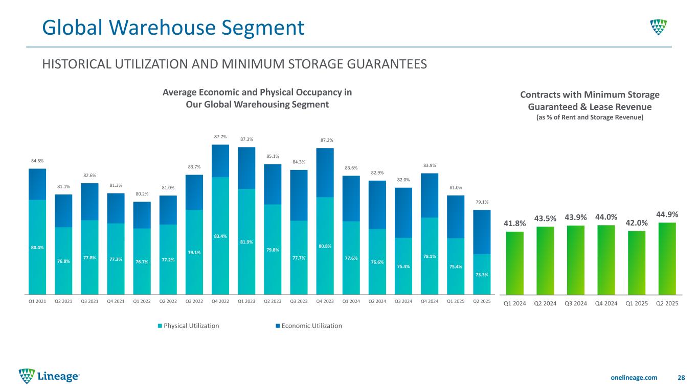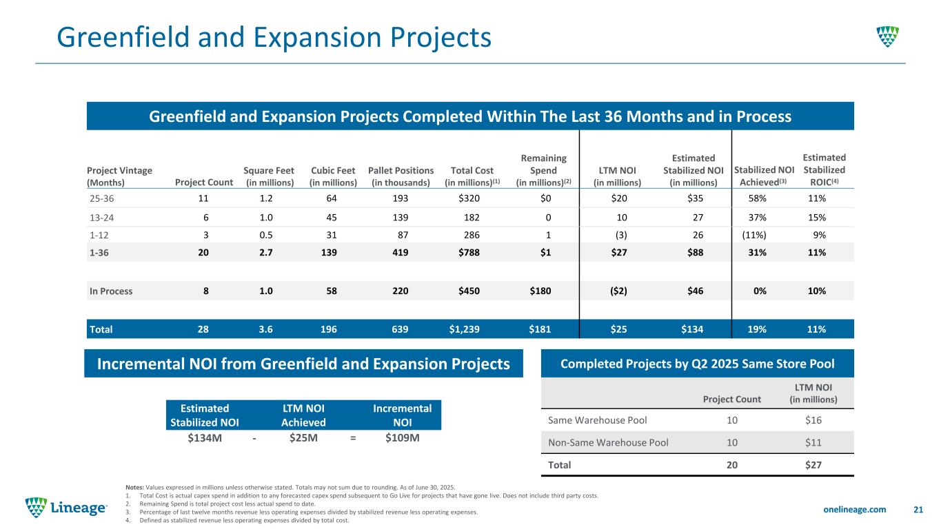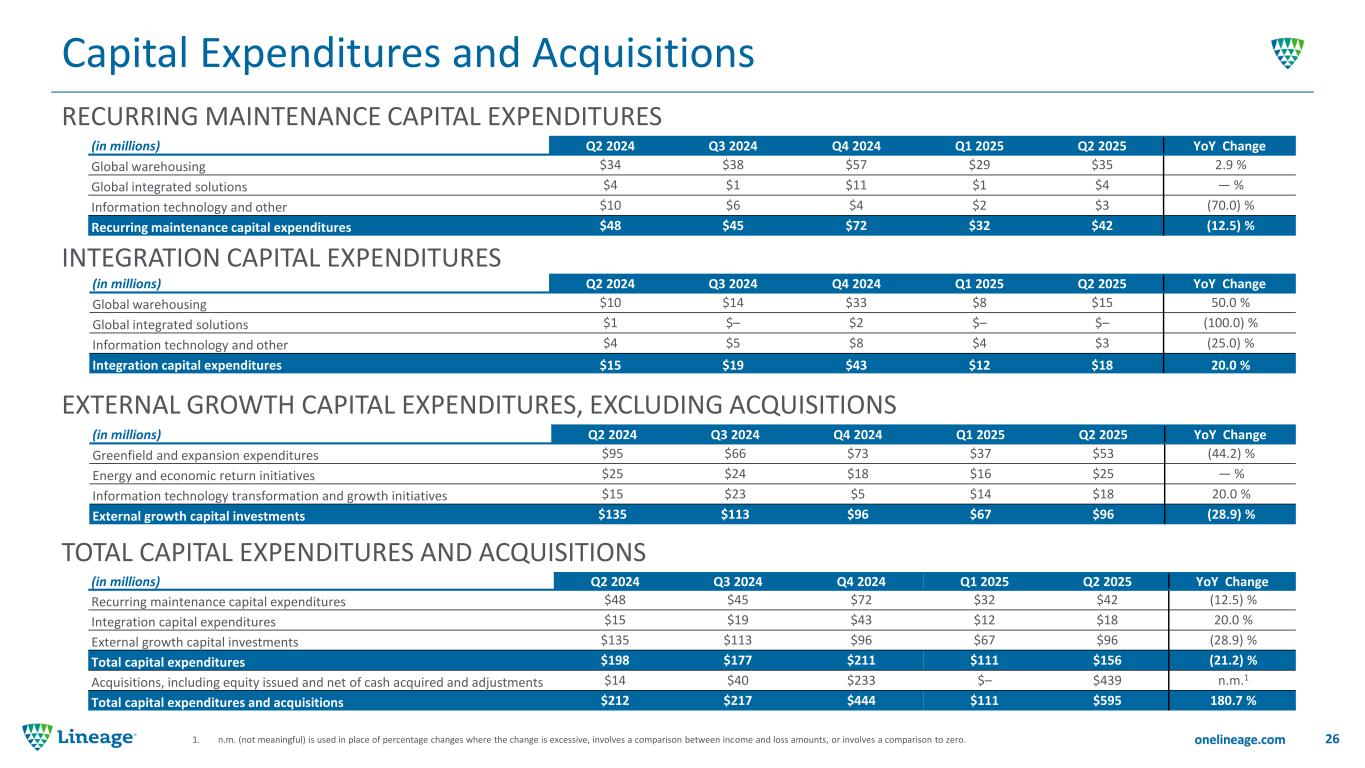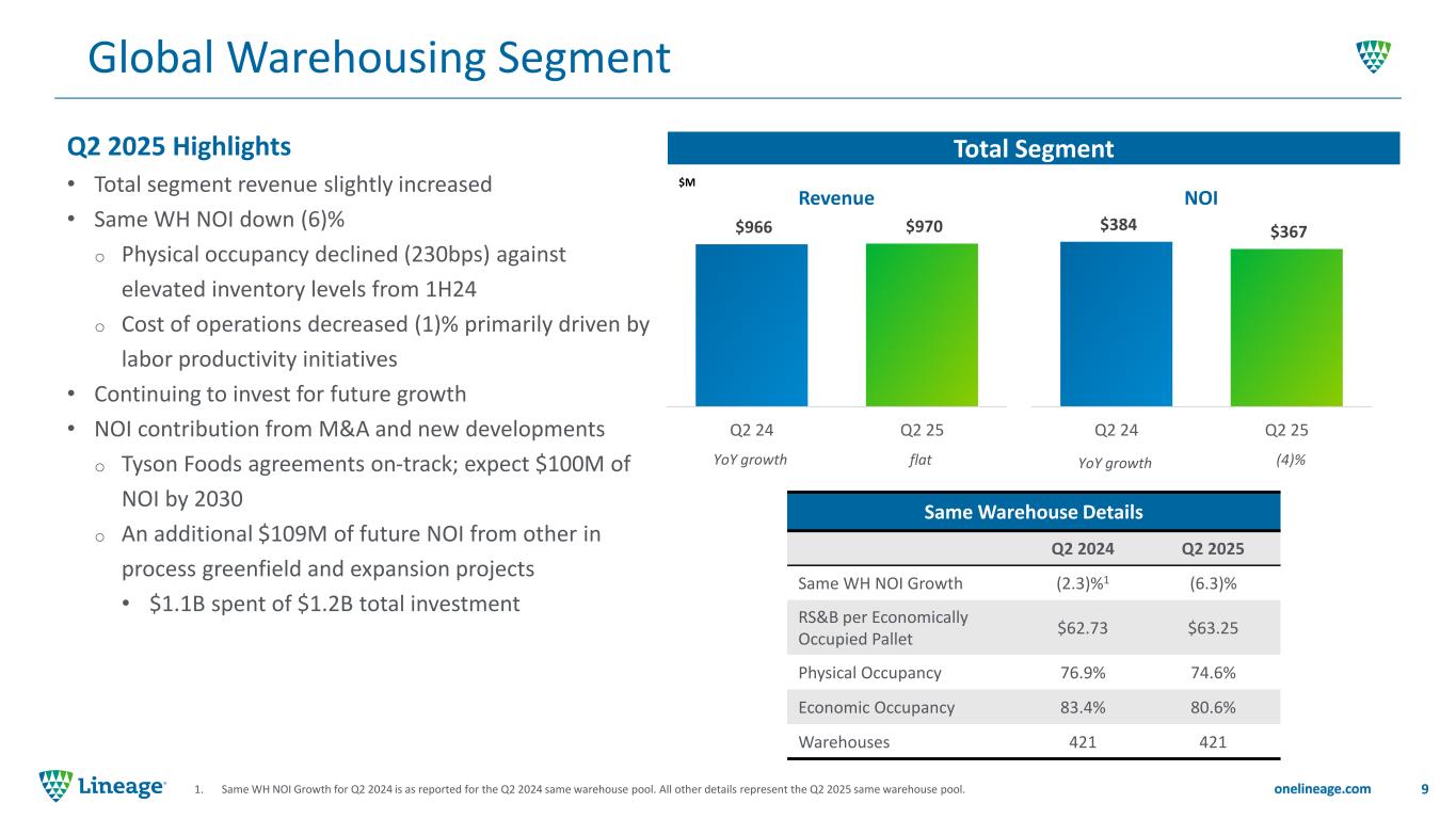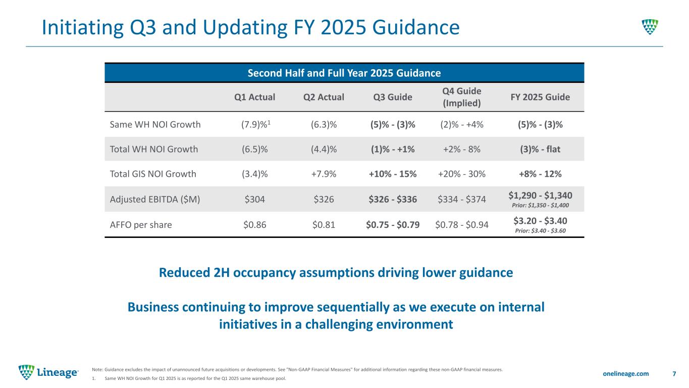 Certain statements contained in this Press Release, other than historical facts, may be considered forward-looking statements within the meaning of the Private Securities Litigation Reform Act of 1995. These forward-looking statements are based on current expectations, estimates and projections about the industry and markets in which Lineage operates, and beliefs of, and assumptions made by, the Company and involve uncertainties that could significantly affect Lineage’s financial results. Such forward-looking statements generally can be identified by the use of forward-looking terminology such as “may,” “will,” “can,” “intend,” “anticipate,” “estimate,” “believe,” “continue,” “possible,” “initiatives,” “measures,” “poised,” “focus,” “seek,” “objective,” “goal,” “vision,” “drive,” “opportunity,” “target,” “strategy,” “expect,” “plan,” “potential,” “potentially,” “preparing,” “projected,” “future,” “tomorrow,” “long-term,” “should,” “could,” “would,” “might,” “help,” “aimed”, or other similar words. You are cautioned not to place undue reliance on these forward-looking statements, which speak only as of the date of this Press Release. Such statements include, but are not limited to statements about Lineage’s plans, strategies, initiatives, and prospects and statements about its future results of operations, capital expenditures and liquidity. Such statements are subject to known and unknown risks and uncertainties, which could cause actual results to differ materially from those projected or anticipated, including, without limitation: general business and economic conditions; continued volatility and uncertainty in the credit markets and broader financial markets, including potential fluctuations in the Consumer Price Index and changes in foreign currency exchange rates; the impact of tariffs and global trade disruptions on us and our customers; other risks inherent in the real estate business, including customer defaults, potential liability related to environmental matters, illiquidity of real estate investments and potential damages from natural disasters; the availability of suitable acquisitions and our ability to acquire properties or businesses on favorable terms; our success in implementing our business strategy and our ability to identify, underwrite, finance, consummate, integrate and manage diversifying acquisitions or investments; our ability to meet budgeted or stabilized returns on our development and expansion projects within expected time frames, or at all; our ability to manage our expanded operations, including expansion into new markets or business lines; our failure to realize the intended benefits from, or disruptions to our plans and operations or unknown or contingent liabilities related to, our recent and future acquisitions and greenfield developments; our failure to successfully integrate and operate acquired or developed properties or businesses; our ability to renew significant customer contracts; the impact of supply chain disruptions, including the impact on labor availability, raw material availability, manufacturing and food production, and transportation; difficulties managing an international business and acquiring or operating properties in foreign jurisdictions and unfamiliar metropolitan areas; changes in political conditions, geopolitical turmoil, political instability, civil disturbances, restrictive governmental actions or nationalization in the countries in which we operate; the degree and nature of our competition; our failure to generate sufficient cash flows to service our outstanding indebtedness; our ability to access debt and equity capital markets; continued volatility in interest rates; increased power, labor, or construction costs; changes in consumer demand or preferences for products we store in our warehouses; decreased storage rates or increased vacancy rates; labor shortages or our inability to attract and retain talent; changes in, or the failure or inability to comply with, government regulation; a failure of our information technology systems, systems conversions and integrations, cybersecurity attacks or a breach of our information security systems, networks, or processes; our failure to maintain our status as a real estate investment trust (“REIT”) for U.S. federal income tax purposes; changes in local, state, federal, and international laws and regulations, including related to taxation, tariffs, real estate and zoning laws, and increases in real property tax rates; the impact of any financial, accounting, legal, tax or regulatory issues or litigation that may affect us, and any other risks discussed in the Company’s filings with the SEC, including our Annual Report on Form 10-K for the year ended December 31, 2024 filed with the SEC. Should one of more of the risks or uncertainties described above occur, or should underlying assumptions prove incorrect, actual results and plans could differ materially from those expressed in any forward-looking statements. Forward-looking statements in this Press Release speak only as of the date of this Press Release, and undue reliance should not be placed on such statements. We undertake no obligation to, nor do we intend to, update, or otherwise revise, any such statements that may become untrue because of subsequent events.