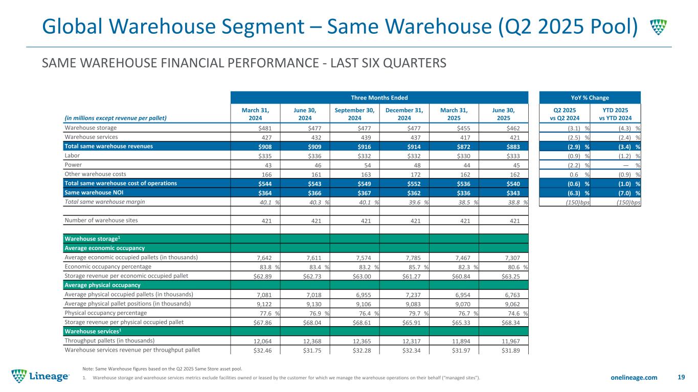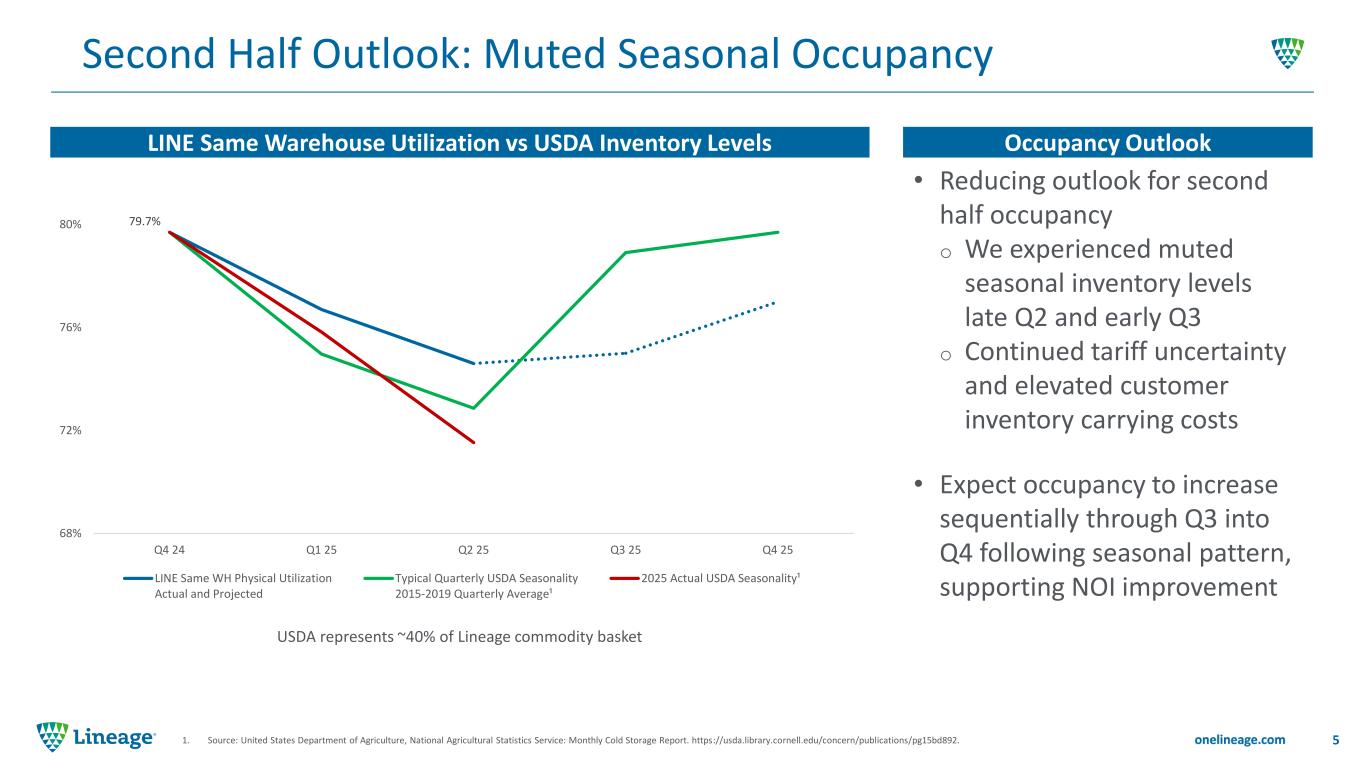 「第2四半期後半から第3四半期前半にかけて、季節的な在庫水準は低調であったため、通期の見通しを下方修正する。下期も引き続き、同一倉庫内および総 NOI の連続的な改善を見込んでいますが、通期についてはより慎重な見方をしています。私たちは引き続き、収益の拡大、労働生産性の最適化、コントロール可能要素のコントロールに重点を置き、この業界が回復した際には、強力な営業レバレッジを発揮できるようにします」とレームクールは締めくくった。