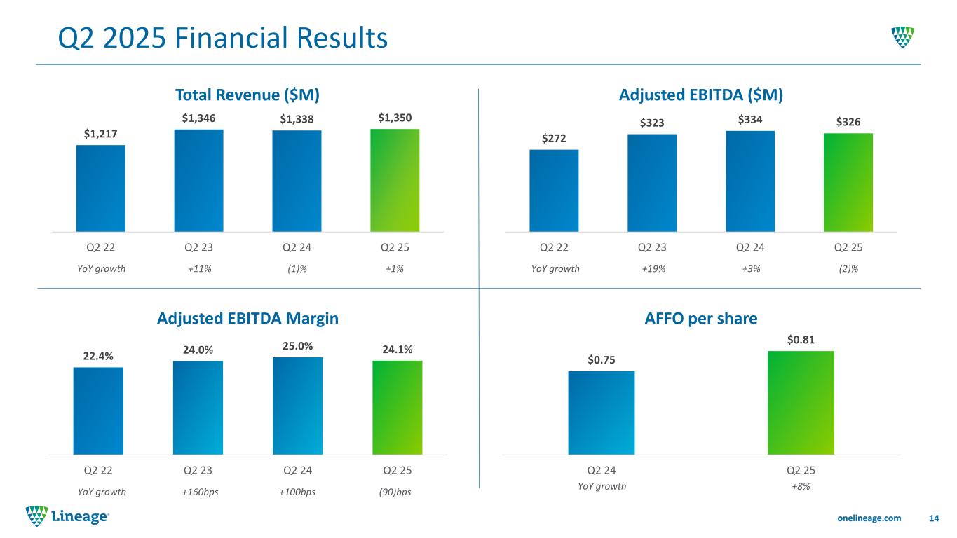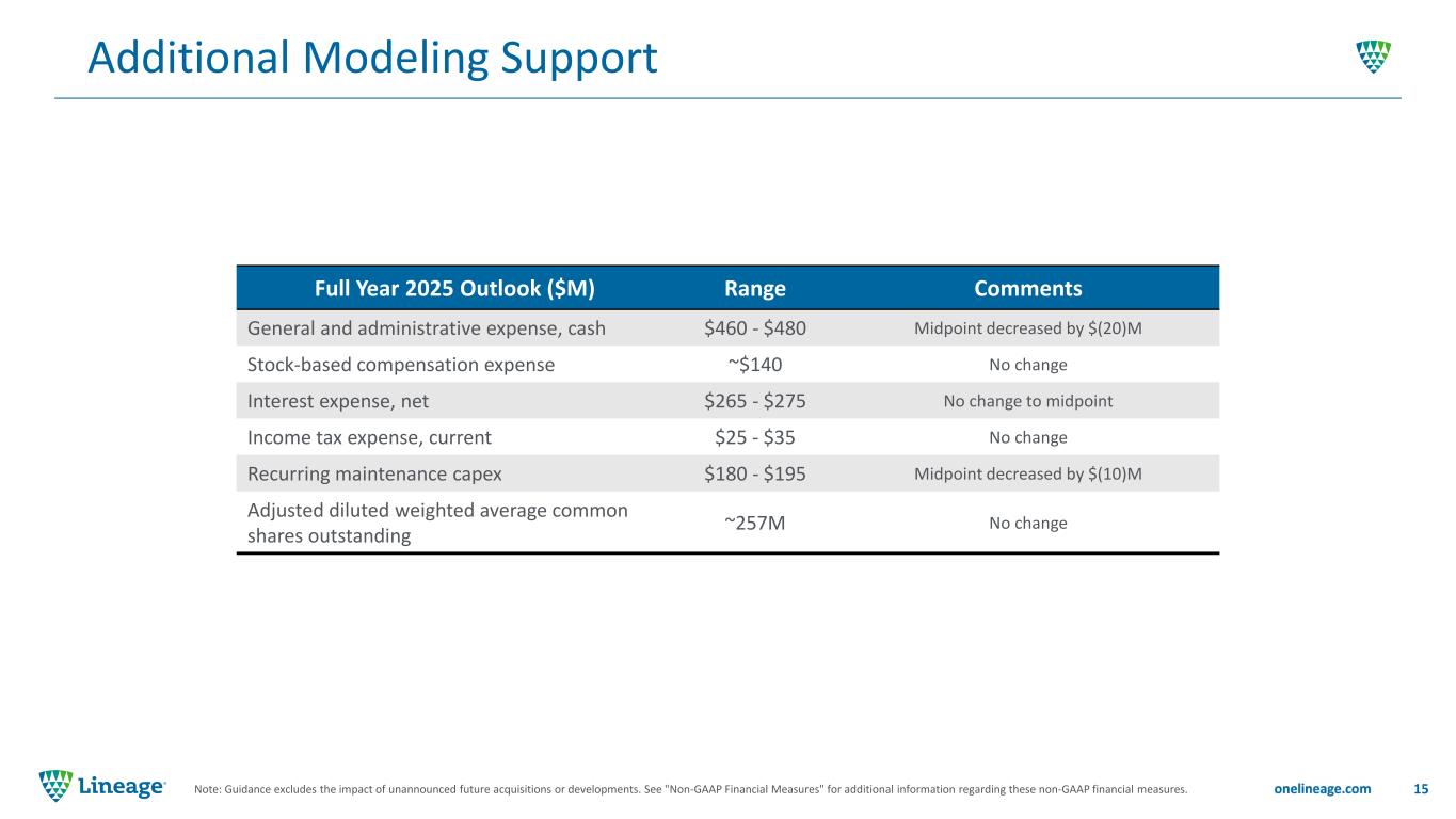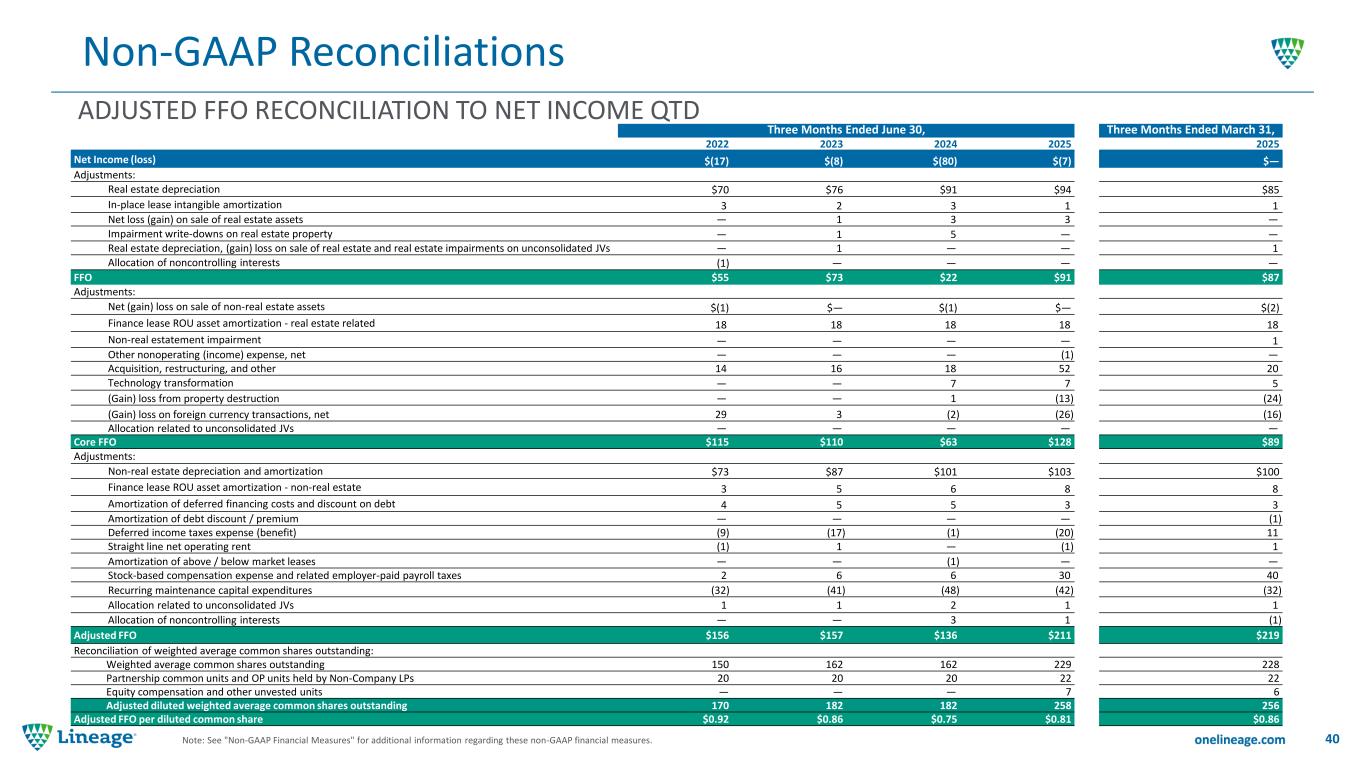 リネージュは現在、2025年度通期の調整後EBITDAを12億9,000万ドルから13億4,000万ドル(事前ガイダンスは13億5,000万ドルから14億ドル)、1株当たり調整後FFO(「AFFO」)を3.20ドルから3.40ドル(事前ガイダンスは3.40ドルから3.60ドル)と予想している。