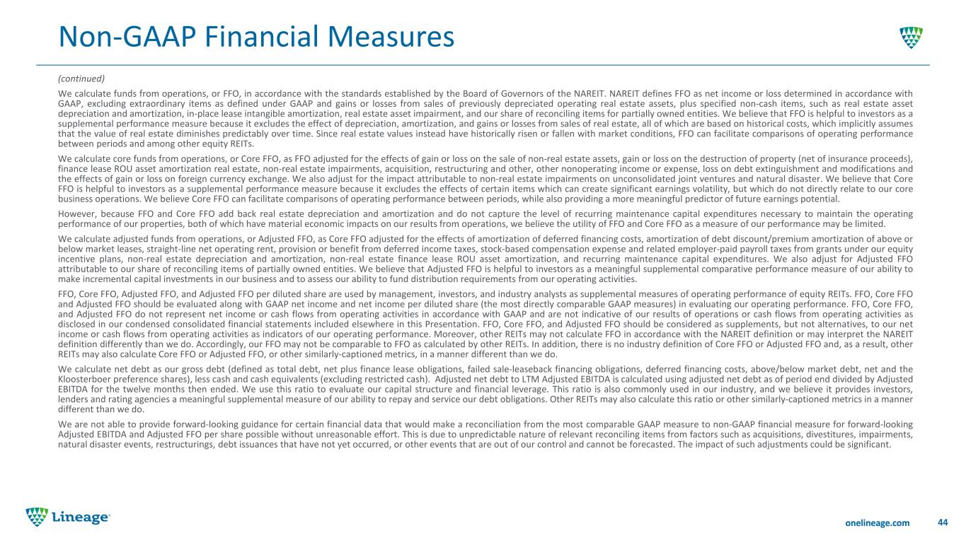 「リネージュの社長兼最高経営責任者(CEO)であるグレッグ・レームクールは、次のように述べています。「この業界にとって厳しい時期を乗り切りながら、お客様へのサービスと卓越したオペレーションに引き続き注力したことで、1株当たりAFFOの成長を達成することができました。
