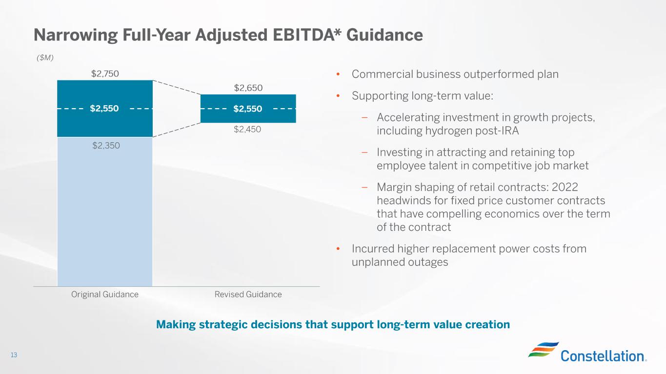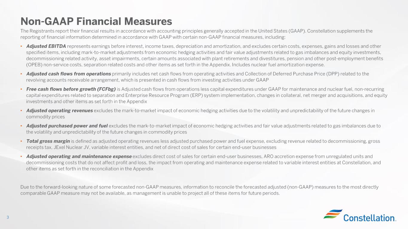 Adjusted EBITDA (non-GAAP) should not be relied upon to the exclusion of GAAP financial measures and is, by definition, an incomplete understanding of our business, and must be considered in conjunction with GAAP measures. In addition, Adjusted EBITDA (non-GAAP) is neither a standardized financial measure, nor a presentation defined under GAAP and may not be comparable to other companies’ presentations or deemed more useful than the GAAP information provided elsewhere in this press release and earnings release attachments. We have provided the non-GAAP financial measure as supplemental information and in addition to the financial measures that are calculated and presented in accordance with GAAP. Adjusted EBITDA (non-GAAP) should not be deemed more useful than, a substitute for, or an alternative to the most comparable GAAP Net Income measure provided in this earnings release and attachments. This press release and earnings release attachments provide reconciliations of Adjusted EBITDA (non-GAAP) to the most directly comparable financial measures calculated and presented in accordance with GAAP, are posted on our website: www.ConstellationEnergy.com, and have been furnished to the Securities and Exchange Commission on Form 8-K on November 8, 2022.