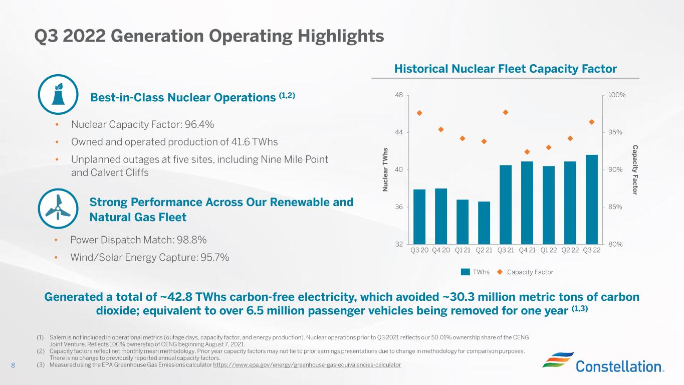 •Natural Gas, Oil, and Renewables Operations: The dispatch match rate for our gas and hydro fleet was 98.8% in the third quarter of 2022, compared with 99.4% in the third quarter of 2021. Energy capture for the wind and solar fleet was 95.7% in the third quarter of 2022, compared with 95.8% in the third quarter of 2021.