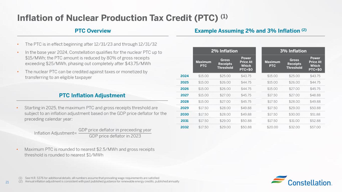 •Inflation Reduction Act Signed into Law: On Aug. 16, 2022, Congress passed and President Biden signed into law the Inflation Reduction Act of 2022, which, among other things, includes federal tax credits, certain of which are transferable or fully refundable, for clean energy technologies including existing nuclear plants and hydrogen production facilities. The Nuclear Production Tax Credit (PTC) recognizes the contributions of carbon-free nuclear power by providing a federal tax credit of up to $15/MWh, subject to phase-out, beginning in 2024 and continuing through 2032. The Hydrogen PTC provides a 10-year federal tax credit of up to $3/kilogram for clean hydrogen produced after 2022 from facilities that begin construction prior to 2033. Both the Nuclear and Hydrogen PTCs include adjustments for inflation. The Hydrogen PTC creates additional opportunities for our nuclear fleet to enable decarbonization of other industries through the production of clean hydrogen. With this policy support, we expect that many of our nuclear assets will operate through the end of the Nuclear PTC period.