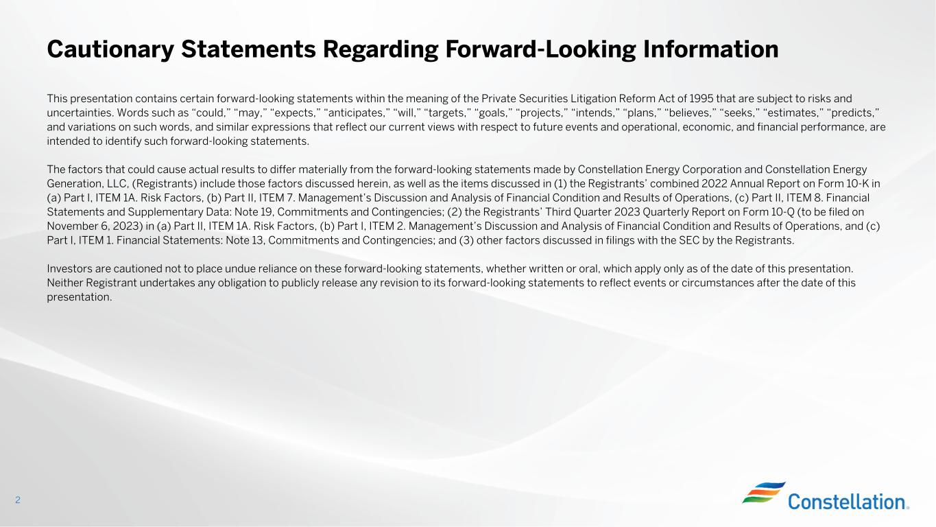 コンステレーション・エナジー・コーポレーションおよびコンステレーション・エナジー・ジェネレーションLLC(登録企業)が行った将来の見通しに関する記述と実際の結果が大きく異なる可能性のある要因には、本書に記載されている要因のほか、(1)登録企業の2022年フォーム10-K年次報告書の(a)パートI、ITEM 1A.リスク要因、(b) パートII、ITEM 7.財政状態および経営成績に関する経営陣の検討および分析、および(c)パートII、ITEM 8.財務諸表および補足データ」:注記19「コミットメントおよび偶発債務」、(2)登録者のフォーム10-Qによる2023年第3四半期報告書(2023年11月6日提出予定)の(a)パートII、ITEM1A.リスク要因、(b)パートI、ITEM 2.経営者による財政状態および経営成績の検討および分析、ならびに(c)パート I、ITEM 1.財務諸表」:注記13「コミットメントおよび偶発債務」、および(3)登録企業がSECに提出した書類に記載されているその他の要因。