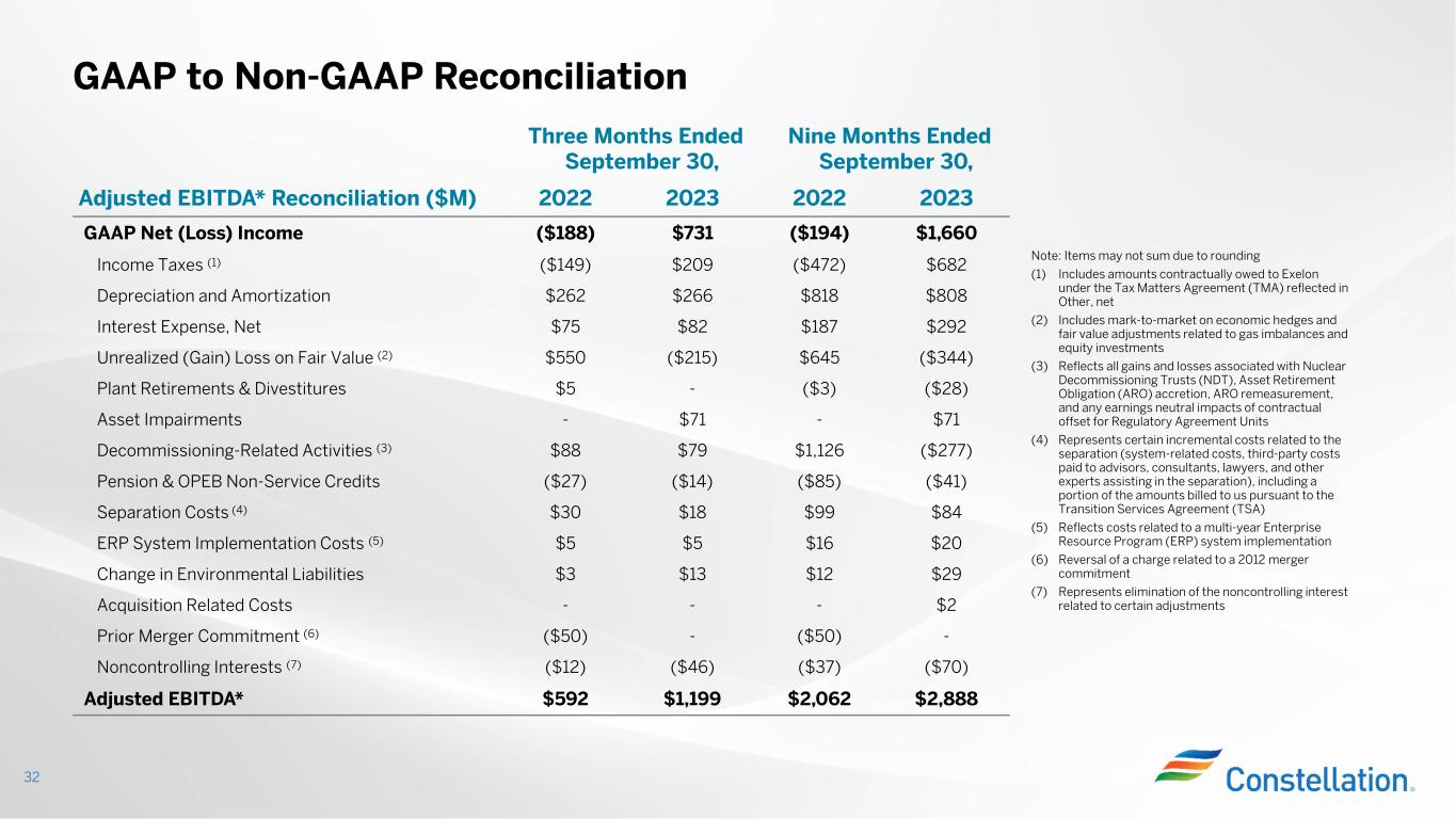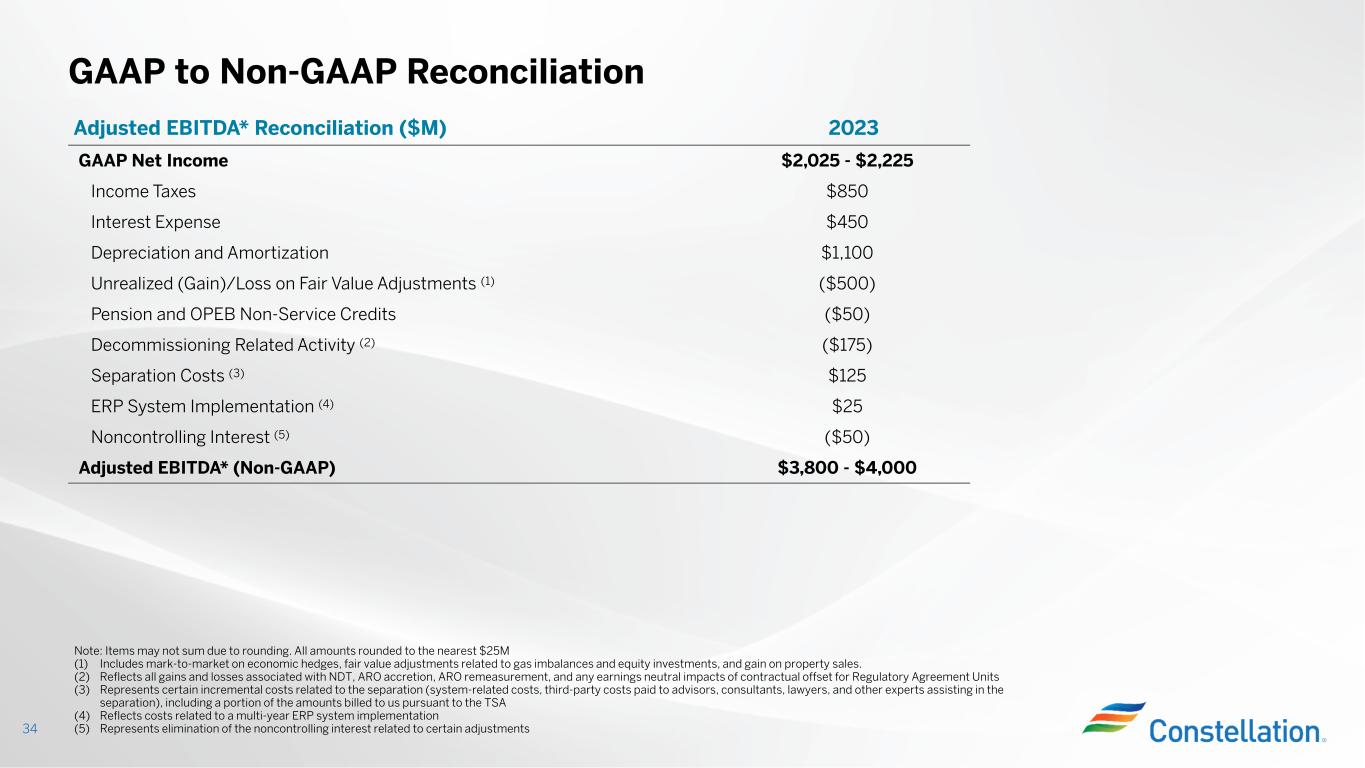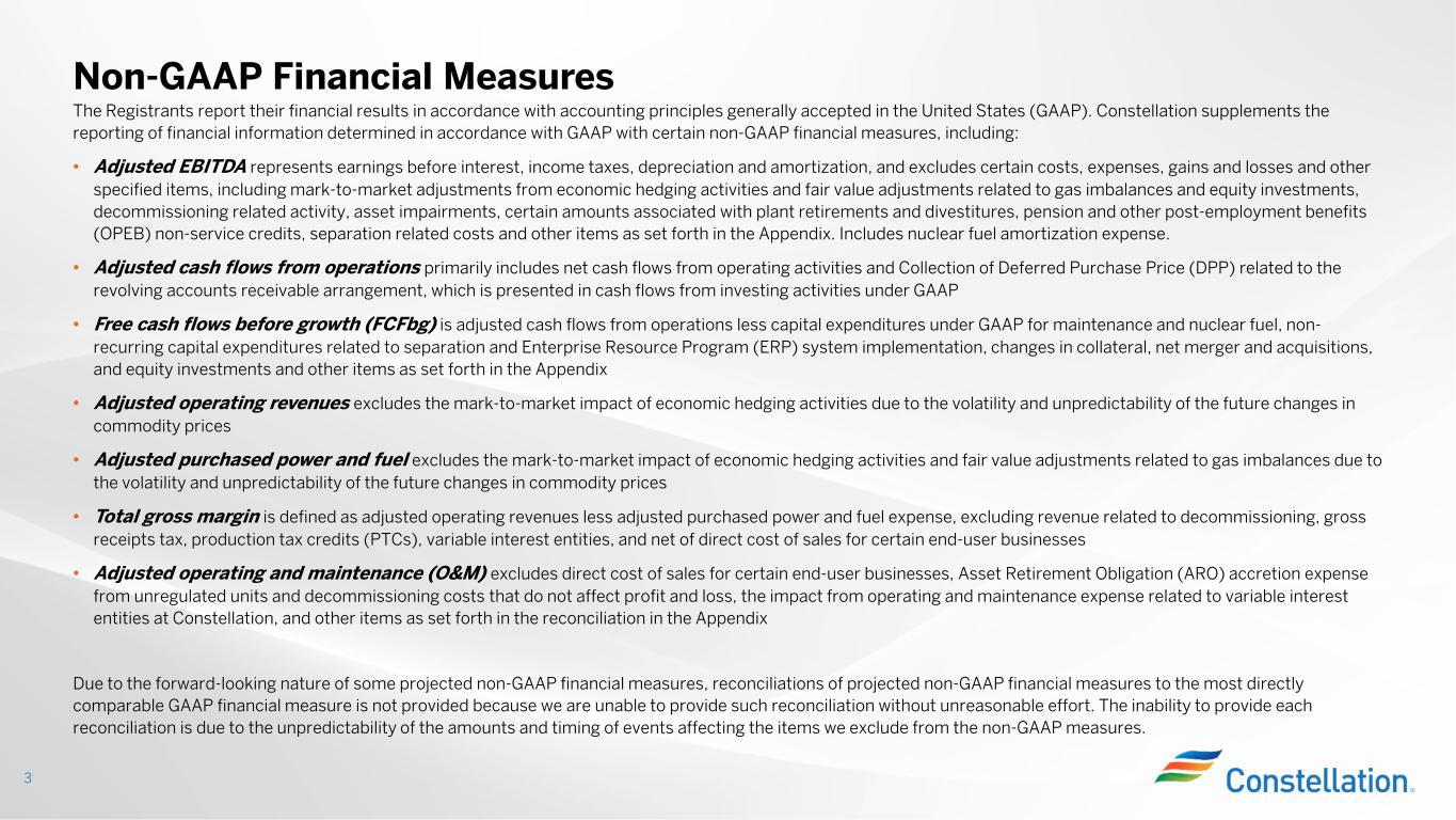 また、調整後EBITDA(非GAAP)は標準化された財務指標でも、GAAPで定義された表示でもなく、他社の表示と比較できない可能性があり、本プレスリリースおよび決算発表添付資料の他の箇所で提供されるGAAP情報よりも有用であるとみなされない可能性があります。当社は非GAAP財務指標を補足情報として、またGAAPに準拠して算出・表示される財務指標に加えて提供しています。調整後EBITDA(非GAAP基準)は、本決算発表および添付資料に記載されている最も比較可能なGAAP基準の純利益指標よりも有用である、またはその代替とみなされるべきではありません。将来予測に基づく非GAAP財務指標である調整後EBITDAの、最も直接的に比較可能なGAAP財務指標への調整は、不合理な努力なしにそのような調整を提供することができないため、提供していません。各調整を提供できないのは、非GAAP指標から除外する項目に影響を与える事象の金額や時期が予測できないためです。本プレスリリースおよび決算発表添付資料では、調整後EBITDA(非GAAPベース)とGAAPに準拠して算出・表示された最も直接的に比較可能な財務指標との調整表を提供しており、当社ウェブサイト(www.ConstellationEnergy.com)に掲載されています。また、2023年11月6日にForm 8-Kにて米国証券取引委員会に提出済みです。