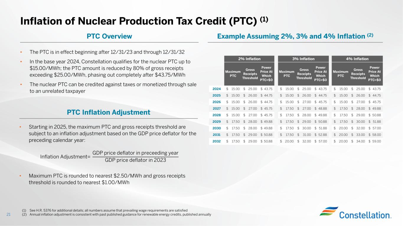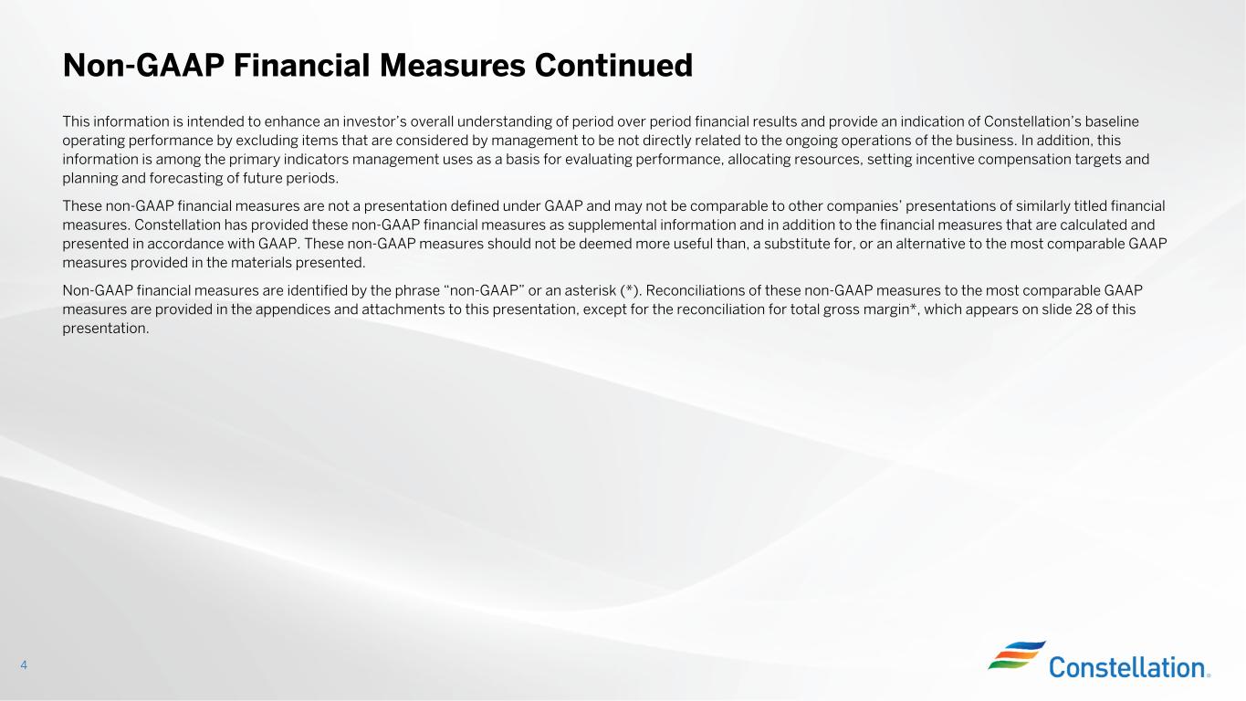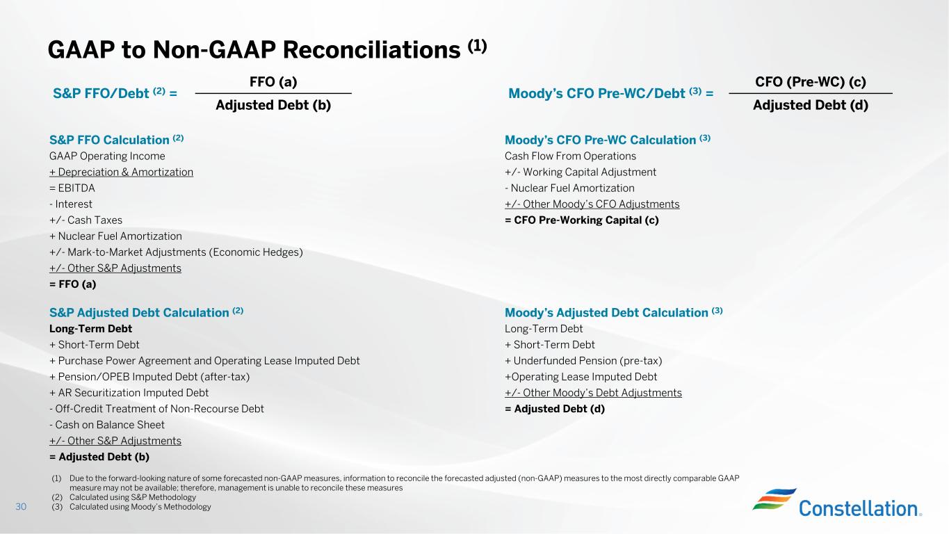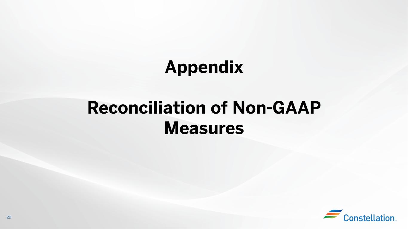 また、調整後EBITDA(非GAAP)は標準化された財務指標でも、GAAPで定義された表示でもなく、他社の表示と比較できない可能性があり、本プレスリリースおよび決算発表添付資料の他の箇所で提供されるGAAP情報よりも有用であるとみなされない可能性があります。当社は非GAAP財務指標を補足情報として、またGAAPに準拠して算出・表示される財務指標に加えて提供しています。調整後EBITDA(非GAAP基準)は、本決算発表および添付資料に記載されている最も比較可能なGAAP基準の純利益指標よりも有用である、またはその代替とみなされるべきではありません。将来予測に基づく非GAAP財務指標である調整後EBITDAの、最も直接的に比較可能なGAAP財務指標への調整は、不合理な努力なしにそのような調整を提供することができないため、提供していません。各調整を提供できないのは、非GAAP指標から除外する項目に影響を与える事象の金額や時期が予測できないためです。本プレスリリースおよび決算発表添付資料では、調整後EBITDA(非GAAPベース)とGAAPに準拠して算出・表示された最も直接的に比較可能な財務指標との調整表を提供しており、当社ウェブサイト(www.ConstellationEnergy.com)に掲載されています。また、2023年11月6日にForm 8-Kにて米国証券取引委員会に提出済みです。