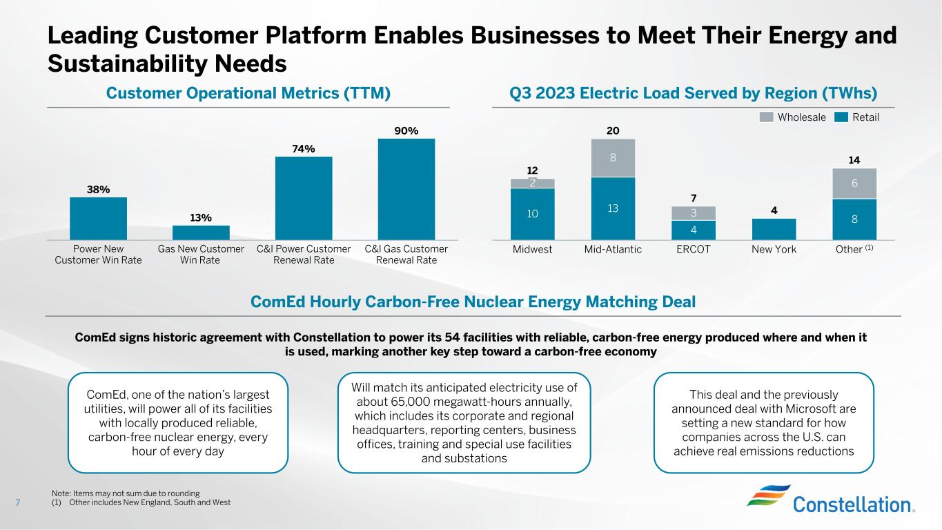 -大手電力会社のカーボン・フリー・エネルギー・マッチング契約:当社は、コモンウェルス・エジソン社(ComEd社)と、同社の54の計量施設に、毎日毎時、地元で生産されたカーボン・フリー原子力エネルギーで電力を供給するという歴史的な契約を締結した。ComEd社による1時間ごとのカーボンフリー・エネルギー購入は、年間約6万5,000メガワットアワーと予想される電力使用量に匹敵する。この契約は、2023年第2四半期に発表された、コンステレーション社とマイクロソフト社との同様の契約に続くもので、同社のヴァージニア・データセンターの1つに、ほぼ100パーセント炭素を排出しない原子力エネルギーを供給する。この2つの取引により、全米の企業が実質的な排出削減を達成するための新たな基準が確立されることになる。
