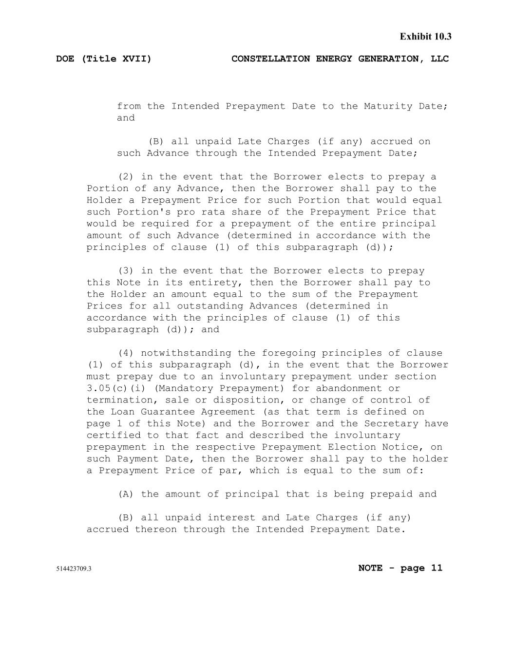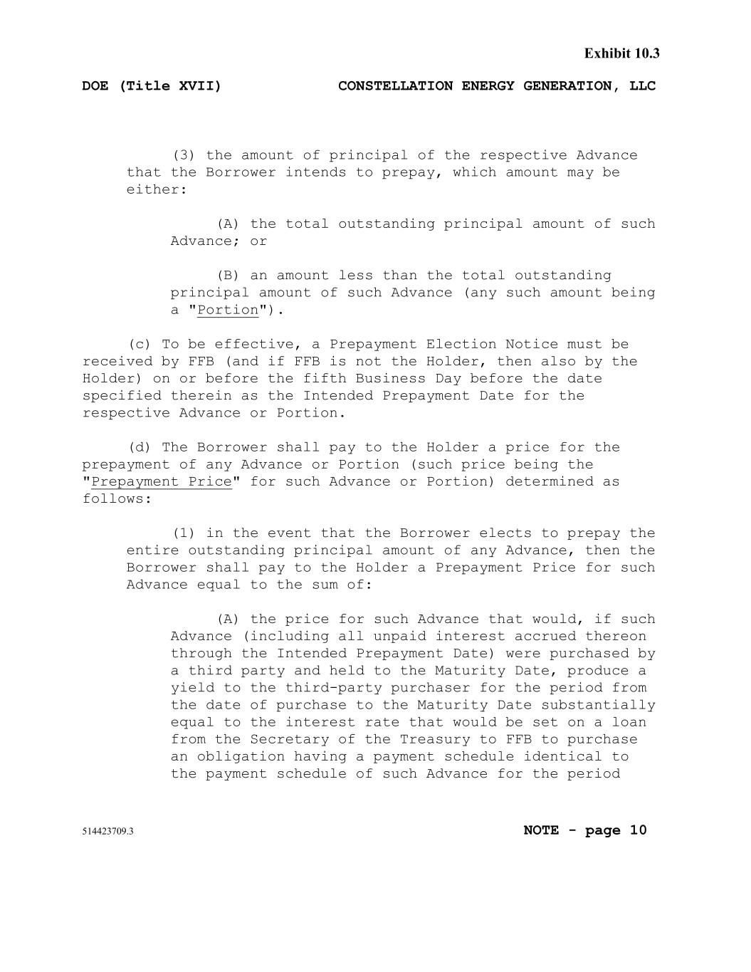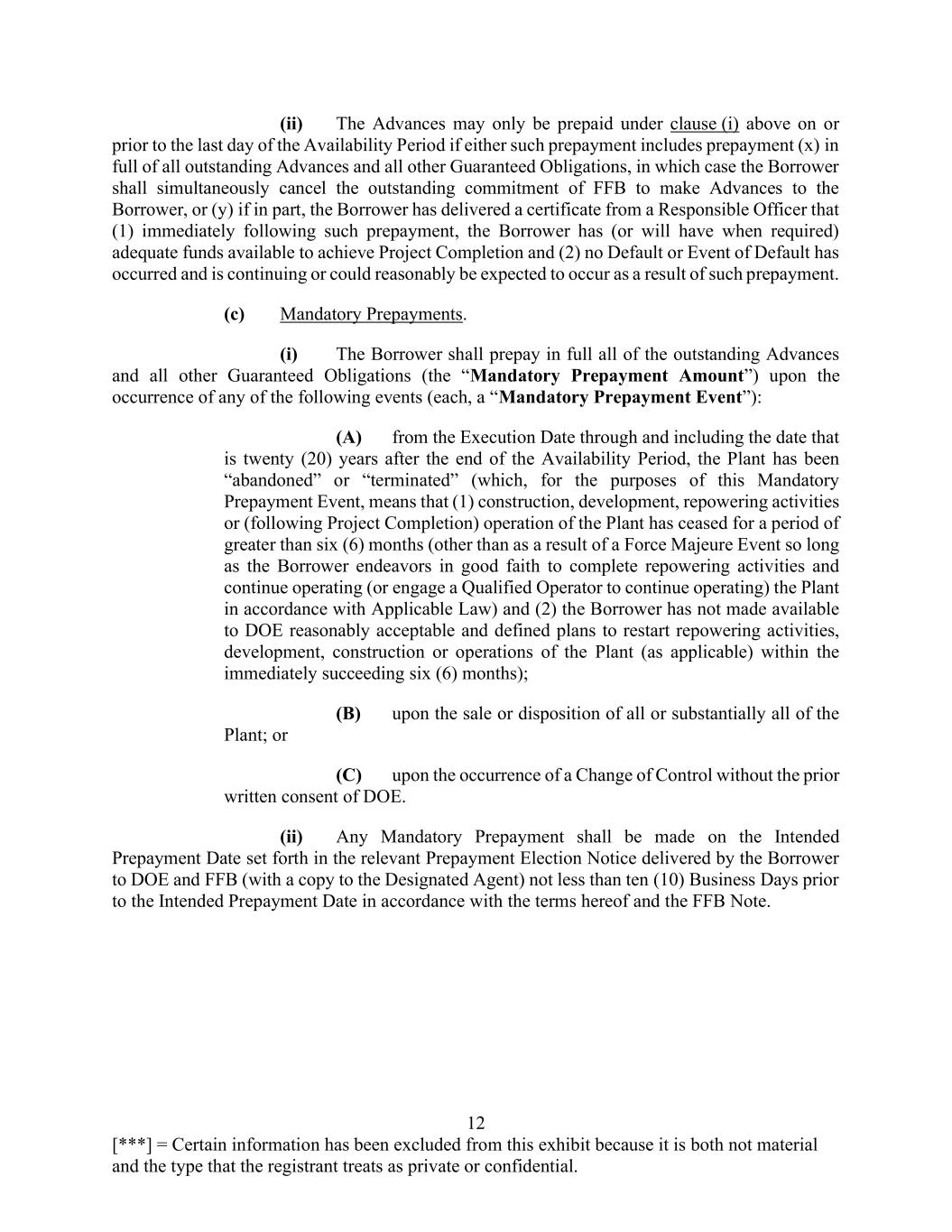 11 [***] = Certain information has been excluded from this exhibit because it is both not material and the type that the registrant treats as private or confidential. Section 3.05 Prepayments. (a) Terms of All Prepayments. (i) With respect to any prepayment of any Advance, whether such prepayment is voluntary or mandatory, including a prepayment upon acceleration, the Borrower shall comply with all applicable terms and provisions of this Agreement and the FFB Documents. (ii) All prepayments of the FFB Note shall be (A) applied to Advances as specified in the relevant Prepayment Election Notice; (B) due in an amount equal to the Prepayment Price calculated by FFB in accordance with the terms of the FFB Note; and (C) applied in the inverse order of maturity among the outstanding principal amounts of the Advances specified in such Prepayment Election Notice, or as otherwise specified by the FFB Note or by DOE (and agreed by the Borrower). (iii) The Borrower may not re-borrow the principal amount of any Advance that is repaid or prepaid, nor shall any such repayment or prepayment create availability for further borrowings during the Availability Period. (iv) Simultaneously with all prepayments of the Advances, whether voluntary or mandatory, the Borrower shall pay all accrued interest and other fees, costs, expenses and other Guaranteed Obligations then outstanding under the Financing Documents. Any prepayments of the Advances under the Guaranteed Loan in full shall require payment in full of all other Guaranteed Obligations. (v) If the Borrower shall fail to make a prepayment to FFB on any Intended Prepayment Date in accordance with this Agreement and the FFB Note, the Borrower shall pay FFB a Late Charge on any Overdue Amount from such Intended Prepayment Date to the date on which payment is made, computed in accordance with the provisions of the FFB Note. (vi) In the event of any prepayment in full of all outstanding Advances under the Guaranteed Loan pursuant to this Section 3.05 (Prepayments), the remaining Guaranteed Loan Commitment Amount shall be deemed to be reduced to zero Dollars ($0), unless otherwise agreed to by DOE. (vii) The Borrower must submit a Prepayment Election Notice for any prepayment of the FFB Note. Each Prepayment Election Notice submitted must state if the prepayment is voluntary or mandatory. (b) Voluntary Prepayments. (i) Subject to clause (ii) below, the Borrower may at any time and from time to time prepay all or any portion of the outstanding principal amount of any Advance under the FFB Note, upon prior submission of a Prepayment Election Notice by the Borrower to DOE and FFB (with a copy to the Designated Agent) not less than ten (10) Business Days prior to the Intended Prepayment Date in accordance with the terms hereof and the FFB Note.