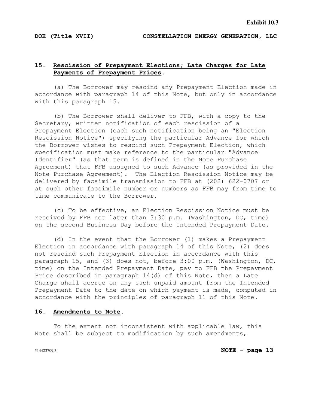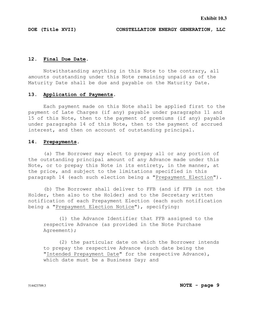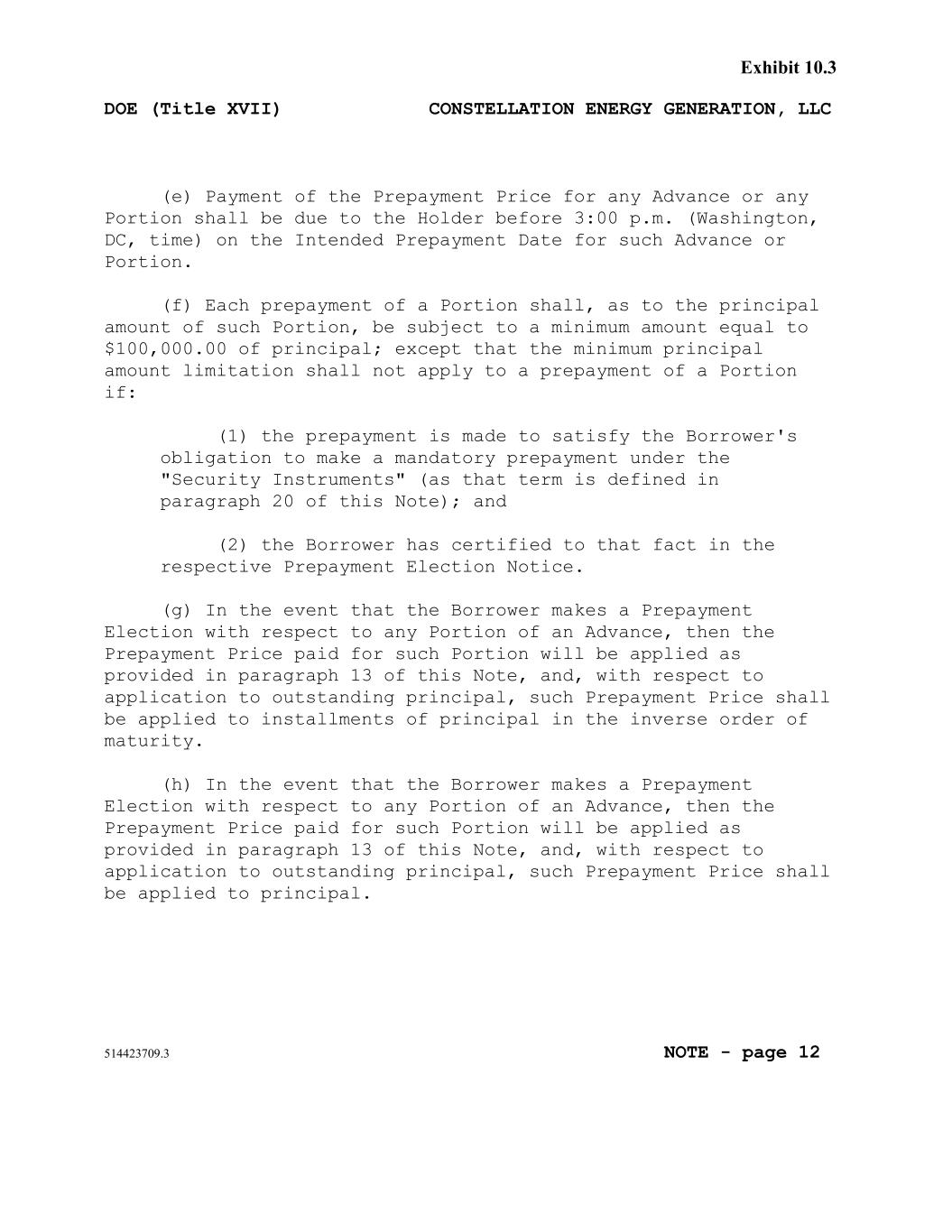 11 [***] = Certain information has been excluded from this exhibit because it is both not material and the type that the registrant treats as private or confidential. Section 3.05 Prepayments. (a) Terms of All Prepayments. (i) With respect to any prepayment of any Advance, whether such prepayment is voluntary or mandatory, including a prepayment upon acceleration, the Borrower shall comply with all applicable terms and provisions of this Agreement and the FFB Documents. (ii) All prepayments of the FFB Note shall be (A) applied to Advances as specified in the relevant Prepayment Election Notice; (B) due in an amount equal to the Prepayment Price calculated by FFB in accordance with the terms of the FFB Note; and (C) applied in the inverse order of maturity among the outstanding principal amounts of the Advances specified in such Prepayment Election Notice, or as otherwise specified by the FFB Note or by DOE (and agreed by the Borrower). (iii) The Borrower may not re-borrow the principal amount of any Advance that is repaid or prepaid, nor shall any such repayment or prepayment create availability for further borrowings during the Availability Period. (iv) Simultaneously with all prepayments of the Advances, whether voluntary or mandatory, the Borrower shall pay all accrued interest and other fees, costs, expenses and other Guaranteed Obligations then outstanding under the Financing Documents. Any prepayments of the Advances under the Guaranteed Loan in full shall require payment in full of all other Guaranteed Obligations. (v) If the Borrower shall fail to make a prepayment to FFB on any Intended Prepayment Date in accordance with this Agreement and the FFB Note, the Borrower shall pay FFB a Late Charge on any Overdue Amount from such Intended Prepayment Date to the date on which payment is made, computed in accordance with the provisions of the FFB Note. (vi) In the event of any prepayment in full of all outstanding Advances under the Guaranteed Loan pursuant to this Section 3.05 (Prepayments), the remaining Guaranteed Loan Commitment Amount shall be deemed to be reduced to zero Dollars ($0), unless otherwise agreed to by DOE. (vii) The Borrower must submit a Prepayment Election Notice for any prepayment of the FFB Note. Each Prepayment Election Notice submitted must state if the prepayment is voluntary or mandatory. (b) Voluntary Prepayments. (i) Subject to clause (ii) below, the Borrower may at any time and from time to time prepay all or any portion of the outstanding principal amount of any Advance under the FFB Note, upon prior submission of a Prepayment Election Notice by the Borrower to DOE and FFB (with a copy to the Designated Agent) not less than ten (10) Business Days prior to the Intended Prepayment Date in accordance with the terms hereof and the FFB Note.