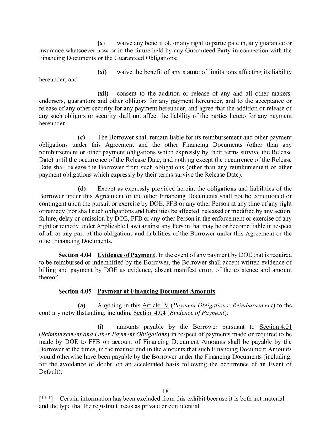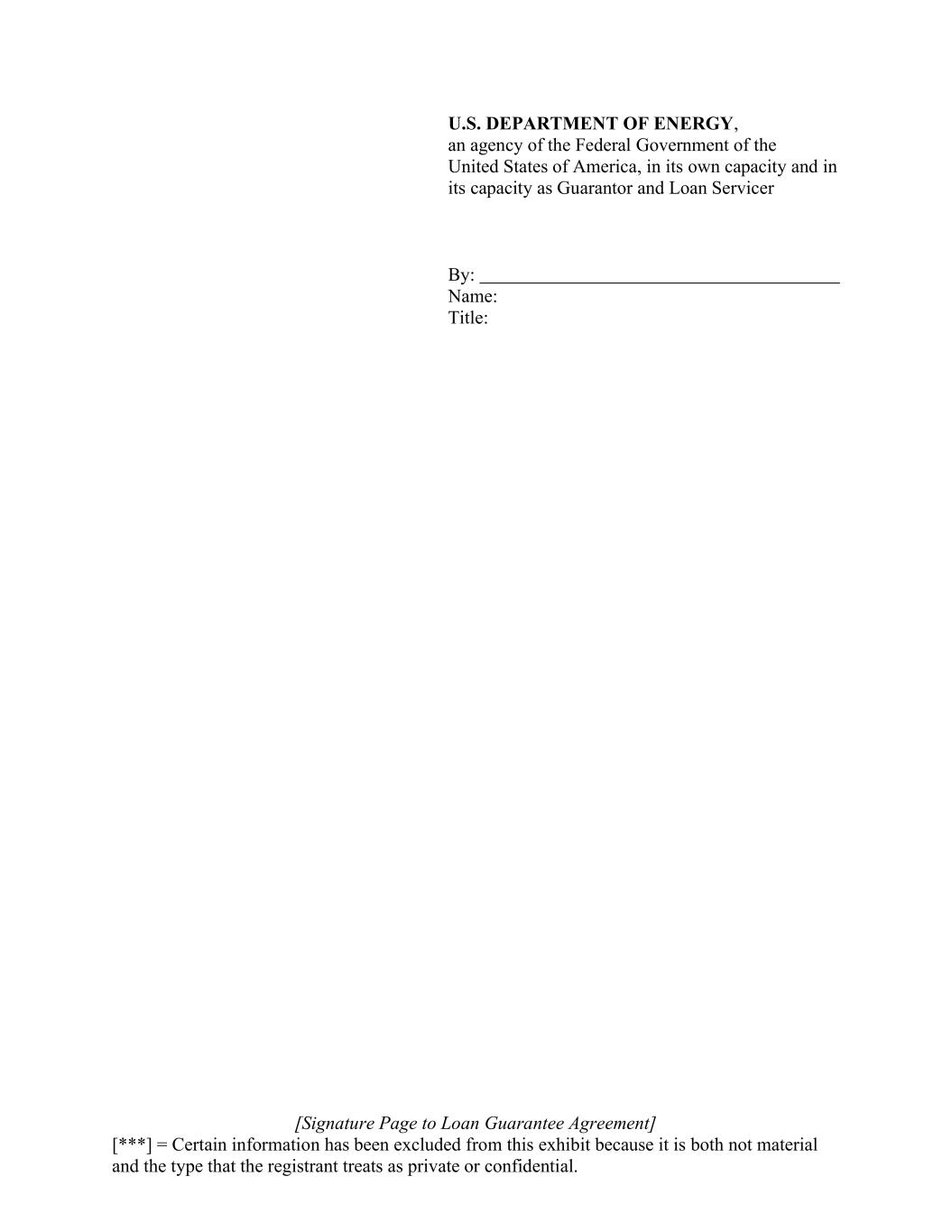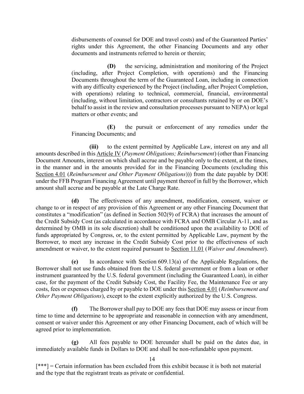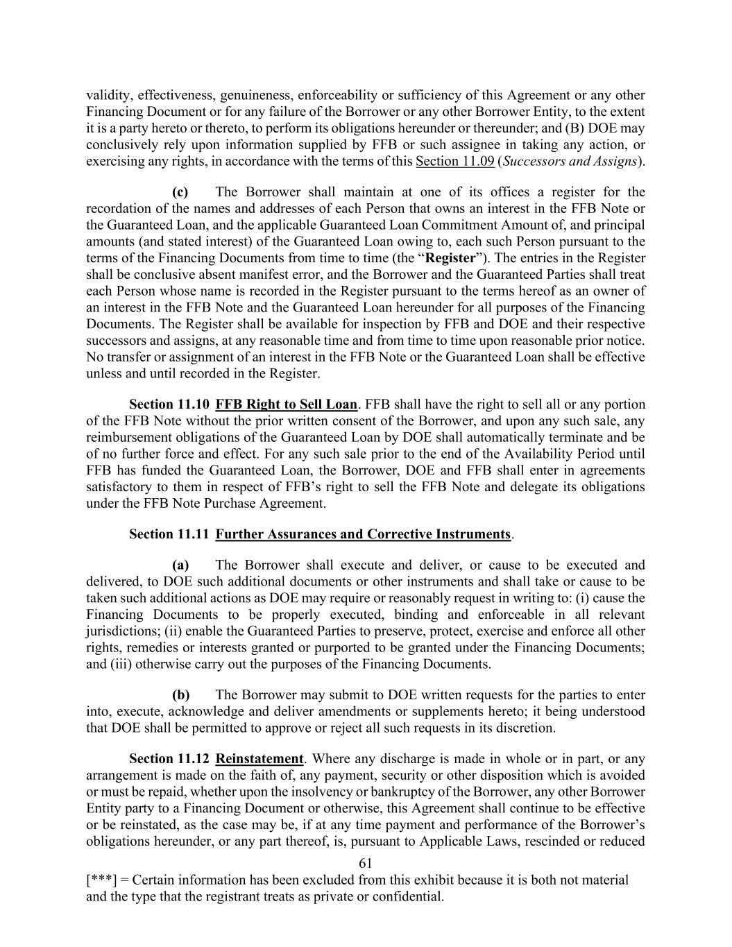 9 [***] = Certain information has been excluded from this exhibit because it is both not material and the type that the registrant treats as private or confidential. ARTICLE III PAYMENTS; PREPAYMENTS Section 3.01 Place and Manner of Payments. (a) All payments due under the FFB Note shall be made by the Borrower to FFB pursuant to the terms of the FFB Documents. (b) All payments to be made to DOE under this Agreement shall be sent by the Borrower in Dollars in immediately available funds before 1:00 p.m. (District of Columbia time) on the date when due to the account specified pursuant to Section 4.01(h) (Reimbursement and Other Payment Obligations). (c) Except as otherwise expressly provided herein, in the event that the date of any payment to DOE or the expiration of any time period hereunder occurs on a day that is not a Business Day, then such payment or expiration of time period shall be made or occur on the next succeeding Business Day, and such extension of time shall in such cases be included in computing interest or fees, if any, in connection with such payment. (d) The Borrower understands and agrees that DOE and FFB are agencies or instrumentalities of the United States, with FFB being wholly-owned, and that all payments to be made by the Borrower to DOE or FFB (and not paid for the account or benefit of, or otherwise required to be paid to, any other Person) hereunder or under the Financing Documents are payable, and shall in all cases be paid, free and clear of all Taxes. To the extent the Borrower is required to make a payment to or for the account or benefit of a Person other than DOE or FFB pursuant to Section 4.01 (Reimbursement and Other Payment Obligations) or otherwise under a Financing Document or the Designated Agency Agreement (including any payment of Guaranteed Party Expenses to a Guaranteed Party Advisor or any payment of principal or interest to any assignee or transferee of DOE or FFB), at the Borrower’s request, DOE shall request such Person to provide to the Borrower (at least one (1) Business Day prior to the due date of such payment) a valid, properly completed and executed IRS Form W-9 (or successor form) establishing that payments to such Person are not subject to U.S. backup withholding. The Borrower shall be entitled to withhold Taxes from any such payment to the extent required by applicable law (without any obligation to gross-up or indemnify for such Taxes) and shall timely remit any amount so withheld to the applicable Governmental Authority. Each Person that provides an IRS Form W-9 to the Borrower hereunder agrees, by delivering such form, that if any such form it previously delivered expires or becomes obsolete or inaccurate in any respect, it shall update such form or promptly notify the Borrower in writing of its legal inability to do so. Section 3.02 Maturity and Amortization. (a) Final Maturity Date. The Borrower shall repay the outstanding Guaranteed Loan in full on the Final Maturity Date. (b) Payments. The FFB Note shall (i) provide that each Advance thereunder shall be due and payable on the Final Maturity Date; and (ii) provide for the payment of interest