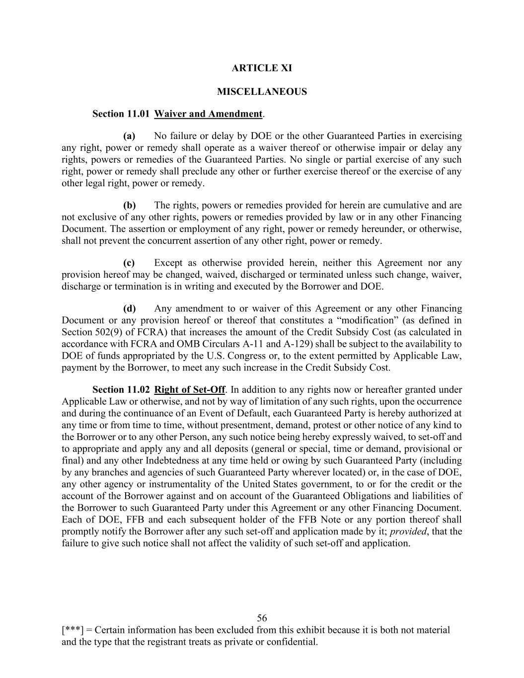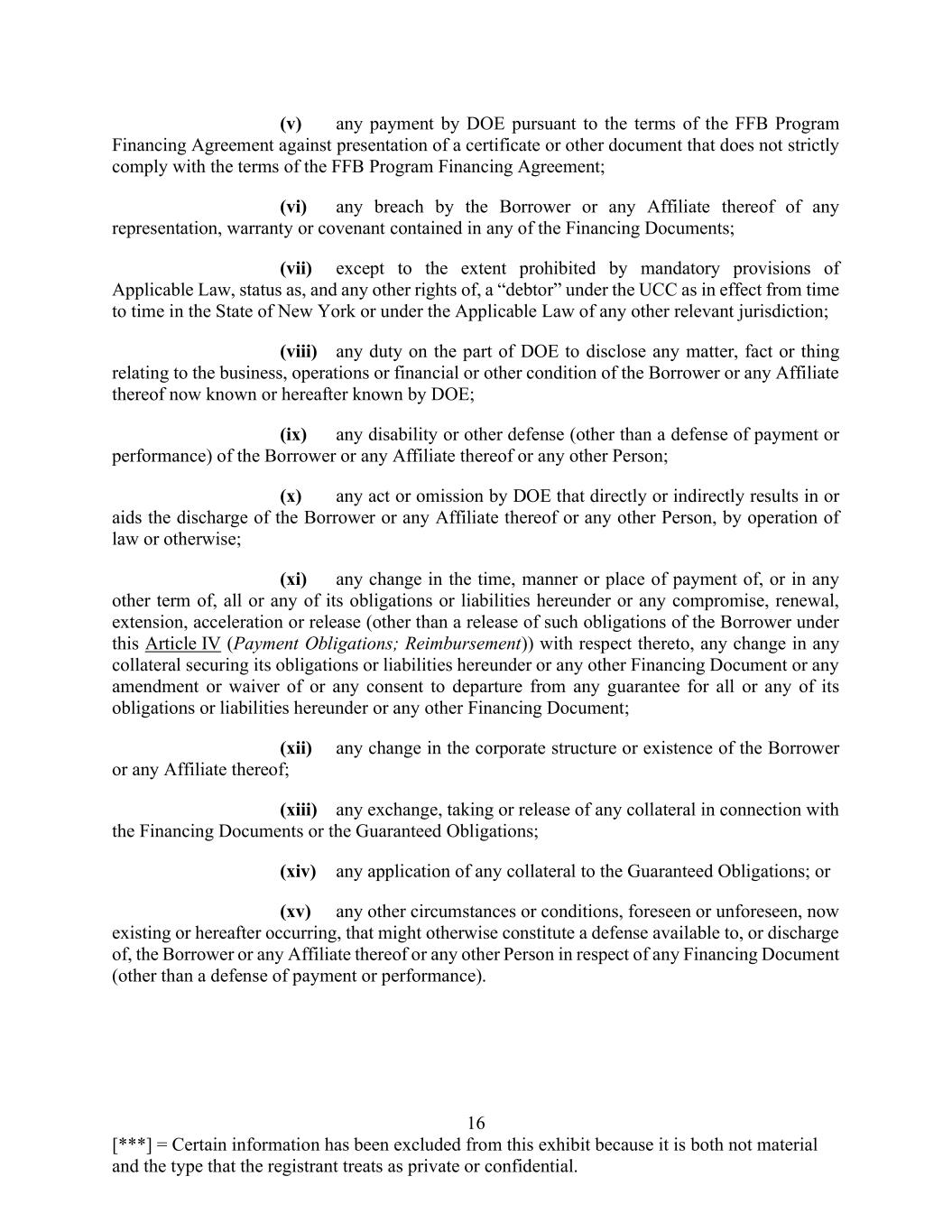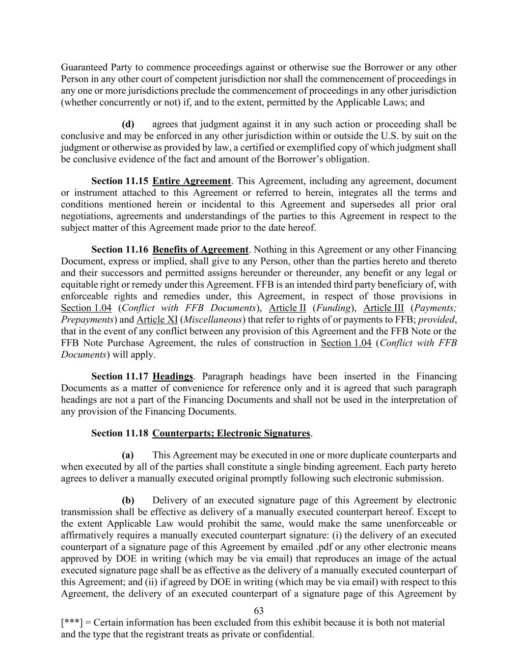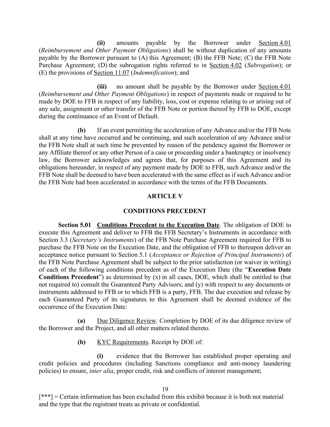 9 [***] = Certain information has been excluded from this exhibit because it is both not material and the type that the registrant treats as private or confidential. ARTICLE III PAYMENTS; PREPAYMENTS Section 3.01 Place and Manner of Payments. (a) All payments due under the FFB Note shall be made by the Borrower to FFB pursuant to the terms of the FFB Documents. (b) All payments to be made to DOE under this Agreement shall be sent by the Borrower in Dollars in immediately available funds before 1:00 p.m. (District of Columbia time) on the date when due to the account specified pursuant to Section 4.01(h) (Reimbursement and Other Payment Obligations). (c) Except as otherwise expressly provided herein, in the event that the date of any payment to DOE or the expiration of any time period hereunder occurs on a day that is not a Business Day, then such payment or expiration of time period shall be made or occur on the next succeeding Business Day, and such extension of time shall in such cases be included in computing interest or fees, if any, in connection with such payment. (d) The Borrower understands and agrees that DOE and FFB are agencies or instrumentalities of the United States, with FFB being wholly-owned, and that all payments to be made by the Borrower to DOE or FFB (and not paid for the account or benefit of, or otherwise required to be paid to, any other Person) hereunder or under the Financing Documents are payable, and shall in all cases be paid, free and clear of all Taxes. To the extent the Borrower is required to make a payment to or for the account or benefit of a Person other than DOE or FFB pursuant to Section 4.01 (Reimbursement and Other Payment Obligations) or otherwise under a Financing Document or the Designated Agency Agreement (including any payment of Guaranteed Party Expenses to a Guaranteed Party Advisor or any payment of principal or interest to any assignee or transferee of DOE or FFB), at the Borrower’s request, DOE shall request such Person to provide to the Borrower (at least one (1) Business Day prior to the due date of such payment) a valid, properly completed and executed IRS Form W-9 (or successor form) establishing that payments to such Person are not subject to U.S. backup withholding. The Borrower shall be entitled to withhold Taxes from any such payment to the extent required by applicable law (without any obligation to gross-up or indemnify for such Taxes) and shall timely remit any amount so withheld to the applicable Governmental Authority. Each Person that provides an IRS Form W-9 to the Borrower hereunder agrees, by delivering such form, that if any such form it previously delivered expires or becomes obsolete or inaccurate in any respect, it shall update such form or promptly notify the Borrower in writing of its legal inability to do so. Section 3.02 Maturity and Amortization. (a) Final Maturity Date. The Borrower shall repay the outstanding Guaranteed Loan in full on the Final Maturity Date. (b) Payments. The FFB Note shall (i) provide that each Advance thereunder shall be due and payable on the Final Maturity Date; and (ii) provide for the payment of interest