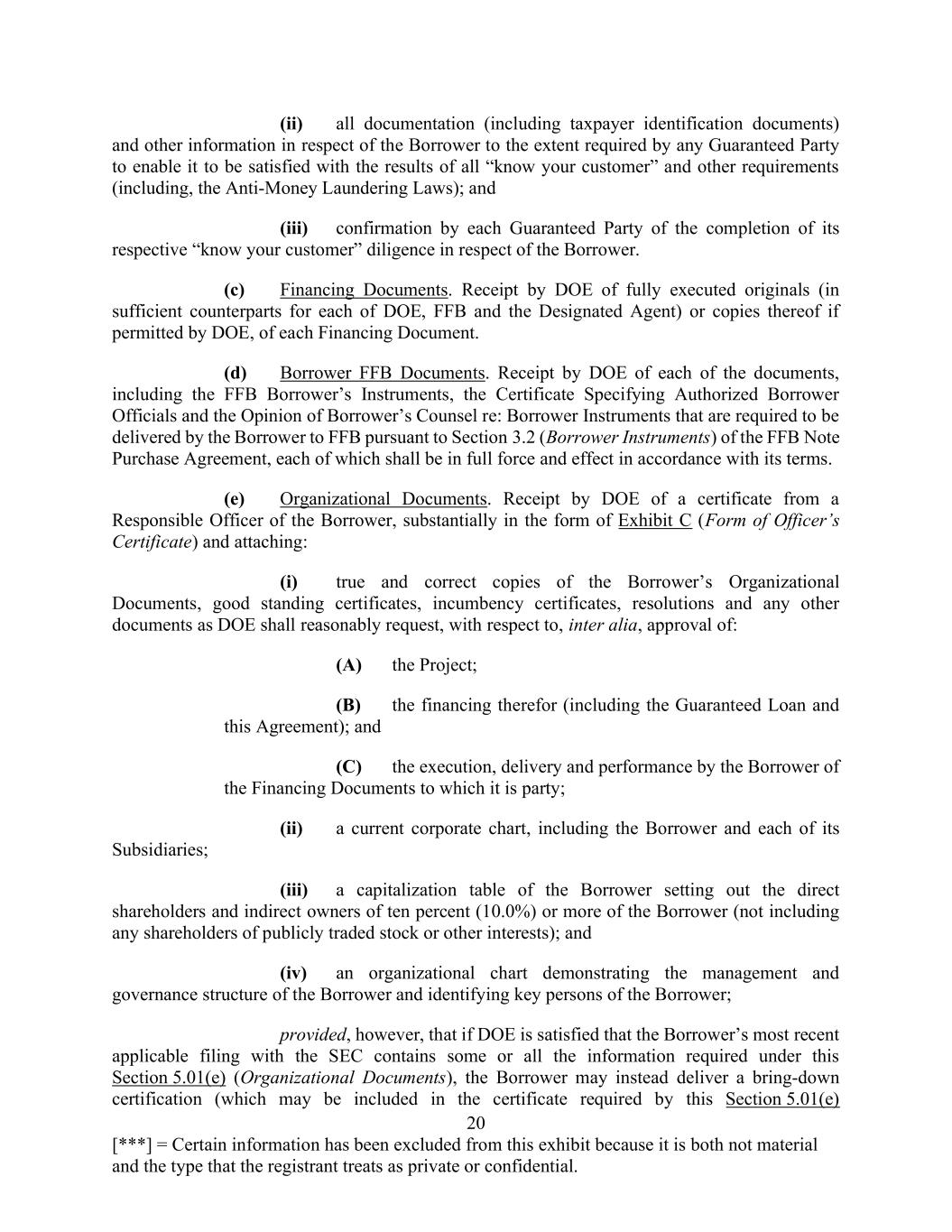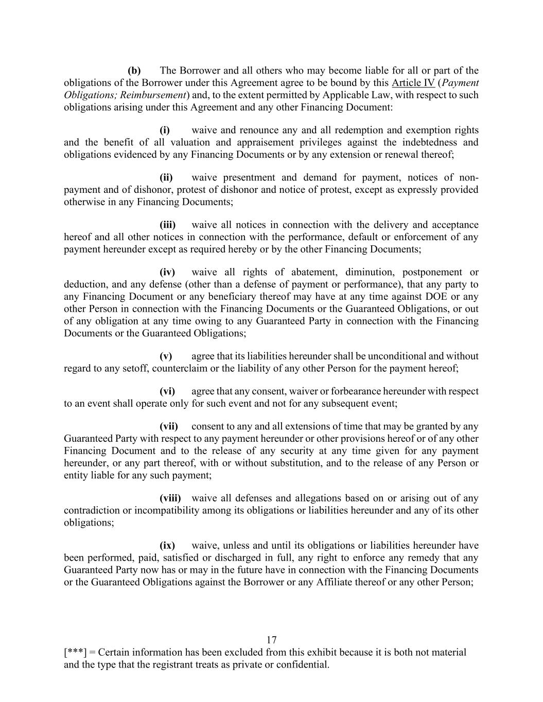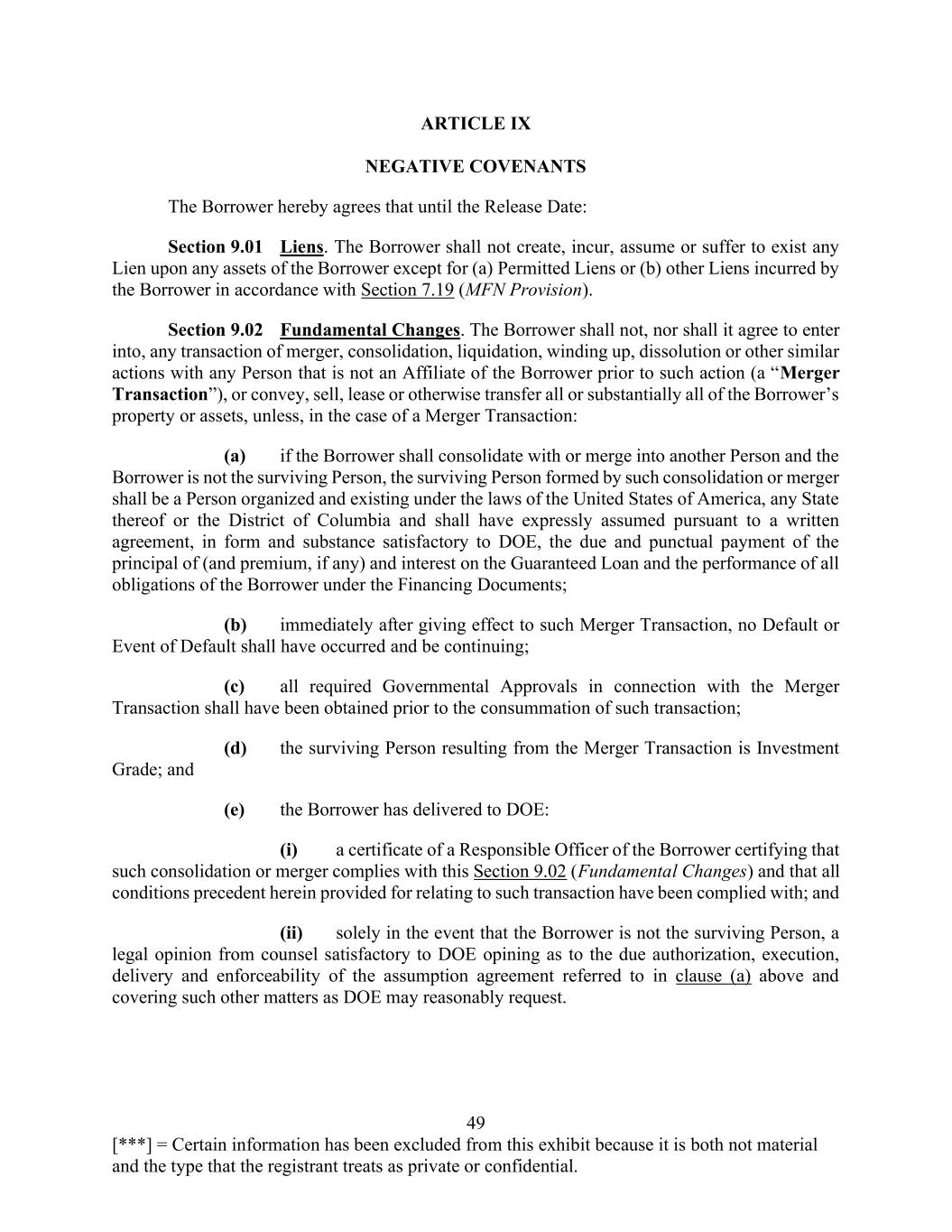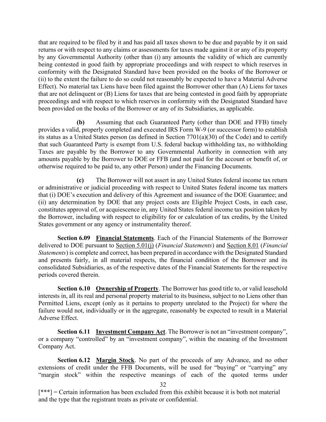 9 [***] = Certain information has been excluded from this exhibit because it is both not material and the type that the registrant treats as private or confidential. ARTICLE III PAYMENTS; PREPAYMENTS Section 3.01 Place and Manner of Payments. (a) All payments due under the FFB Note shall be made by the Borrower to FFB pursuant to the terms of the FFB Documents. (b) All payments to be made to DOE under this Agreement shall be sent by the Borrower in Dollars in immediately available funds before 1:00 p.m. (District of Columbia time) on the date when due to the account specified pursuant to Section 4.01(h) (Reimbursement and Other Payment Obligations). (c) Except as otherwise expressly provided herein, in the event that the date of any payment to DOE or the expiration of any time period hereunder occurs on a day that is not a Business Day, then such payment or expiration of time period shall be made or occur on the next succeeding Business Day, and such extension of time shall in such cases be included in computing interest or fees, if any, in connection with such payment. (d) The Borrower understands and agrees that DOE and FFB are agencies or instrumentalities of the United States, with FFB being wholly-owned, and that all payments to be made by the Borrower to DOE or FFB (and not paid for the account or benefit of, or otherwise required to be paid to, any other Person) hereunder or under the Financing Documents are payable, and shall in all cases be paid, free and clear of all Taxes. To the extent the Borrower is required to make a payment to or for the account or benefit of a Person other than DOE or FFB pursuant to Section 4.01 (Reimbursement and Other Payment Obligations) or otherwise under a Financing Document or the Designated Agency Agreement (including any payment of Guaranteed Party Expenses to a Guaranteed Party Advisor or any payment of principal or interest to any assignee or transferee of DOE or FFB), at the Borrower’s request, DOE shall request such Person to provide to the Borrower (at least one (1) Business Day prior to the due date of such payment) a valid, properly completed and executed IRS Form W-9 (or successor form) establishing that payments to such Person are not subject to U.S. backup withholding. The Borrower shall be entitled to withhold Taxes from any such payment to the extent required by applicable law (without any obligation to gross-up or indemnify for such Taxes) and shall timely remit any amount so withheld to the applicable Governmental Authority. Each Person that provides an IRS Form W-9 to the Borrower hereunder agrees, by delivering such form, that if any such form it previously delivered expires or becomes obsolete or inaccurate in any respect, it shall update such form or promptly notify the Borrower in writing of its legal inability to do so. Section 3.02 Maturity and Amortization. (a) Final Maturity Date. The Borrower shall repay the outstanding Guaranteed Loan in full on the Final Maturity Date. (b) Payments. The FFB Note shall (i) provide that each Advance thereunder shall be due and payable on the Final Maturity Date; and (ii) provide for the payment of interest