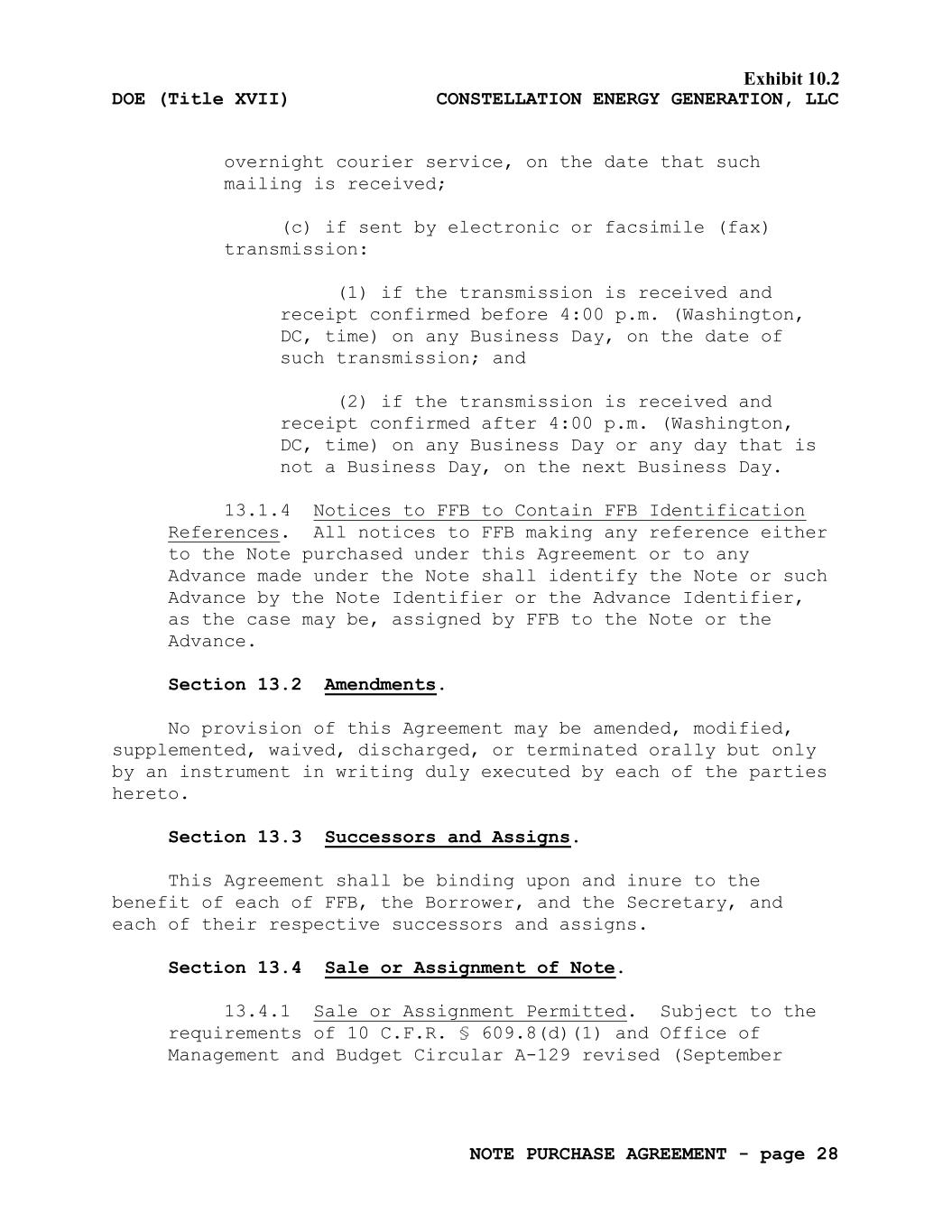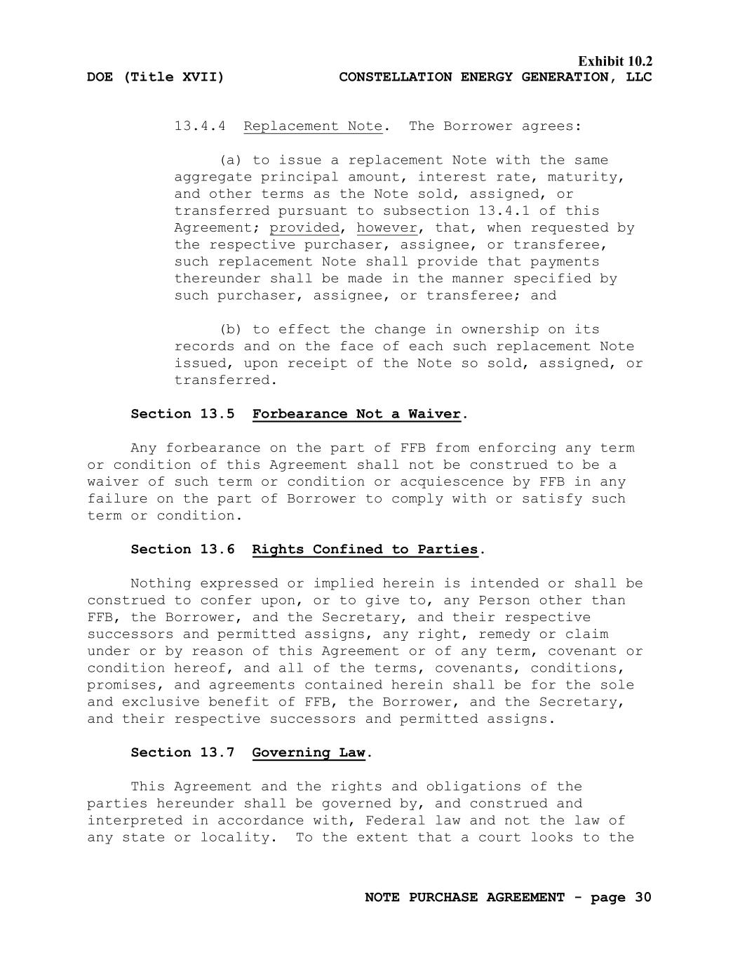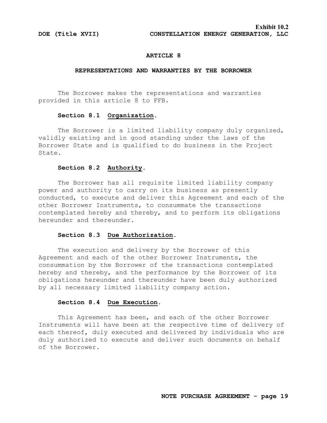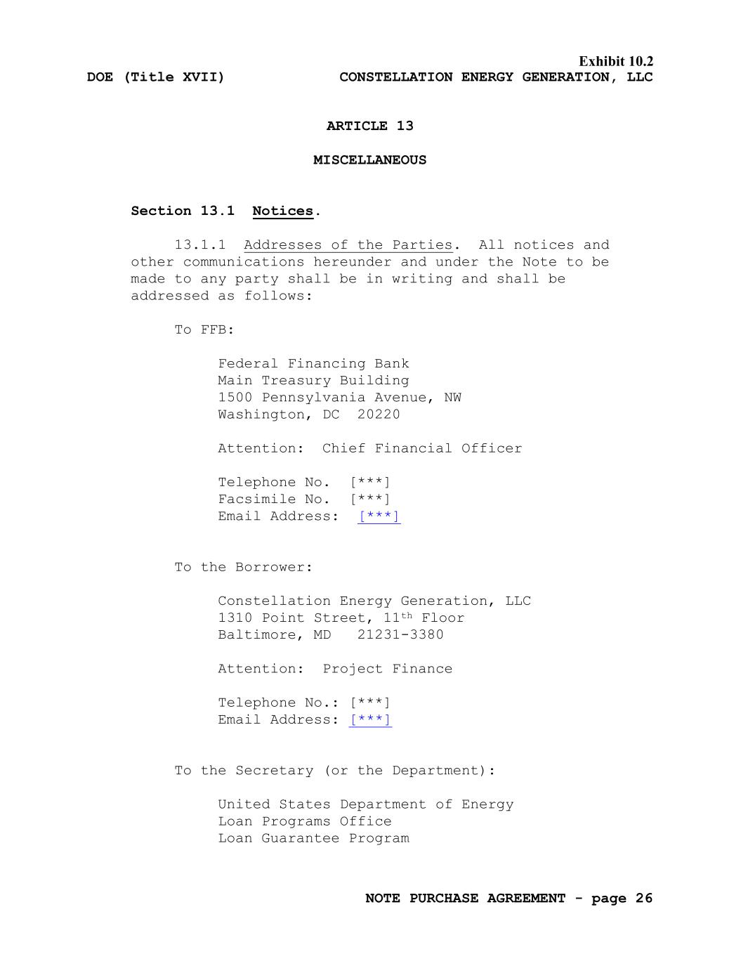 9 [***] = Certain information has been excluded from this exhibit because it is both not material and the type that the registrant treats as private or confidential. ARTICLE III PAYMENTS; PREPAYMENTS Section 3.01 Place and Manner of Payments. (a) All payments due under the FFB Note shall be made by the Borrower to FFB pursuant to the terms of the FFB Documents. (b) All payments to be made to DOE under this Agreement shall be sent by the Borrower in Dollars in immediately available funds before 1:00 p.m. (District of Columbia time) on the date when due to the account specified pursuant to Section 4.01(h) (Reimbursement and Other Payment Obligations). (c) Except as otherwise expressly provided herein, in the event that the date of any payment to DOE or the expiration of any time period hereunder occurs on a day that is not a Business Day, then such payment or expiration of time period shall be made or occur on the next succeeding Business Day, and such extension of time shall in such cases be included in computing interest or fees, if any, in connection with such payment. (d) The Borrower understands and agrees that DOE and FFB are agencies or instrumentalities of the United States, with FFB being wholly-owned, and that all payments to be made by the Borrower to DOE or FFB (and not paid for the account or benefit of, or otherwise required to be paid to, any other Person) hereunder or under the Financing Documents are payable, and shall in all cases be paid, free and clear of all Taxes. To the extent the Borrower is required to make a payment to or for the account or benefit of a Person other than DOE or FFB pursuant to Section 4.01 (Reimbursement and Other Payment Obligations) or otherwise under a Financing Document or the Designated Agency Agreement (including any payment of Guaranteed Party Expenses to a Guaranteed Party Advisor or any payment of principal or interest to any assignee or transferee of DOE or FFB), at the Borrower’s request, DOE shall request such Person to provide to the Borrower (at least one (1) Business Day prior to the due date of such payment) a valid, properly completed and executed IRS Form W-9 (or successor form) establishing that payments to such Person are not subject to U.S. backup withholding. The Borrower shall be entitled to withhold Taxes from any such payment to the extent required by applicable law (without any obligation to gross-up or indemnify for such Taxes) and shall timely remit any amount so withheld to the applicable Governmental Authority. Each Person that provides an IRS Form W-9 to the Borrower hereunder agrees, by delivering such form, that if any such form it previously delivered expires or becomes obsolete or inaccurate in any respect, it shall update such form or promptly notify the Borrower in writing of its legal inability to do so. Section 3.02 Maturity and Amortization. (a) Final Maturity Date. The Borrower shall repay the outstanding Guaranteed Loan in full on the Final Maturity Date. (b) Payments. The FFB Note shall (i) provide that each Advance thereunder shall be due and payable on the Final Maturity Date; and (ii) provide for the payment of interest