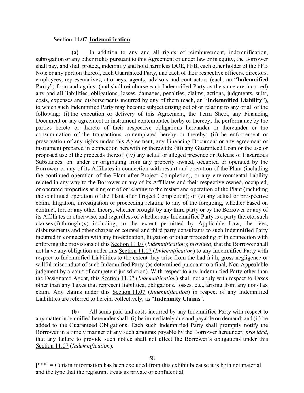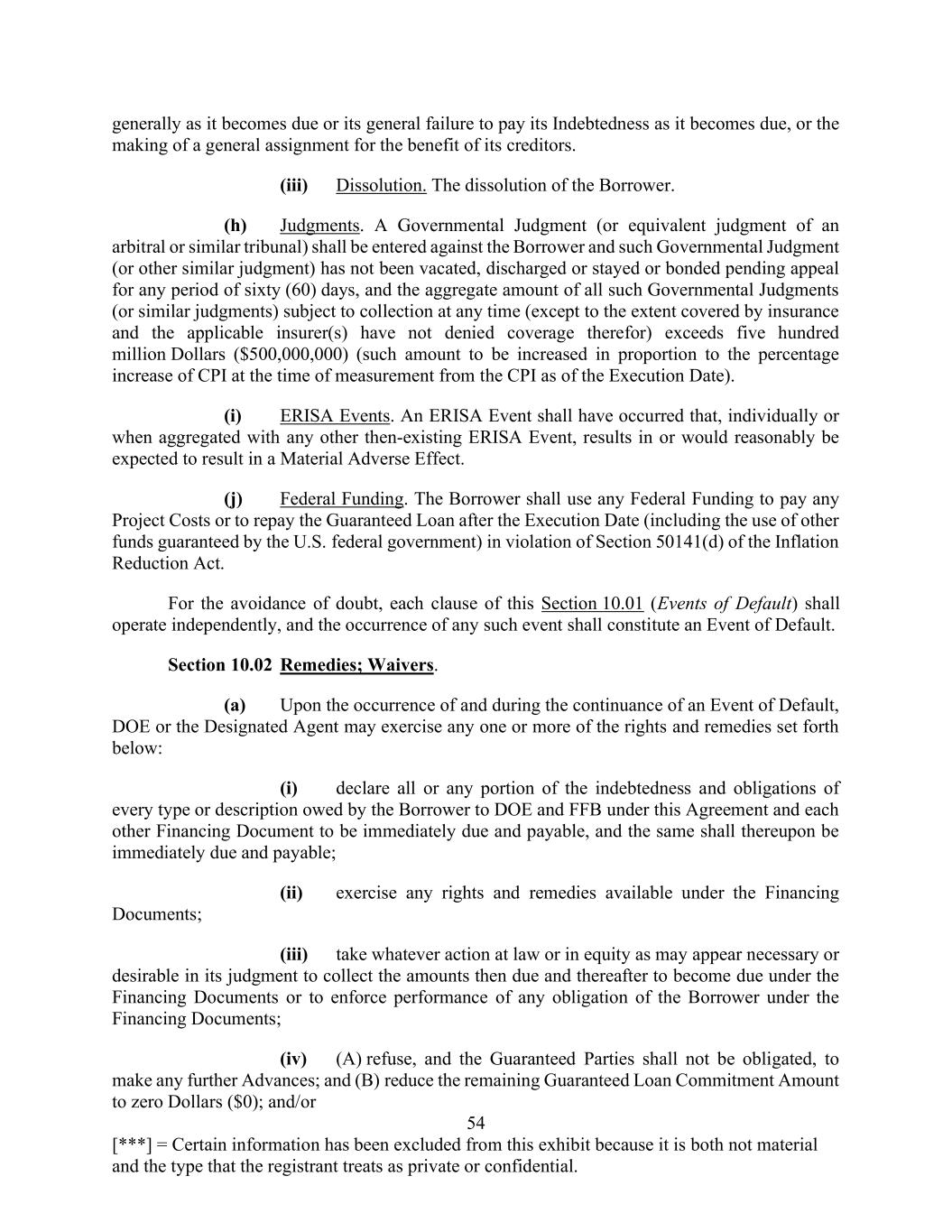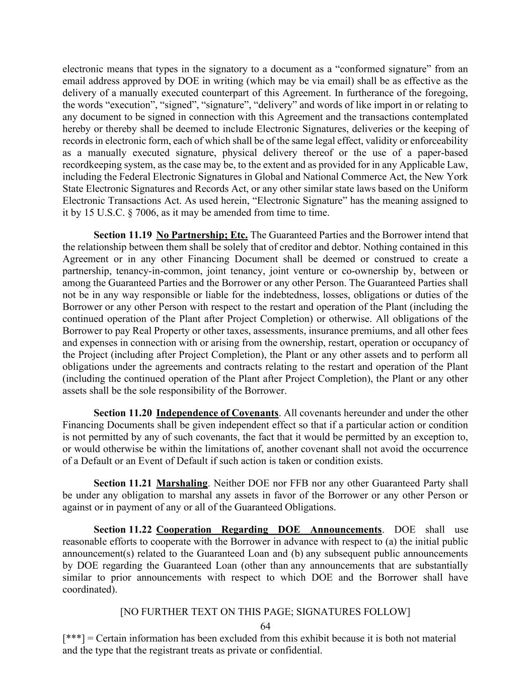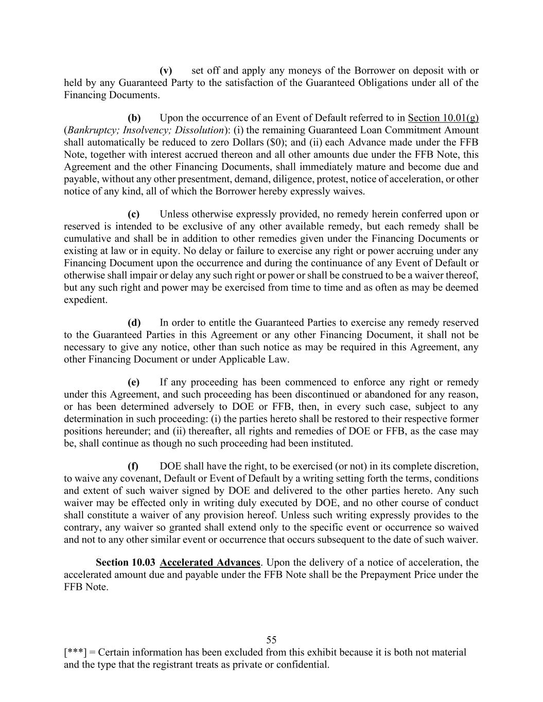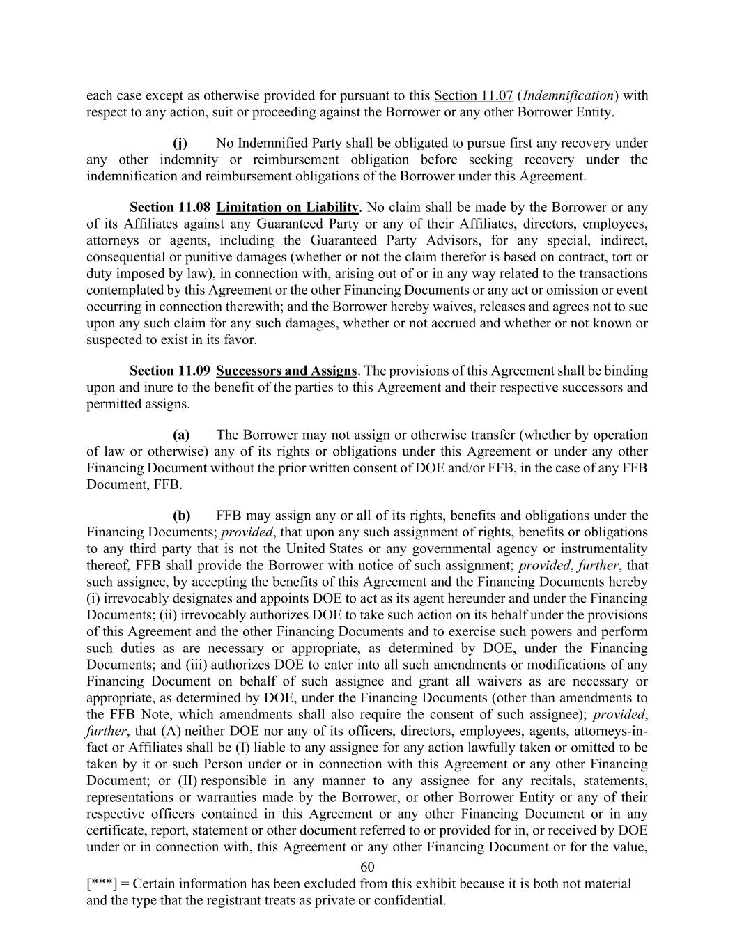 7 [***] = Certain information has been excluded from this exhibit because it is both not material and the type that the registrant treats as private or confidential. to this clause (ii) shall accrue interest at the Late Charge Rate from the date such Advance is made until and including the date such Advance is returned and be subject to payment of a make-whole amount in accordance with the FFB Note. Following the return of such Advance, FFB shall deliver an invoice to the Borrower setting forth the interest and other applicable make-whole amount due and payable with respect to such returned amount. The Borrower shall pay promptly, but in no event later than five (5) Business Days following delivery of such invoice, such interest and other applicable make-whole amounts as directed by FFB, and the Borrower shall pay all costs and expenses incurred by DOE, FFB, and the Designated Agent (as applicable) as a result of such Advance made following the issuance of a Drawstop Notice. (c) No Liability. (i) The Borrower acknowledges and agrees that DOE shall only be required to use its reasonable efforts to provide FFB with the necessary Advance Request Approval Notices within the time frames specified in Section 2.04(a)(ii) (Advance Request Approval Notice) but DOE shall in any event ensure that FFB receives all such Advance Requests and Advance Request Approval Notices as soon as reasonably practicable following receipt from the Borrower of the applicable Advance Requests and certificates and other documentation specified above (subject to the Borrower satisfying all conditions precedent specified in this Agreement, including Section 5.03 (Advance Approval Conditions Precedent) and Section 5.04 (Conditions Precedent to FFB Advance), as applicable, and, prior to the Execution Date, Section 5.01 (Conditions Precedent to the Execution Date) and Section 5.02 (Conditions Precedent to FFB Purchase of the FFB Note), respectively). (ii) Neither DOE nor FFB shall have any liability for any action taken (including the delivery of a Drawstop Notice) or omitted to be taken (including the refusal to fund any Advance or Advances following the issuance of a Drawstop Notice) or for any loss or injury resulting from its actions or inaction or its performance or lack of performance of any of its other obligations hereunder unless and solely to the extent such liability arises from the gross negligence or willful misconduct of DOE or FFB as determined by a court of competent jurisdiction in a final, Non-Appealable judgment. In no event shall DOE, FFB or any subsequent holder of the FFB Note be liable, and each such Person shall be exempt from liability in accordance with Section 11.08 (Limitation on Liability), in each case: (A) for acting in accordance with, or relying upon, any entitlement order, instruction, notice, demand, certificate or document from the Borrower or any Person acting on behalf of the Borrower; or (B) in the case of FFB or any subsequent holder of the FFB Note, for acting in accordance with, or relying upon, any Drawstop Notice issued by DOE. (iii) Notwithstanding anything contained in this Agreement to the contrary, neither DOE nor FFB shall incur any liability to the Borrower, any Affiliate thereof or to any other Guaranteed Party for not performing any act or fulfilling any duty, obligation or responsibility hereunder or under any other Financing Document by reason of any Guaranteed Party Force Majeure Event; it being understood that DOE or FFB, as the case may be, shall resume performance hereunder as soon as reasonably practicable after the effects of such Guaranteed Party Force Majeure Event cease to prevent or otherwise hinder DOE or FFB, as applicable, from performing hereunder or thereunder.
