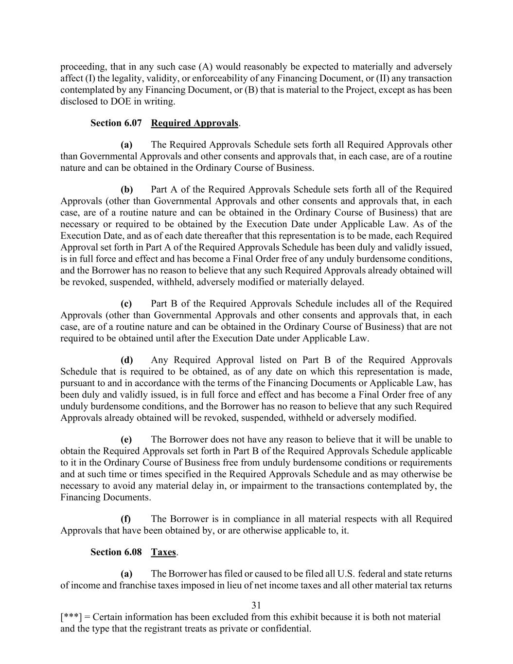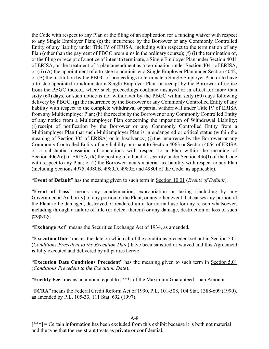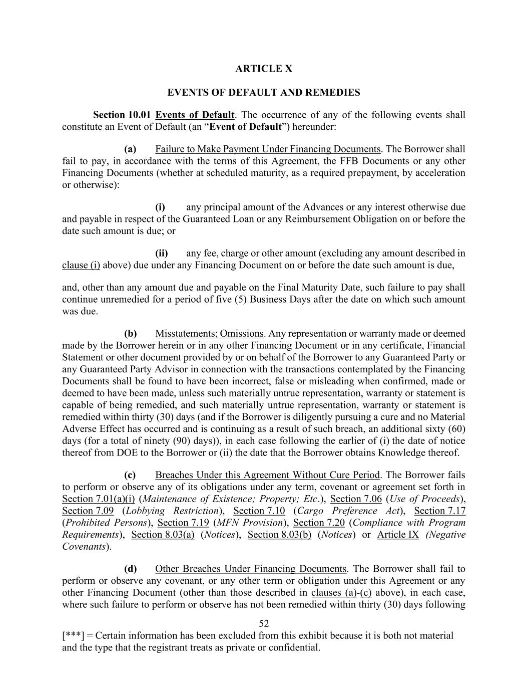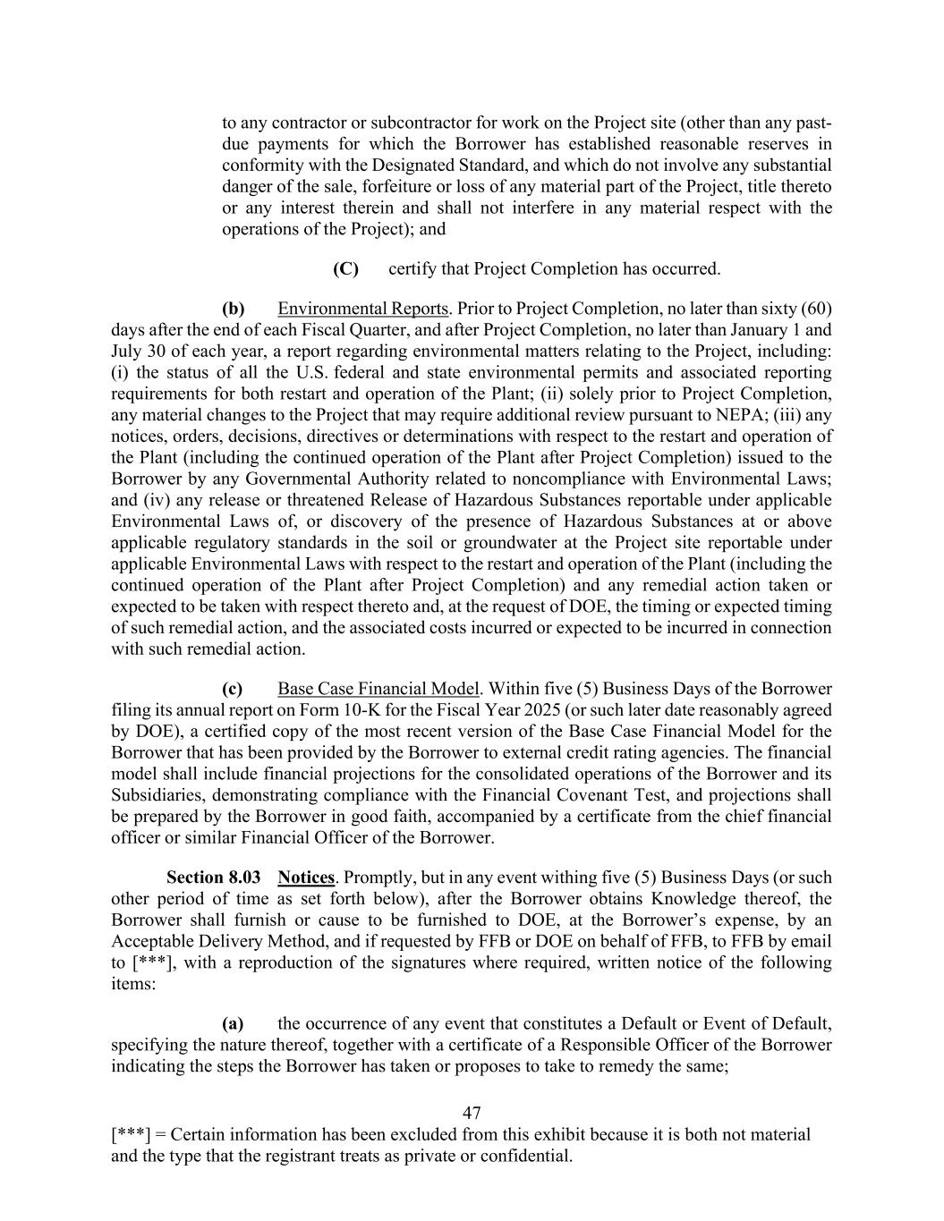 7 [***] = Certain information has been excluded from this exhibit because it is both not material and the type that the registrant treats as private or confidential. to this clause (ii) shall accrue interest at the Late Charge Rate from the date such Advance is made until and including the date such Advance is returned and be subject to payment of a make-whole amount in accordance with the FFB Note. Following the return of such Advance, FFB shall deliver an invoice to the Borrower setting forth the interest and other applicable make-whole amount due and payable with respect to such returned amount. The Borrower shall pay promptly, but in no event later than five (5) Business Days following delivery of such invoice, such interest and other applicable make-whole amounts as directed by FFB, and the Borrower shall pay all costs and expenses incurred by DOE, FFB, and the Designated Agent (as applicable) as a result of such Advance made following the issuance of a Drawstop Notice. (c) No Liability. (i) The Borrower acknowledges and agrees that DOE shall only be required to use its reasonable efforts to provide FFB with the necessary Advance Request Approval Notices within the time frames specified in Section 2.04(a)(ii) (Advance Request Approval Notice) but DOE shall in any event ensure that FFB receives all such Advance Requests and Advance Request Approval Notices as soon as reasonably practicable following receipt from the Borrower of the applicable Advance Requests and certificates and other documentation specified above (subject to the Borrower satisfying all conditions precedent specified in this Agreement, including Section 5.03 (Advance Approval Conditions Precedent) and Section 5.04 (Conditions Precedent to FFB Advance), as applicable, and, prior to the Execution Date, Section 5.01 (Conditions Precedent to the Execution Date) and Section 5.02 (Conditions Precedent to FFB Purchase of the FFB Note), respectively). (ii) Neither DOE nor FFB shall have any liability for any action taken (including the delivery of a Drawstop Notice) or omitted to be taken (including the refusal to fund any Advance or Advances following the issuance of a Drawstop Notice) or for any loss or injury resulting from its actions or inaction or its performance or lack of performance of any of its other obligations hereunder unless and solely to the extent such liability arises from the gross negligence or willful misconduct of DOE or FFB as determined by a court of competent jurisdiction in a final, Non-Appealable judgment. In no event shall DOE, FFB or any subsequent holder of the FFB Note be liable, and each such Person shall be exempt from liability in accordance with Section 11.08 (Limitation on Liability), in each case: (A) for acting in accordance with, or relying upon, any entitlement order, instruction, notice, demand, certificate or document from the Borrower or any Person acting on behalf of the Borrower; or (B) in the case of FFB or any subsequent holder of the FFB Note, for acting in accordance with, or relying upon, any Drawstop Notice issued by DOE. (iii) Notwithstanding anything contained in this Agreement to the contrary, neither DOE nor FFB shall incur any liability to the Borrower, any Affiliate thereof or to any other Guaranteed Party for not performing any act or fulfilling any duty, obligation or responsibility hereunder or under any other Financing Document by reason of any Guaranteed Party Force Majeure Event; it being understood that DOE or FFB, as the case may be, shall resume performance hereunder as soon as reasonably practicable after the effects of such Guaranteed Party Force Majeure Event cease to prevent or otherwise hinder DOE or FFB, as applicable, from performing hereunder or thereunder.