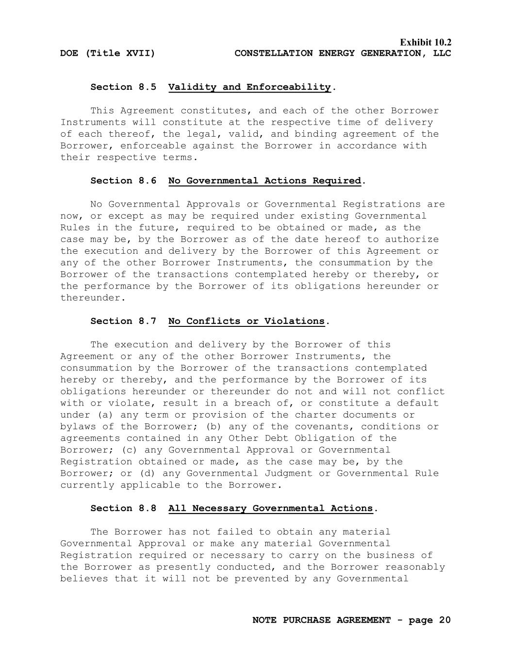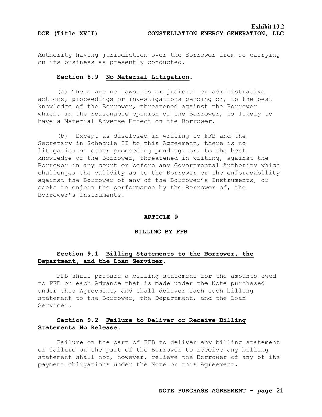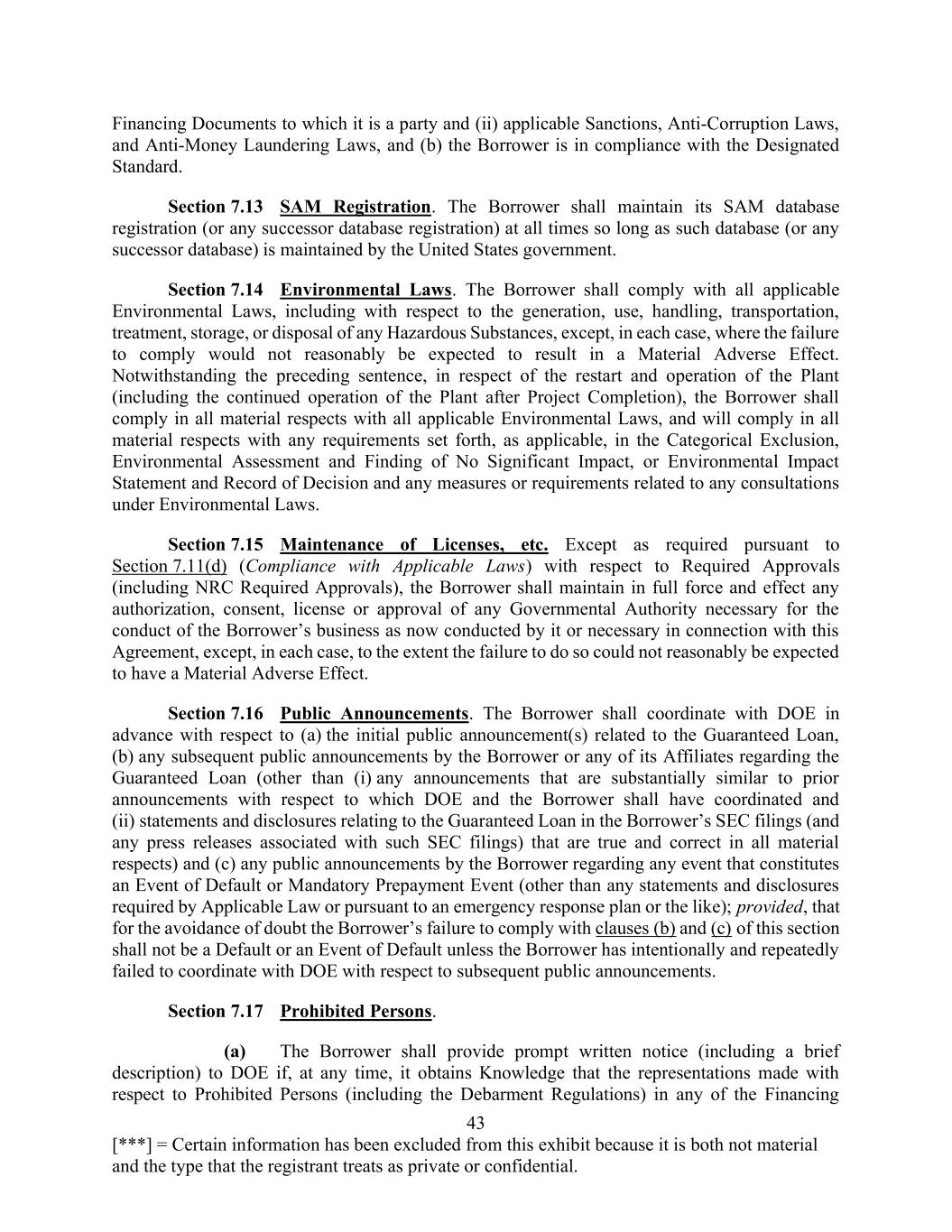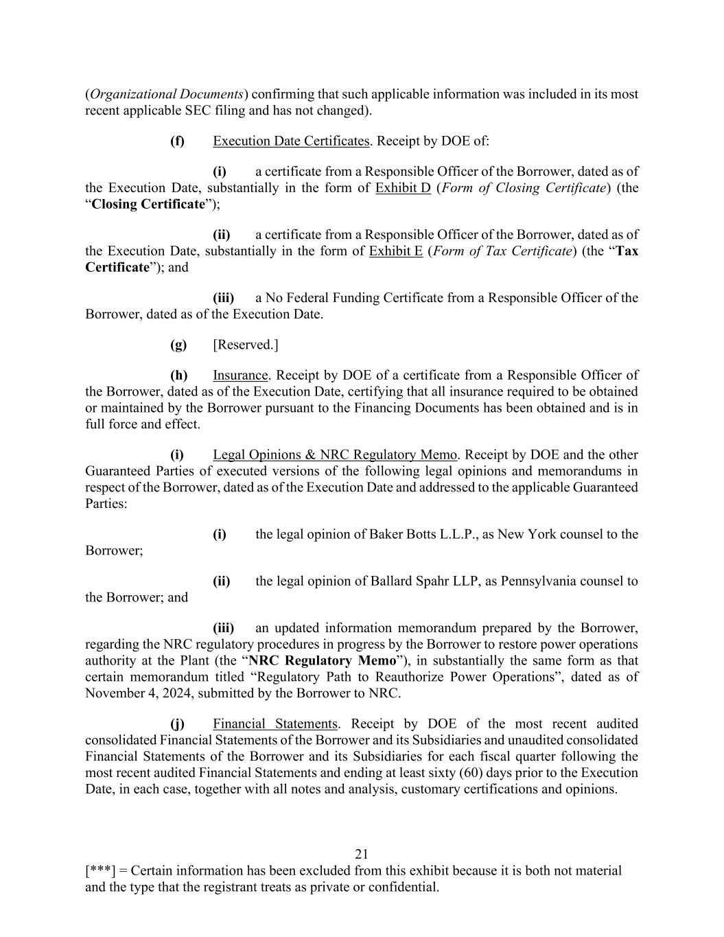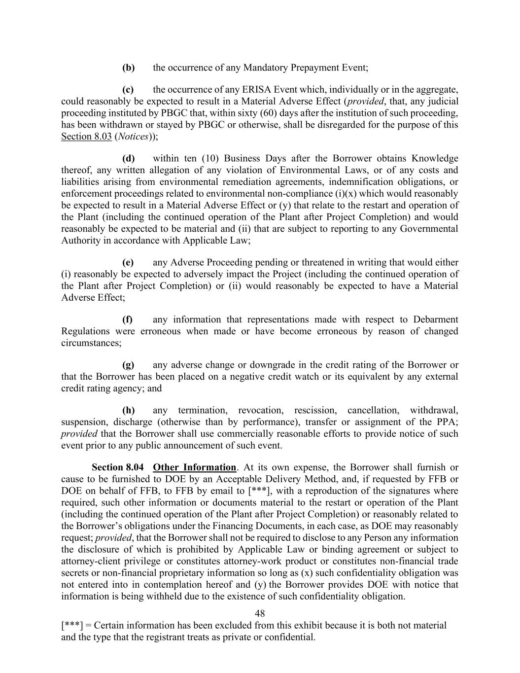 7 [***] = Certain information has been excluded from this exhibit because it is both not material and the type that the registrant treats as private or confidential. to this clause (ii) shall accrue interest at the Late Charge Rate from the date such Advance is made until and including the date such Advance is returned and be subject to payment of a make-whole amount in accordance with the FFB Note. Following the return of such Advance, FFB shall deliver an invoice to the Borrower setting forth the interest and other applicable make-whole amount due and payable with respect to such returned amount. The Borrower shall pay promptly, but in no event later than five (5) Business Days following delivery of such invoice, such interest and other applicable make-whole amounts as directed by FFB, and the Borrower shall pay all costs and expenses incurred by DOE, FFB, and the Designated Agent (as applicable) as a result of such Advance made following the issuance of a Drawstop Notice. (c) No Liability. (i) The Borrower acknowledges and agrees that DOE shall only be required to use its reasonable efforts to provide FFB with the necessary Advance Request Approval Notices within the time frames specified in Section 2.04(a)(ii) (Advance Request Approval Notice) but DOE shall in any event ensure that FFB receives all such Advance Requests and Advance Request Approval Notices as soon as reasonably practicable following receipt from the Borrower of the applicable Advance Requests and certificates and other documentation specified above (subject to the Borrower satisfying all conditions precedent specified in this Agreement, including Section 5.03 (Advance Approval Conditions Precedent) and Section 5.04 (Conditions Precedent to FFB Advance), as applicable, and, prior to the Execution Date, Section 5.01 (Conditions Precedent to the Execution Date) and Section 5.02 (Conditions Precedent to FFB Purchase of the FFB Note), respectively). (ii) Neither DOE nor FFB shall have any liability for any action taken (including the delivery of a Drawstop Notice) or omitted to be taken (including the refusal to fund any Advance or Advances following the issuance of a Drawstop Notice) or for any loss or injury resulting from its actions or inaction or its performance or lack of performance of any of its other obligations hereunder unless and solely to the extent such liability arises from the gross negligence or willful misconduct of DOE or FFB as determined by a court of competent jurisdiction in a final, Non-Appealable judgment. In no event shall DOE, FFB or any subsequent holder of the FFB Note be liable, and each such Person shall be exempt from liability in accordance with Section 11.08 (Limitation on Liability), in each case: (A) for acting in accordance with, or relying upon, any entitlement order, instruction, notice, demand, certificate or document from the Borrower or any Person acting on behalf of the Borrower; or (B) in the case of FFB or any subsequent holder of the FFB Note, for acting in accordance with, or relying upon, any Drawstop Notice issued by DOE. (iii) Notwithstanding anything contained in this Agreement to the contrary, neither DOE nor FFB shall incur any liability to the Borrower, any Affiliate thereof or to any other Guaranteed Party for not performing any act or fulfilling any duty, obligation or responsibility hereunder or under any other Financing Document by reason of any Guaranteed Party Force Majeure Event; it being understood that DOE or FFB, as the case may be, shall resume performance hereunder as soon as reasonably practicable after the effects of such Guaranteed Party Force Majeure Event cease to prevent or otherwise hinder DOE or FFB, as applicable, from performing hereunder or thereunder.
