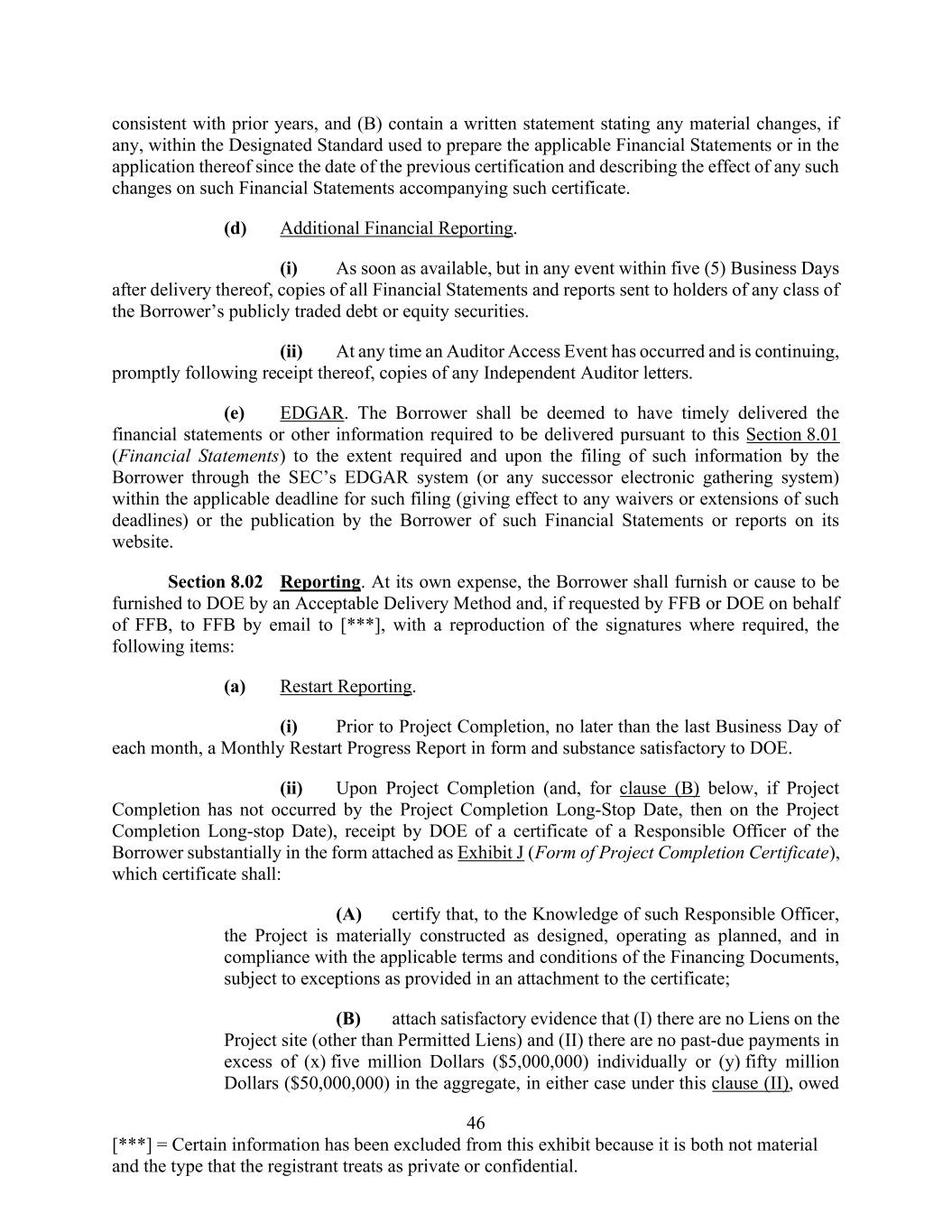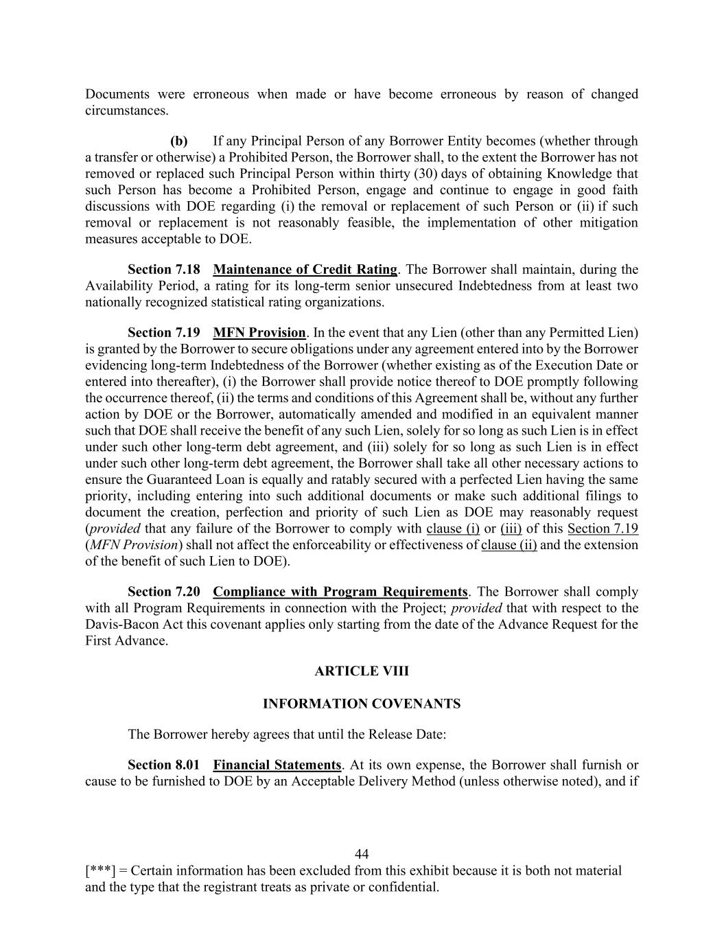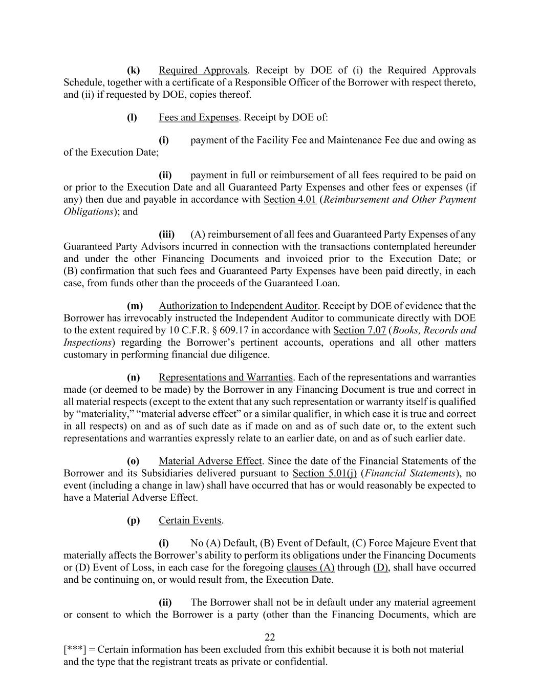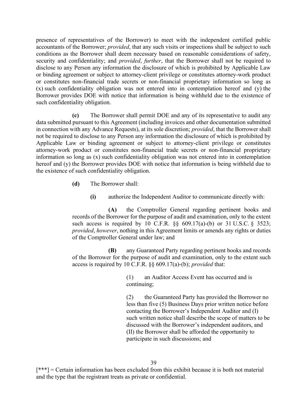 5 [***] = Certain information has been excluded from this exhibit because it is both not material and the type that the registrant treats as private or confidential. Advance Amounts), the aggregate amount of all Advances made to the Borrower under the FFB Note shall comply with the Debt Sizing Parameters. (b) Guaranteed Loan Commitment Amount Reductions. (i) The Borrower may, on not less than thirty (30) days’ prior written notice to DOE, permanently reduce the Guaranteed Loan Commitment Amount in whole or in part, but only if: (A) the Borrower shall have delivered to DOE by an Acceptable Delivery Method, a certificate, in form and substance satisfactory to DOE, that (i) the total funding available to the Borrower is sufficient to pay all remaining Project Costs and (ii) the proposed reduction or cancellation would not reasonably be expected to cause a Default or an Event of Default; and (B) upon such cancellation or reduction, the Borrower shall pay all expenses and other amounts then due with respect to, or as a result of, such cancellation or reduction under this Agreement. (ii) Once reduced or canceled, the Guaranteed Loan Commitment Amount may not be increased or reinstated. (c) First Advance Long-stop Date; Termination. If the First Advance has not occurred by the First Advance Long-stop Date, DOE may terminate this Agreement upon no less than ten (10) Business Days’ prior written notice to the Borrower; provided, that the Borrower shall have no obligation to request or receive any Advances. Upon such termination, the Borrower shall pay all expenses and other amounts then due in accordance with this Agreement and the other Financing Documents with respect to, or as a result of, such termination. Once terminated, this Agreement may not be reinstated. Section 2.03 Mechanics for Requesting Advances. (a) Advance Requests. Subject to the FFB Documents and Section 2.03(b) (Frequency), from time to time during the Availability Period, the Borrower may request an Advance under the FFB Documents by delivering, by an Acceptable Delivery Method, to DOE, with a copy to the Independent Engineer, an appropriately completed request with respect to such Advance (each, an “Advance Request”), any time not less than twenty (20) Business Days prior to the Requested Advance Date. Each Advance Request shall be in the form attached as Exhibit A (Form of Advance Request) (as such form may be amended, supplemented or modified from time to time by DOE, the “Form of Advance Request”). (b) Frequency. The Borrower may request Advances in accordance with Section 2.03(a) (Advance Requests) not more than once per calendar quarter during the Availability Period. Section 2.04 Mechanics for Funding Advances. (a) Advance Funding.