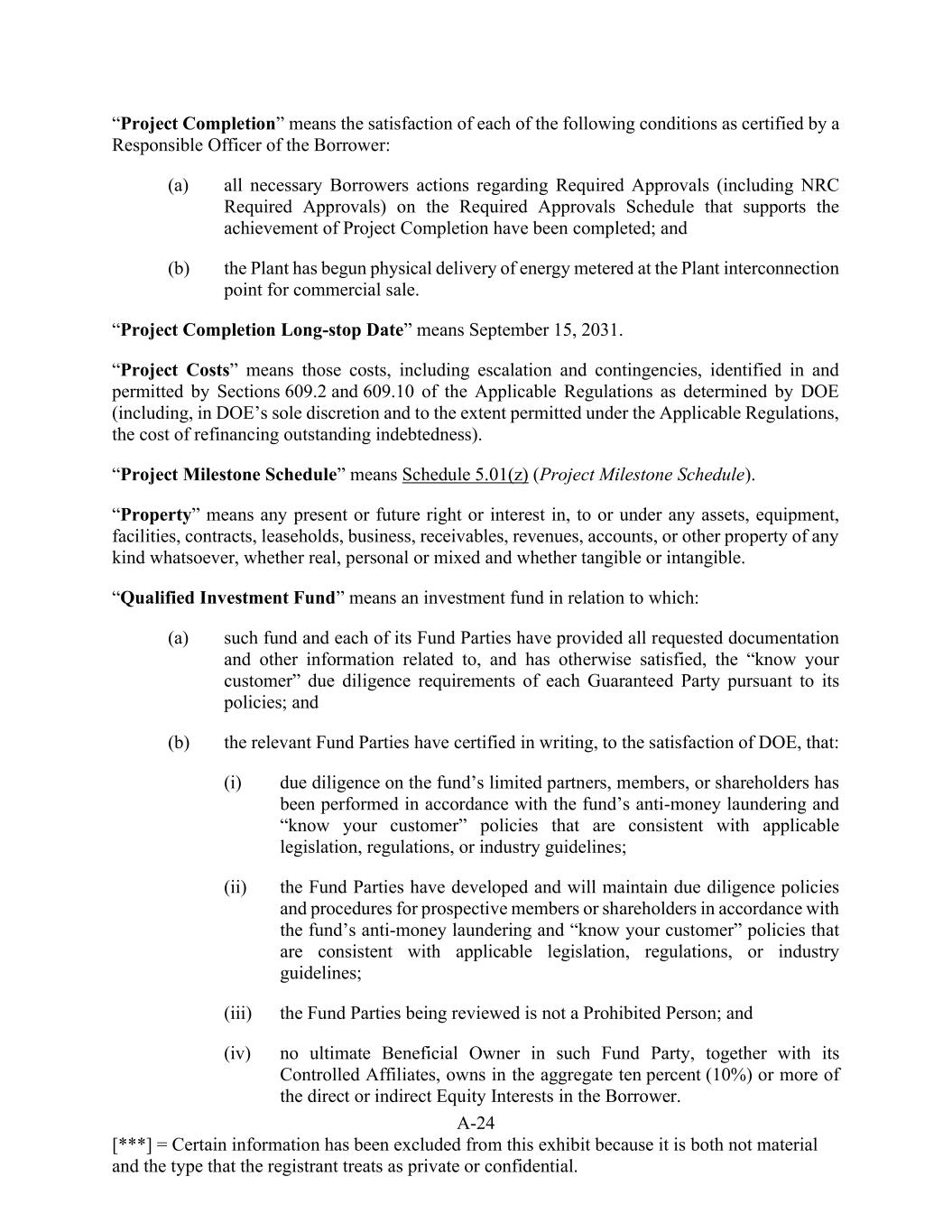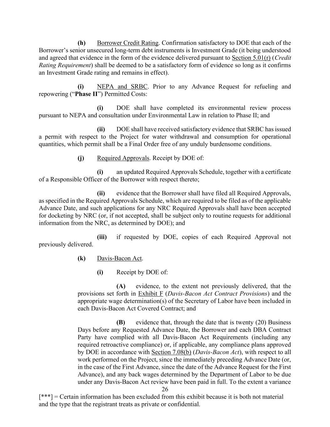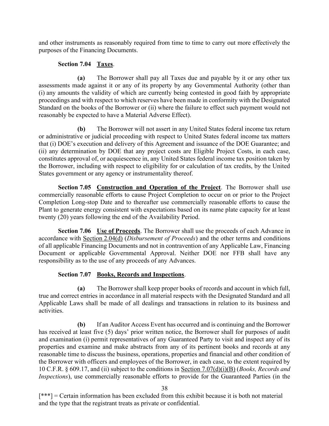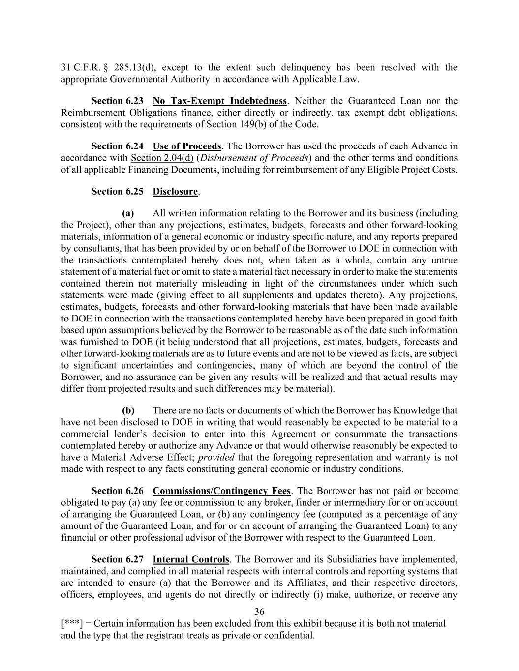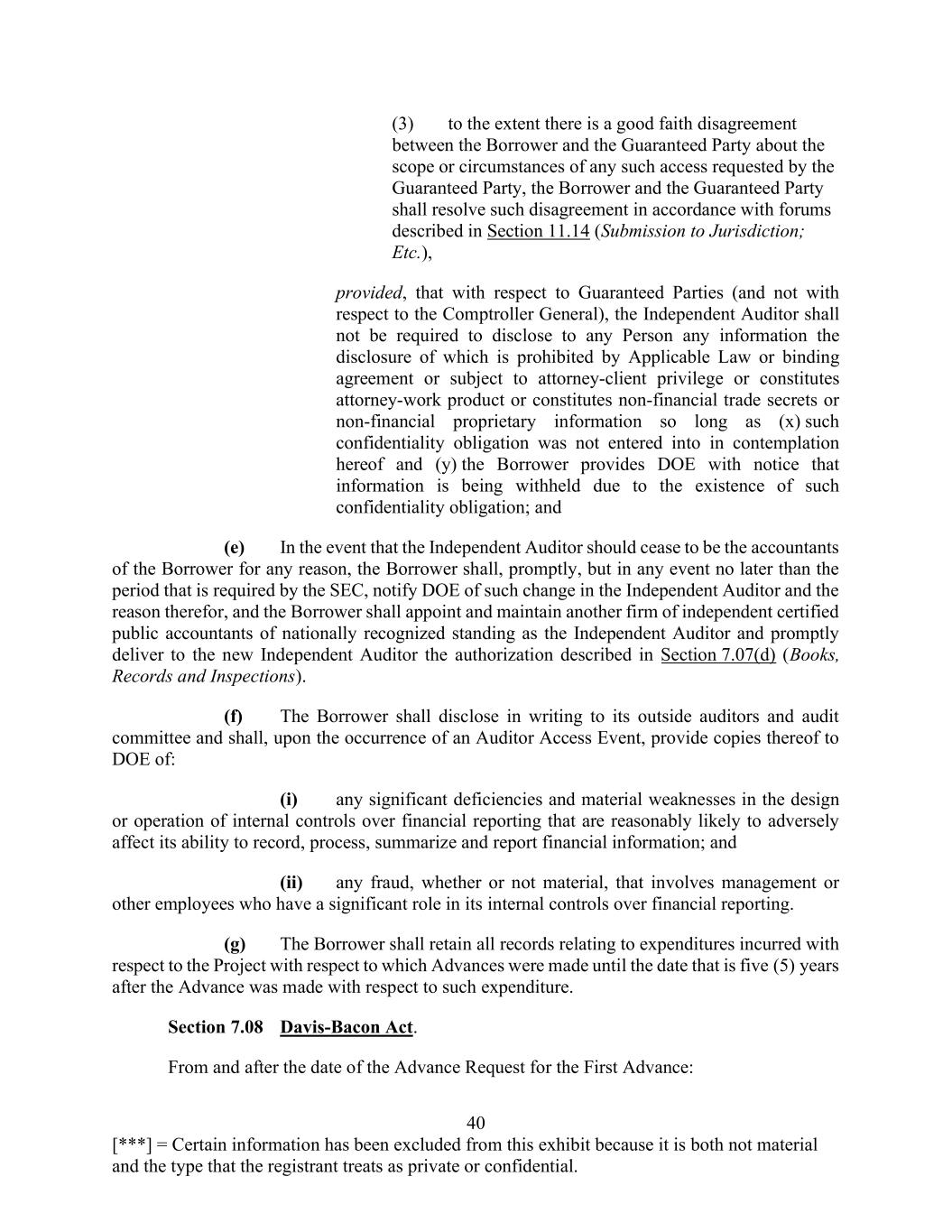 5 [***] = Certain information has been excluded from this exhibit because it is both not material and the type that the registrant treats as private or confidential. Advance Amounts), the aggregate amount of all Advances made to the Borrower under the FFB Note shall comply with the Debt Sizing Parameters. (b) Guaranteed Loan Commitment Amount Reductions. (i) The Borrower may, on not less than thirty (30) days’ prior written notice to DOE, permanently reduce the Guaranteed Loan Commitment Amount in whole or in part, but only if: (A) the Borrower shall have delivered to DOE by an Acceptable Delivery Method, a certificate, in form and substance satisfactory to DOE, that (i) the total funding available to the Borrower is sufficient to pay all remaining Project Costs and (ii) the proposed reduction or cancellation would not reasonably be expected to cause a Default or an Event of Default; and (B) upon such cancellation or reduction, the Borrower shall pay all expenses and other amounts then due with respect to, or as a result of, such cancellation or reduction under this Agreement. (ii) Once reduced or canceled, the Guaranteed Loan Commitment Amount may not be increased or reinstated. (c) First Advance Long-stop Date; Termination. If the First Advance has not occurred by the First Advance Long-stop Date, DOE may terminate this Agreement upon no less than ten (10) Business Days’ prior written notice to the Borrower; provided, that the Borrower shall have no obligation to request or receive any Advances. Upon such termination, the Borrower shall pay all expenses and other amounts then due in accordance with this Agreement and the other Financing Documents with respect to, or as a result of, such termination. Once terminated, this Agreement may not be reinstated. Section 2.03 Mechanics for Requesting Advances. (a) Advance Requests. Subject to the FFB Documents and Section 2.03(b) (Frequency), from time to time during the Availability Period, the Borrower may request an Advance under the FFB Documents by delivering, by an Acceptable Delivery Method, to DOE, with a copy to the Independent Engineer, an appropriately completed request with respect to such Advance (each, an “Advance Request”), any time not less than twenty (20) Business Days prior to the Requested Advance Date. Each Advance Request shall be in the form attached as Exhibit A (Form of Advance Request) (as such form may be amended, supplemented or modified from time to time by DOE, the “Form of Advance Request”). (b) Frequency. The Borrower may request Advances in accordance with Section 2.03(a) (Advance Requests) not more than once per calendar quarter during the Availability Period. Section 2.04 Mechanics for Funding Advances. (a) Advance Funding.