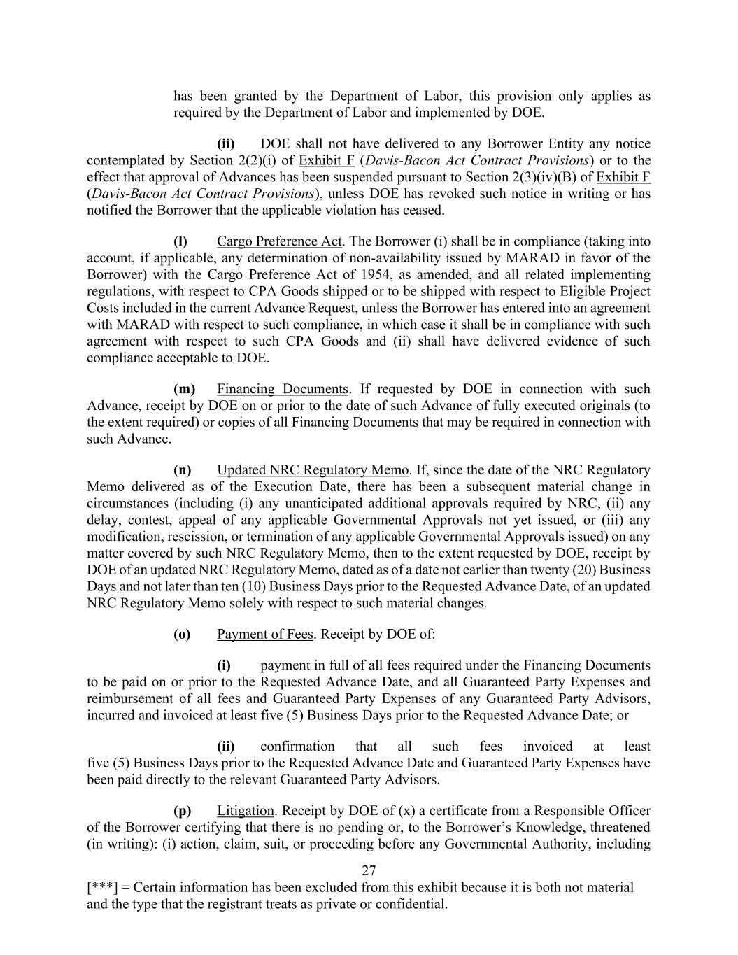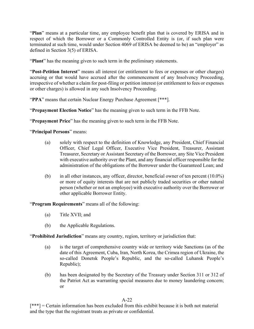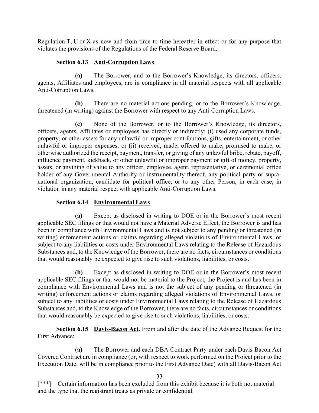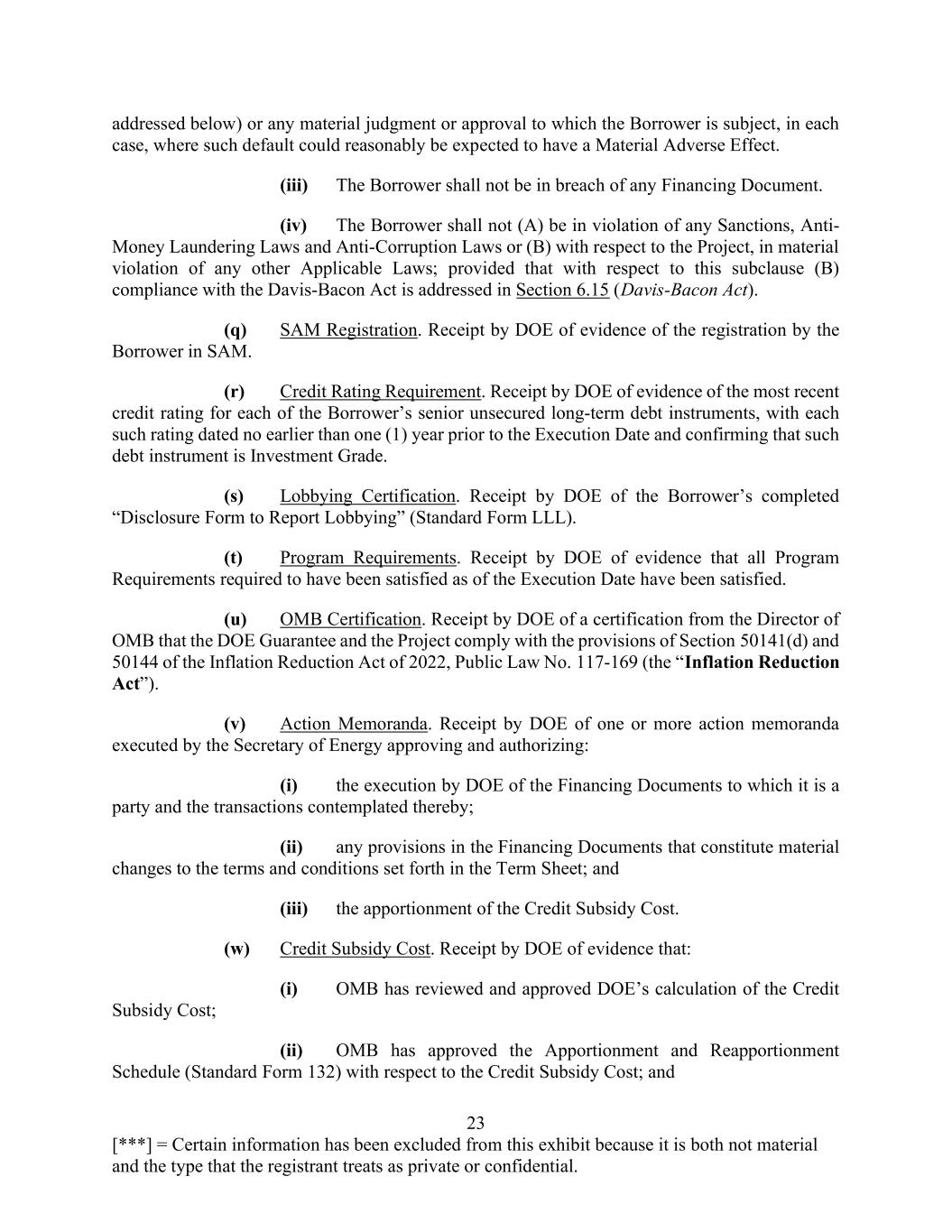 5 [***] = Certain information has been excluded from this exhibit because it is both not material and the type that the registrant treats as private or confidential. Advance Amounts), the aggregate amount of all Advances made to the Borrower under the FFB Note shall comply with the Debt Sizing Parameters. (b) Guaranteed Loan Commitment Amount Reductions. (i) The Borrower may, on not less than thirty (30) days’ prior written notice to DOE, permanently reduce the Guaranteed Loan Commitment Amount in whole or in part, but only if: (A) the Borrower shall have delivered to DOE by an Acceptable Delivery Method, a certificate, in form and substance satisfactory to DOE, that (i) the total funding available to the Borrower is sufficient to pay all remaining Project Costs and (ii) the proposed reduction or cancellation would not reasonably be expected to cause a Default or an Event of Default; and (B) upon such cancellation or reduction, the Borrower shall pay all expenses and other amounts then due with respect to, or as a result of, such cancellation or reduction under this Agreement. (ii) Once reduced or canceled, the Guaranteed Loan Commitment Amount may not be increased or reinstated. (c) First Advance Long-stop Date; Termination. If the First Advance has not occurred by the First Advance Long-stop Date, DOE may terminate this Agreement upon no less than ten (10) Business Days’ prior written notice to the Borrower; provided, that the Borrower shall have no obligation to request or receive any Advances. Upon such termination, the Borrower shall pay all expenses and other amounts then due in accordance with this Agreement and the other Financing Documents with respect to, or as a result of, such termination. Once terminated, this Agreement may not be reinstated. Section 2.03 Mechanics for Requesting Advances. (a) Advance Requests. Subject to the FFB Documents and Section 2.03(b) (Frequency), from time to time during the Availability Period, the Borrower may request an Advance under the FFB Documents by delivering, by an Acceptable Delivery Method, to DOE, with a copy to the Independent Engineer, an appropriately completed request with respect to such Advance (each, an “Advance Request”), any time not less than twenty (20) Business Days prior to the Requested Advance Date. Each Advance Request shall be in the form attached as Exhibit A (Form of Advance Request) (as such form may be amended, supplemented or modified from time to time by DOE, the “Form of Advance Request”). (b) Frequency. The Borrower may request Advances in accordance with Section 2.03(a) (Advance Requests) not more than once per calendar quarter during the Availability Period. Section 2.04 Mechanics for Funding Advances. (a) Advance Funding.