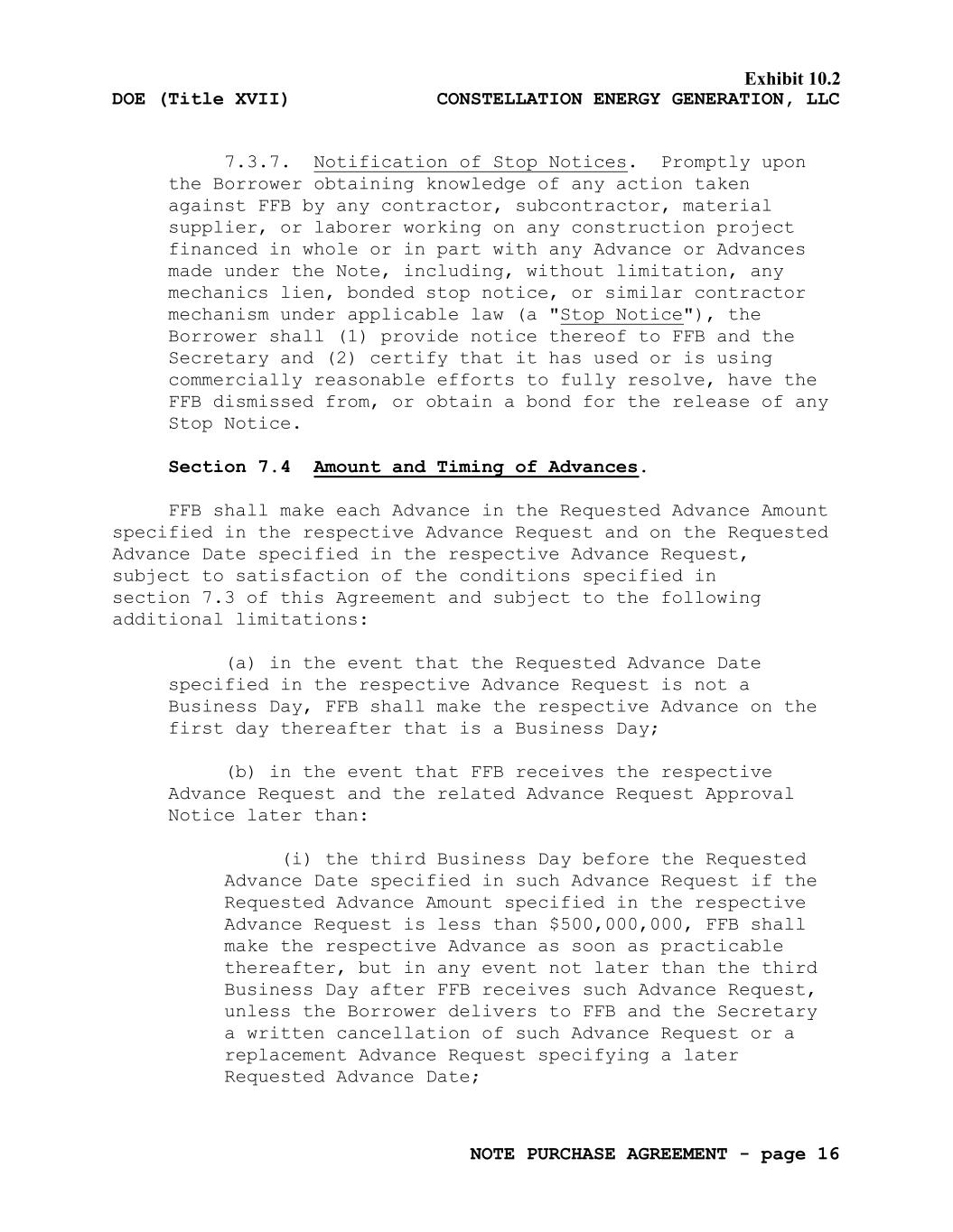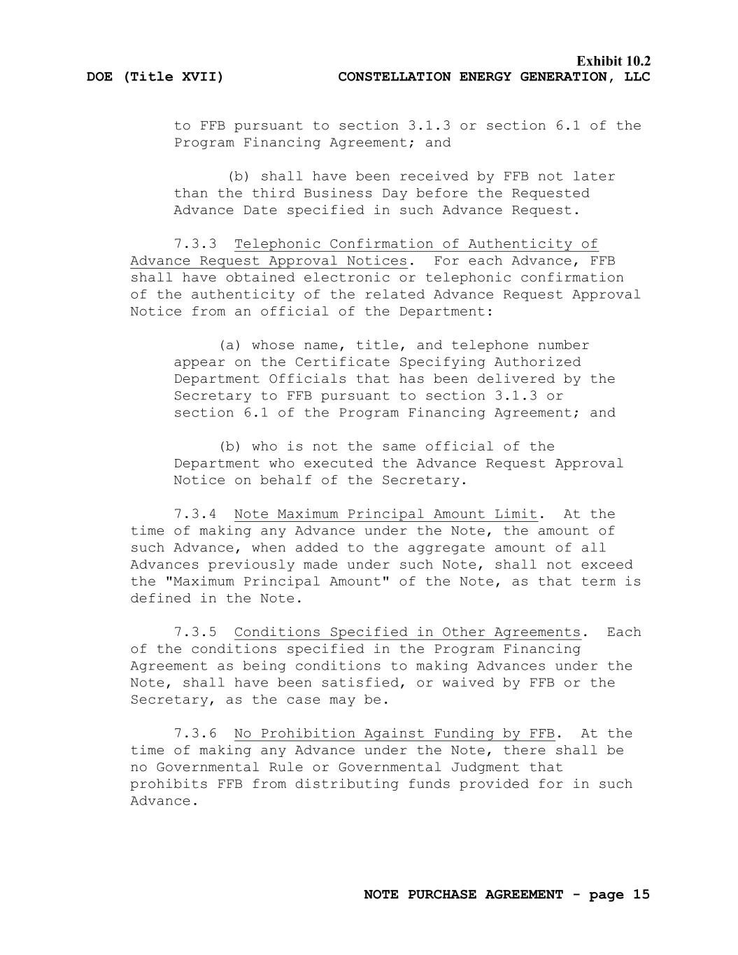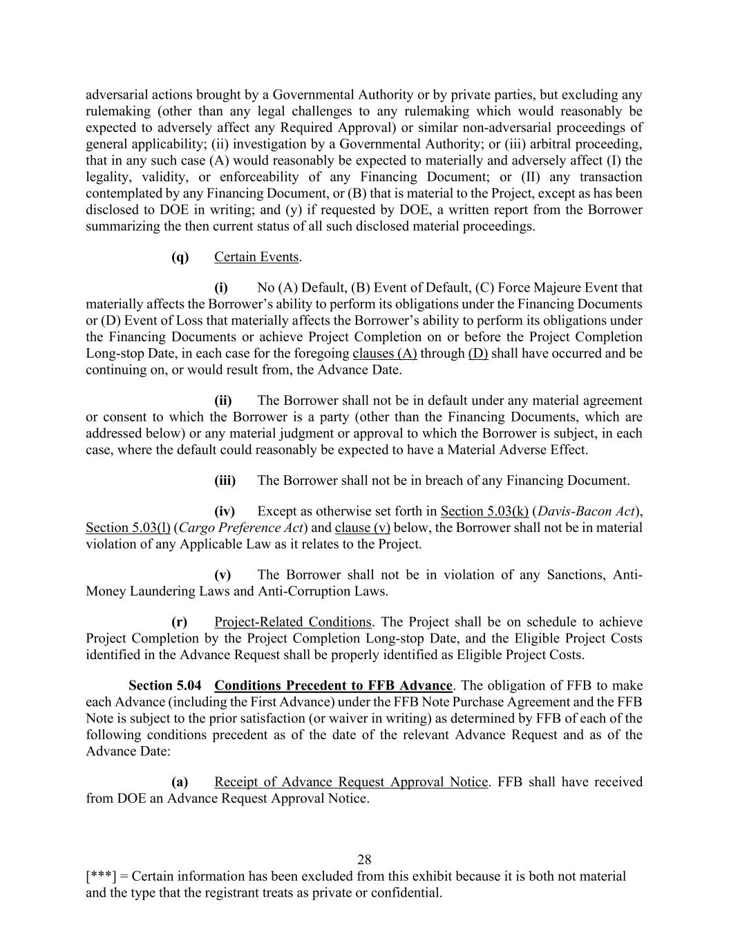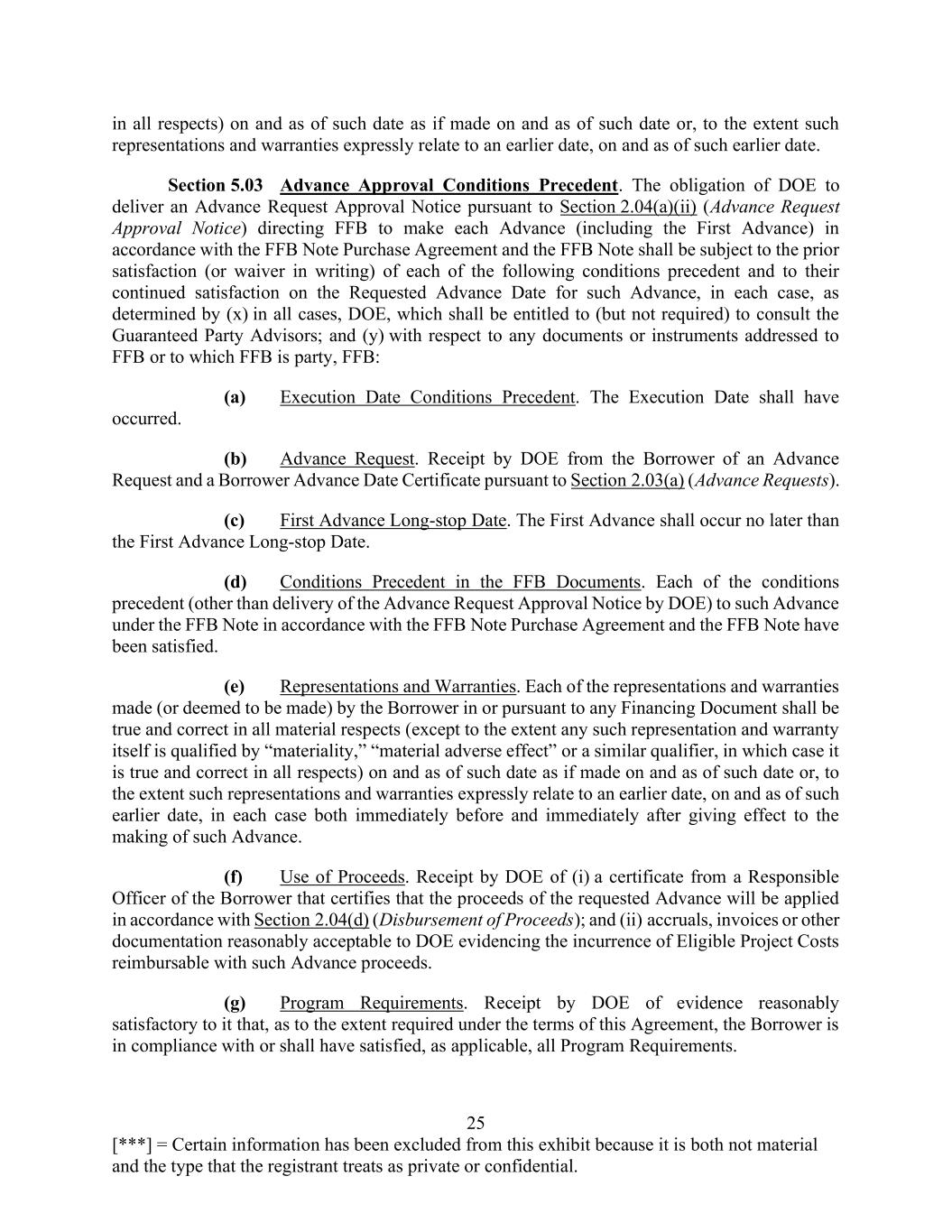 6 [***] = Certain information has been excluded from this exhibit because it is both not material and the type that the registrant treats as private or confidential. (i) Satisfaction of Conditions. Promptly after receipt of an Advance Request complying with Section 2.03(a) (Advance Requests), DOE shall review such Advance Request to determine whether all certificates and documentation required to be attached thereto have been delivered to it. (ii) Advance Request Approval Notice. With respect to any Advance under the FFB Documents, if DOE determines that: (x) the Advance Request has been satisfactorily completed pursuant to Section 2.03 (Mechanics for Requesting Advances) and this Section 2.04 (Mechanics for Funding Advances); and (y) all conditions precedent set forth in Section 5.03 (Advance Approval Conditions Precedent) in respect of the requested Advance have been satisfied (or waived in writing), then DOE shall issue to FFB an Advance Request Approval Notice no later than five (5) Business Days prior to the Requested Advance Date. (iii) Funding. For any requested Advance for which an Advance Request Approval Notice has been issued pursuant to this Section 2.04(a) (Advance Funding) and for which no Drawstop Notice has been issued pursuant to Section 2.04(b) (Drawstop Notices), FFB shall fund such Advance on the Requested Advance Date in accordance with the FFB Note Purchase Agreement and the FFB Note. Such funds shall be applied as specified in the FFB Documents and in accordance with Section 2.04(d) (Disbursement of Proceeds); provided, that if any Drawstop Notice has been issued and is in effect on the Requested Advance Date with respect to any funds received by the Borrower, such funds (together with any additional amounts due thereon or arising therefrom) shall be returned by the Borrower to FFB pursuant to Section 2.04(b) (Drawstop Notices). (b) Drawstop Notices. (i) Issuance. Following the issuance of any Advance Request Approval Notice by DOE pursuant to Section 2.04(a)(ii) (Advance Request Approval Notice) and prior to the Requested Advance Date, DOE or FFB may, from time to time, issue a notice substantially in the form attached hereto as Exhibit B (Form of Drawstop Notice) (a “Drawstop Notice”) to the Borrower and to DOE or FFB, as the case may be, if and only if DOE or FFB, as the case may be, determines that: (A) any condition set forth in Section 5.03 (Advance Approval Conditions Precedent) and Section 5.04 (Conditions Precedent to FFB Advance), as applicable, with respect to such Advance is not met; or (B) to the extent the Advance Request Approval Notice has been issued for any Advance under the FFB Note and the FFB Note Purchase Agreement, the conditions precedent to such Advance contained in the FFB Note and the FFB Note Purchase Agreement are not met. (ii) Consequences. If a Drawstop Notice is issued, FFB shall not be obligated to make the requested Advance set forth on such Drawstop Notice; provided, that if FFB makes any such Advance to the Borrower following the issuance of a Drawstop Notice, the Borrower shall return such Advance to FFB within five (5) Business Days following receipt thereof; and, provided further, that any amount required to be returned by the Borrower pursuant