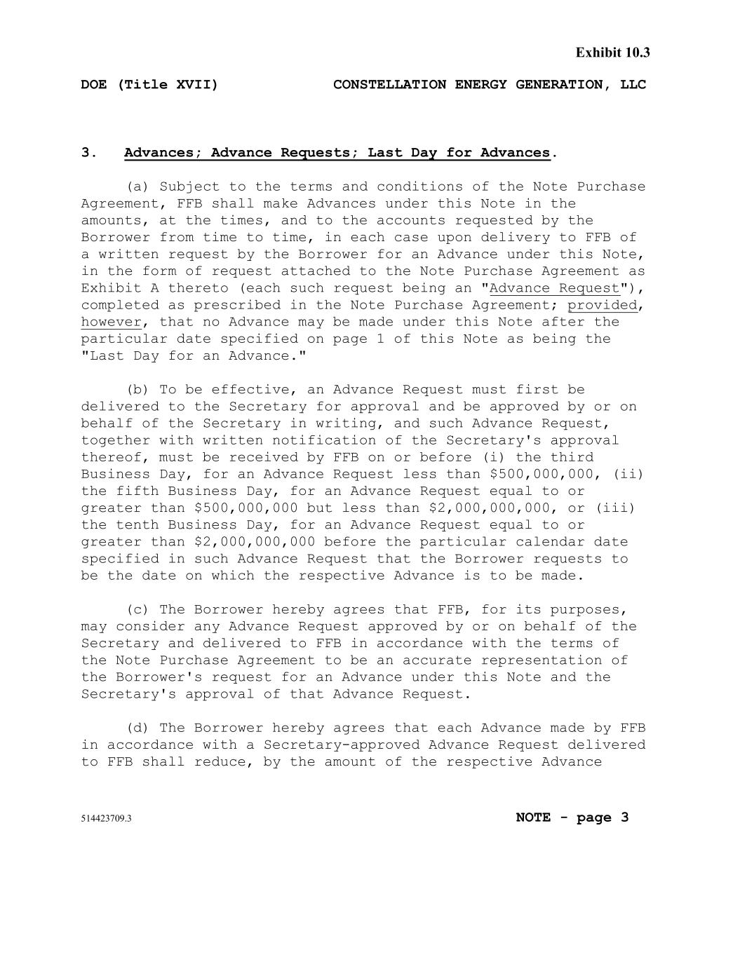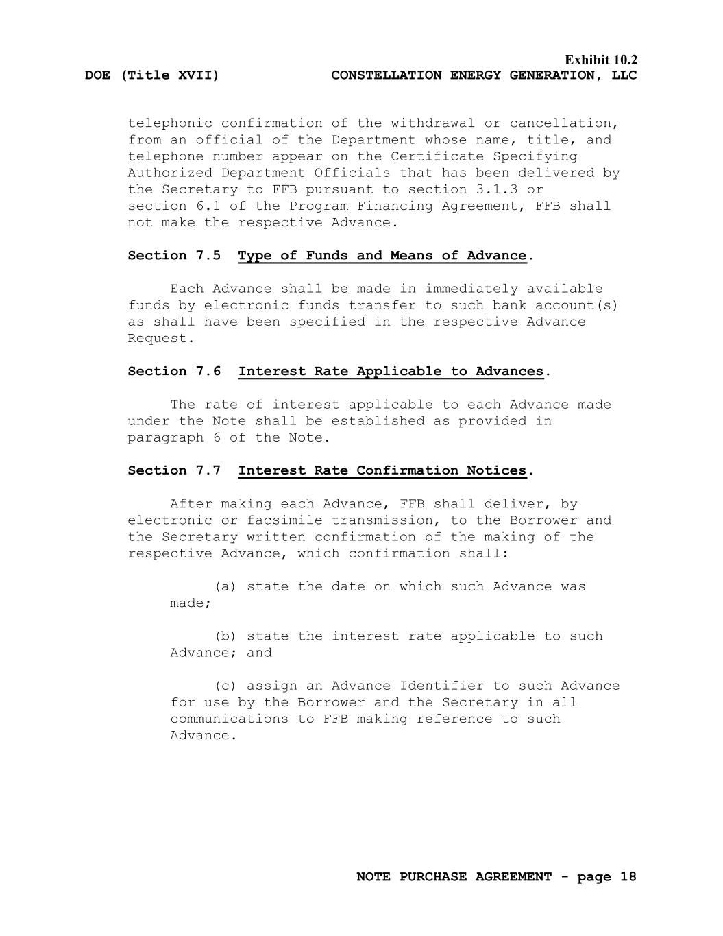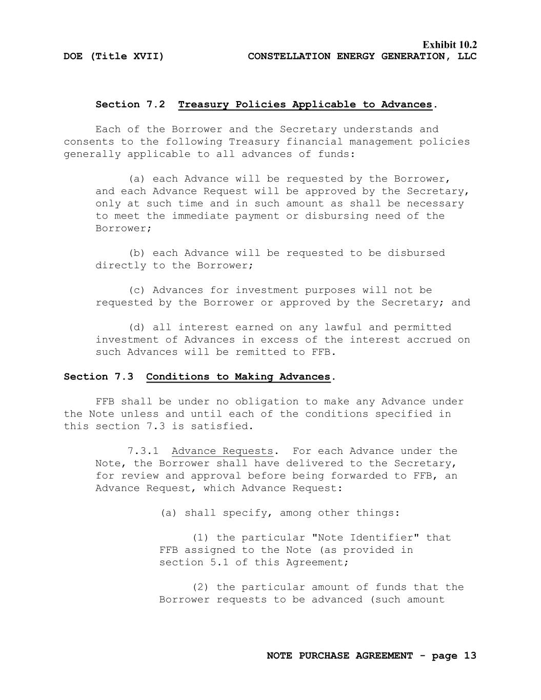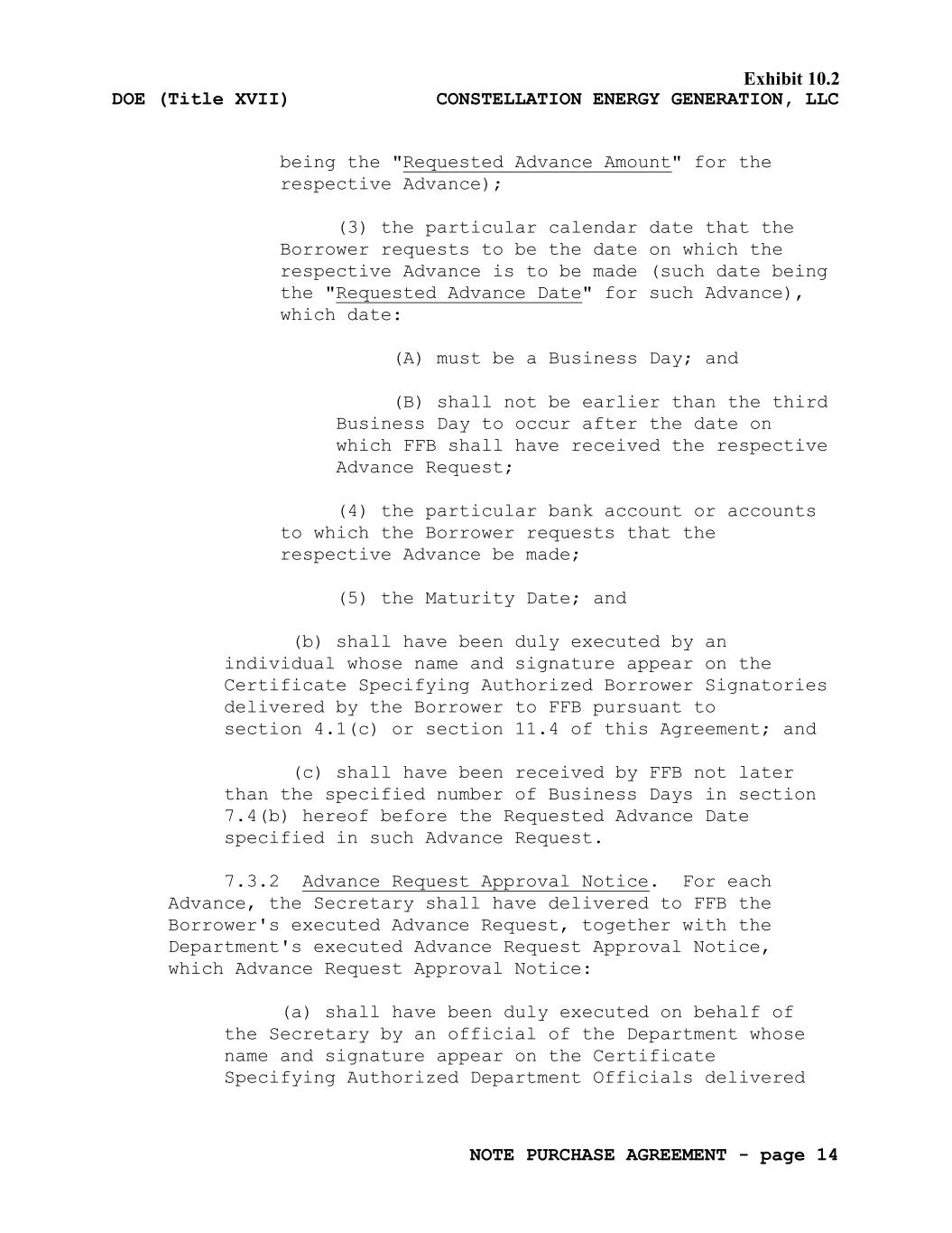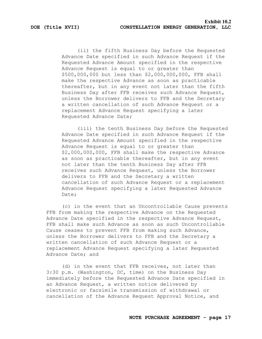 6 [***] = Certain information has been excluded from this exhibit because it is both not material and the type that the registrant treats as private or confidential. (i) Satisfaction of Conditions. Promptly after receipt of an Advance Request complying with Section 2.03(a) (Advance Requests), DOE shall review such Advance Request to determine whether all certificates and documentation required to be attached thereto have been delivered to it. (ii) Advance Request Approval Notice. With respect to any Advance under the FFB Documents, if DOE determines that: (x) the Advance Request has been satisfactorily completed pursuant to Section 2.03 (Mechanics for Requesting Advances) and this Section 2.04 (Mechanics for Funding Advances); and (y) all conditions precedent set forth in Section 5.03 (Advance Approval Conditions Precedent) in respect of the requested Advance have been satisfied (or waived in writing), then DOE shall issue to FFB an Advance Request Approval Notice no later than five (5) Business Days prior to the Requested Advance Date. (iii) Funding. For any requested Advance for which an Advance Request Approval Notice has been issued pursuant to this Section 2.04(a) (Advance Funding) and for which no Drawstop Notice has been issued pursuant to Section 2.04(b) (Drawstop Notices), FFB shall fund such Advance on the Requested Advance Date in accordance with the FFB Note Purchase Agreement and the FFB Note. Such funds shall be applied as specified in the FFB Documents and in accordance with Section 2.04(d) (Disbursement of Proceeds); provided, that if any Drawstop Notice has been issued and is in effect on the Requested Advance Date with respect to any funds received by the Borrower, such funds (together with any additional amounts due thereon or arising therefrom) shall be returned by the Borrower to FFB pursuant to Section 2.04(b) (Drawstop Notices). (b) Drawstop Notices. (i) Issuance. Following the issuance of any Advance Request Approval Notice by DOE pursuant to Section 2.04(a)(ii) (Advance Request Approval Notice) and prior to the Requested Advance Date, DOE or FFB may, from time to time, issue a notice substantially in the form attached hereto as Exhibit B (Form of Drawstop Notice) (a “Drawstop Notice”) to the Borrower and to DOE or FFB, as the case may be, if and only if DOE or FFB, as the case may be, determines that: (A) any condition set forth in Section 5.03 (Advance Approval Conditions Precedent) and Section 5.04 (Conditions Precedent to FFB Advance), as applicable, with respect to such Advance is not met; or (B) to the extent the Advance Request Approval Notice has been issued for any Advance under the FFB Note and the FFB Note Purchase Agreement, the conditions precedent to such Advance contained in the FFB Note and the FFB Note Purchase Agreement are not met. (ii) Consequences. If a Drawstop Notice is issued, FFB shall not be obligated to make the requested Advance set forth on such Drawstop Notice; provided, that if FFB makes any such Advance to the Borrower following the issuance of a Drawstop Notice, the Borrower shall return such Advance to FFB within five (5) Business Days following receipt thereof; and, provided further, that any amount required to be returned by the Borrower pursuant