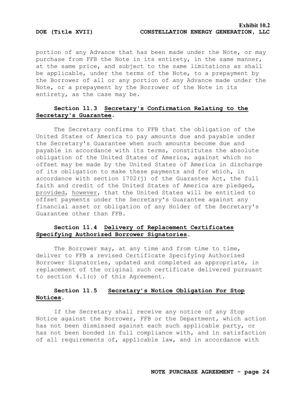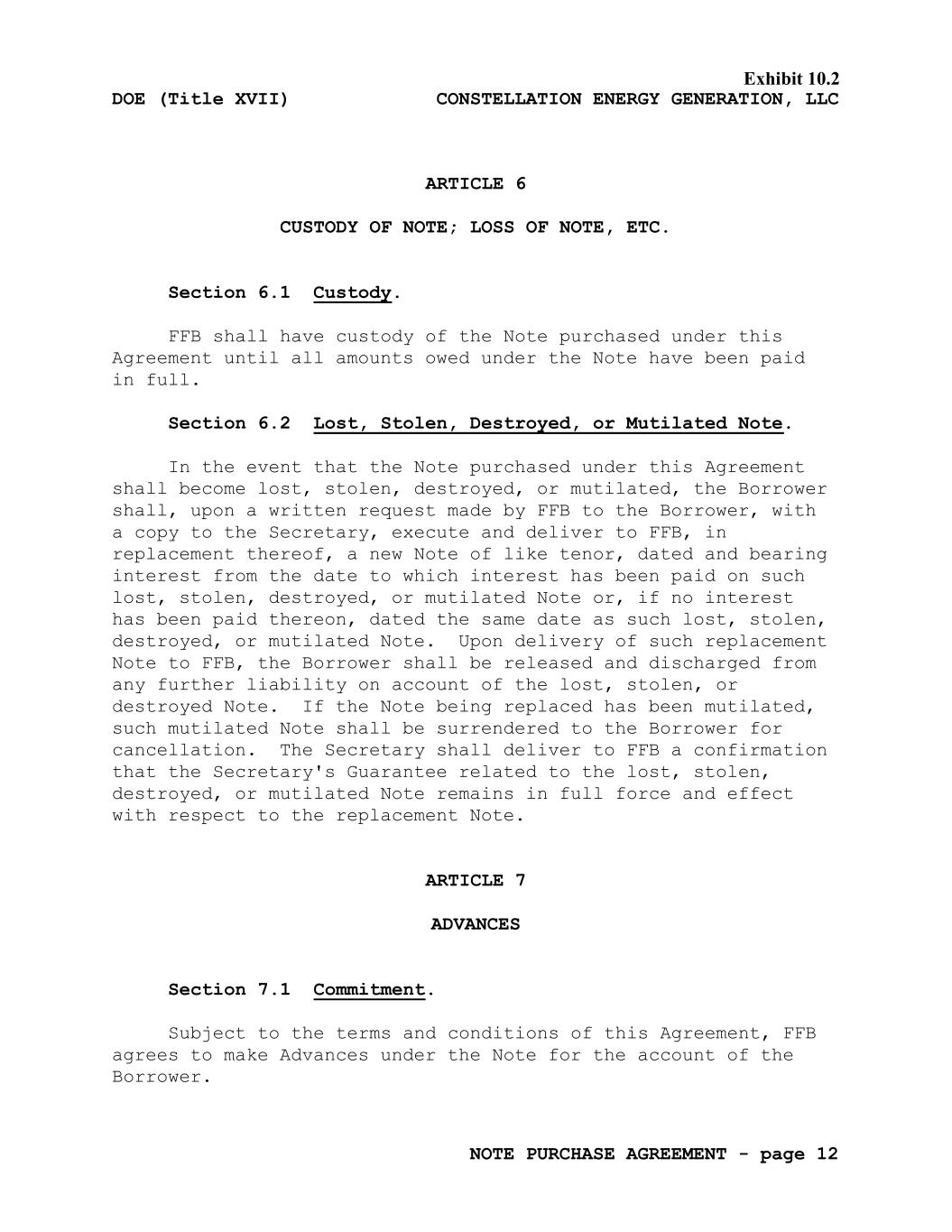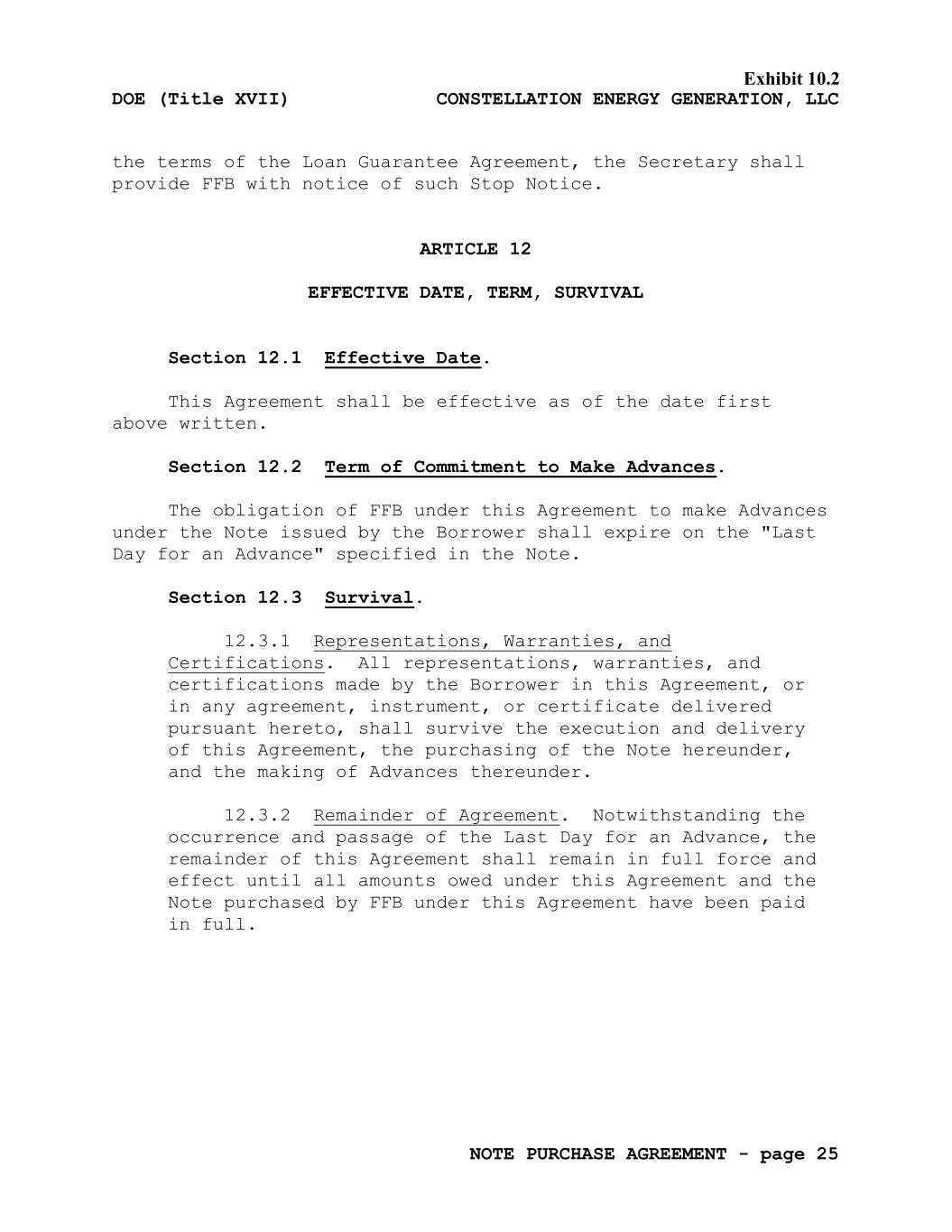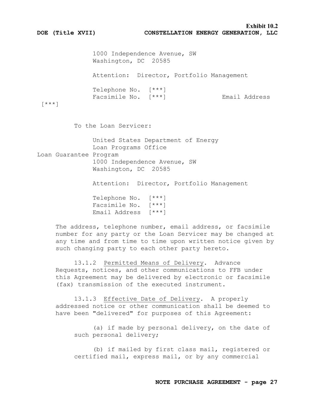 6 [***] = Certain information has been excluded from this exhibit because it is both not material and the type that the registrant treats as private or confidential. (i) Satisfaction of Conditions. Promptly after receipt of an Advance Request complying with Section 2.03(a) (Advance Requests), DOE shall review such Advance Request to determine whether all certificates and documentation required to be attached thereto have been delivered to it. (ii) Advance Request Approval Notice. With respect to any Advance under the FFB Documents, if DOE determines that: (x) the Advance Request has been satisfactorily completed pursuant to Section 2.03 (Mechanics for Requesting Advances) and this Section 2.04 (Mechanics for Funding Advances); and (y) all conditions precedent set forth in Section 5.03 (Advance Approval Conditions Precedent) in respect of the requested Advance have been satisfied (or waived in writing), then DOE shall issue to FFB an Advance Request Approval Notice no later than five (5) Business Days prior to the Requested Advance Date. (iii) Funding. For any requested Advance for which an Advance Request Approval Notice has been issued pursuant to this Section 2.04(a) (Advance Funding) and for which no Drawstop Notice has been issued pursuant to Section 2.04(b) (Drawstop Notices), FFB shall fund such Advance on the Requested Advance Date in accordance with the FFB Note Purchase Agreement and the FFB Note. Such funds shall be applied as specified in the FFB Documents and in accordance with Section 2.04(d) (Disbursement of Proceeds); provided, that if any Drawstop Notice has been issued and is in effect on the Requested Advance Date with respect to any funds received by the Borrower, such funds (together with any additional amounts due thereon or arising therefrom) shall be returned by the Borrower to FFB pursuant to Section 2.04(b) (Drawstop Notices). (b) Drawstop Notices. (i) Issuance. Following the issuance of any Advance Request Approval Notice by DOE pursuant to Section 2.04(a)(ii) (Advance Request Approval Notice) and prior to the Requested Advance Date, DOE or FFB may, from time to time, issue a notice substantially in the form attached hereto as Exhibit B (Form of Drawstop Notice) (a “Drawstop Notice”) to the Borrower and to DOE or FFB, as the case may be, if and only if DOE or FFB, as the case may be, determines that: (A) any condition set forth in Section 5.03 (Advance Approval Conditions Precedent) and Section 5.04 (Conditions Precedent to FFB Advance), as applicable, with respect to such Advance is not met; or (B) to the extent the Advance Request Approval Notice has been issued for any Advance under the FFB Note and the FFB Note Purchase Agreement, the conditions precedent to such Advance contained in the FFB Note and the FFB Note Purchase Agreement are not met. (ii) Consequences. If a Drawstop Notice is issued, FFB shall not be obligated to make the requested Advance set forth on such Drawstop Notice; provided, that if FFB makes any such Advance to the Borrower following the issuance of a Drawstop Notice, the Borrower shall return such Advance to FFB within five (5) Business Days following receipt thereof; and, provided further, that any amount required to be returned by the Borrower pursuant