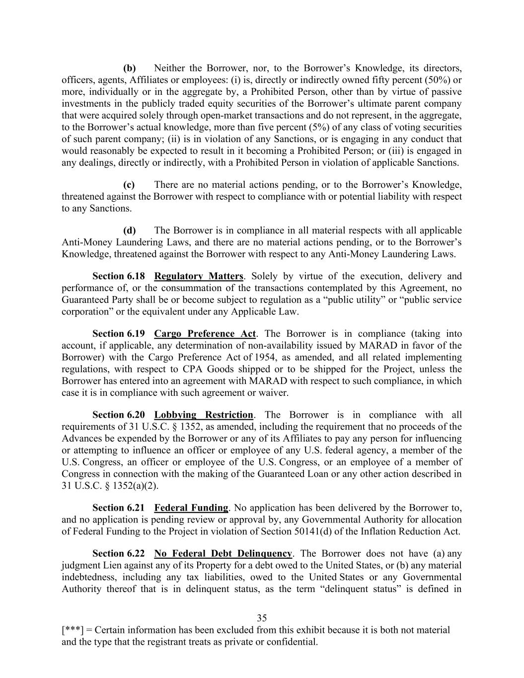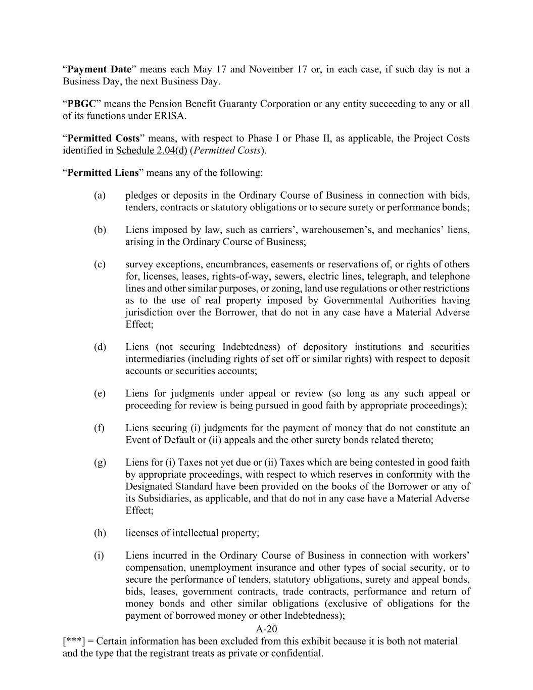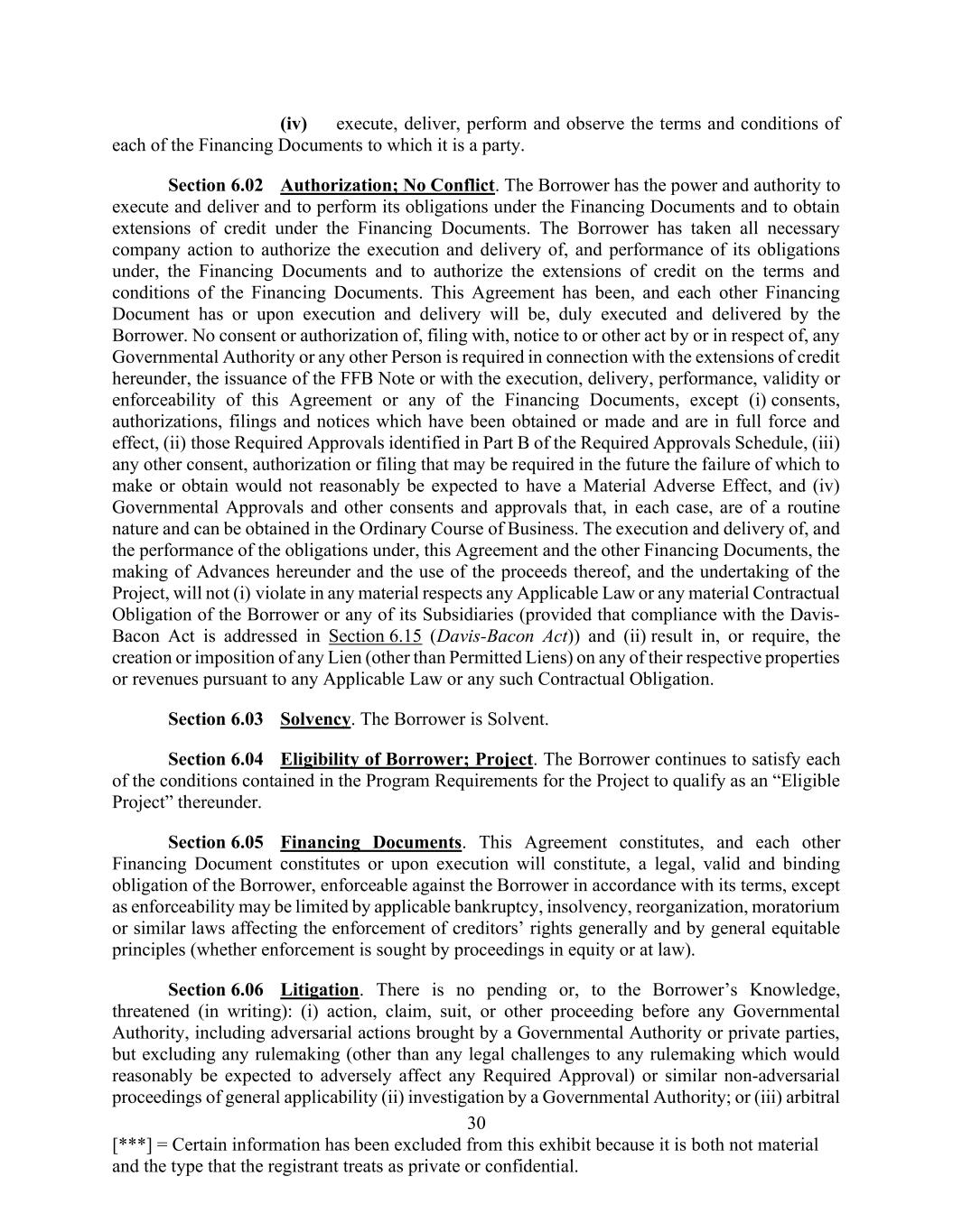 ii [***] = Certain information has been excluded from this exhibit because it is both not material and the type that the registrant treats as private or confidential. Section 6.06 Litigation ................................................................................................... 30 Section 6.07 Required Approvals .................................................................................. 31 Section 6.08 Taxes ......................................................................................................... 31 Section 6.09 Financial Statements ................................................................................. 32 Section 6.10 Ownership of Property .............................................................................. 32 Section 6.11 Investment Company Act ......................................................................... 32 Section 6.12 Margin Stock ............................................................................................. 32 Section 6.13 Anti-Corruption Laws ............................................................................... 33 Section 6.14 Environmental Laws ................................................................................. 33 Section 6.15 Davis-Bacon Act ....................................................................................... 33 Section 6.16 ERISA ....................................................................................................... 34 Section 6.17 Sanctions and Anti-Money Laundering Laws .......................................... 34 Section 6.18 Regulatory Matters.................................................................................... 35 Section 6.19 Cargo Preference Act ................................................................................ 35 Section 6.20 Lobbying Restriction ................................................................................ 35 Section 6.21 Federal Funding ........................................................................................ 35 Section 6.22 No Federal Debt Delinquency .................................................................. 35 Section 6.23 No Tax-Exempt Indebtedness ................................................................... 36 Section 6.24 Use of Proceeds......................................................................................... 36 Section 6.25 Disclosure ................................................................................................. 36 Section 6.26 Commissions/Contingency Fees ............................................................... 36 Section 6.27 Internal Controls ....................................................................................... 36 Section 6.28 No Default ................................................................................................. 37 Section 6.29 No Material Adverse Effect ...................................................................... 37 Section 6.30 Cybersecurity ............................................................................................ 37 ARTICLE VII AFFIRMATIVE COVENANTS .......................................................................... 37 Section 7.01 Maintenance of Existence; Property; Etc. ................................................. 37 Section 7.02 Insurance ................................................................................................... 37 Section 7.03 Further Assurances.................................................................................... 37 Section 7.04 Taxes ......................................................................................................... 38 Section 7.05 Construction and Operation of the Project................................................ 38 Section 7.06 Use of Proceeds......................................................................................... 38 Section 7.07 Books, Records and Inspections ............................................................... 38 Section 7.08 Davis-Bacon Act ....................................................................................... 40 Section 7.09 Lobbying Restriction ................................................................................ 41 Section 7.10 Cargo Preference Act ................................................................................ 41 Section 7.11 Compliance with Applicable Laws ........................................................... 42 Section 7.12 Internal Controls ....................................................................................... 42 Section 7.13 SAM Registration ..................................................................................... 43 Section 7.14 Environmental Laws ................................................................................. 43 Section 7.15 Maintenance of Licenses, etc. ................................................................... 43 Section 7.16 Public Announcements ............................................................................. 43 Section 7.17 Prohibited Persons .................................................................................... 43 Section 7.18 Maintenance of Credit Rating ................................................................... 44 Section 7.19 MFN Provision.......................................................................................... 44
