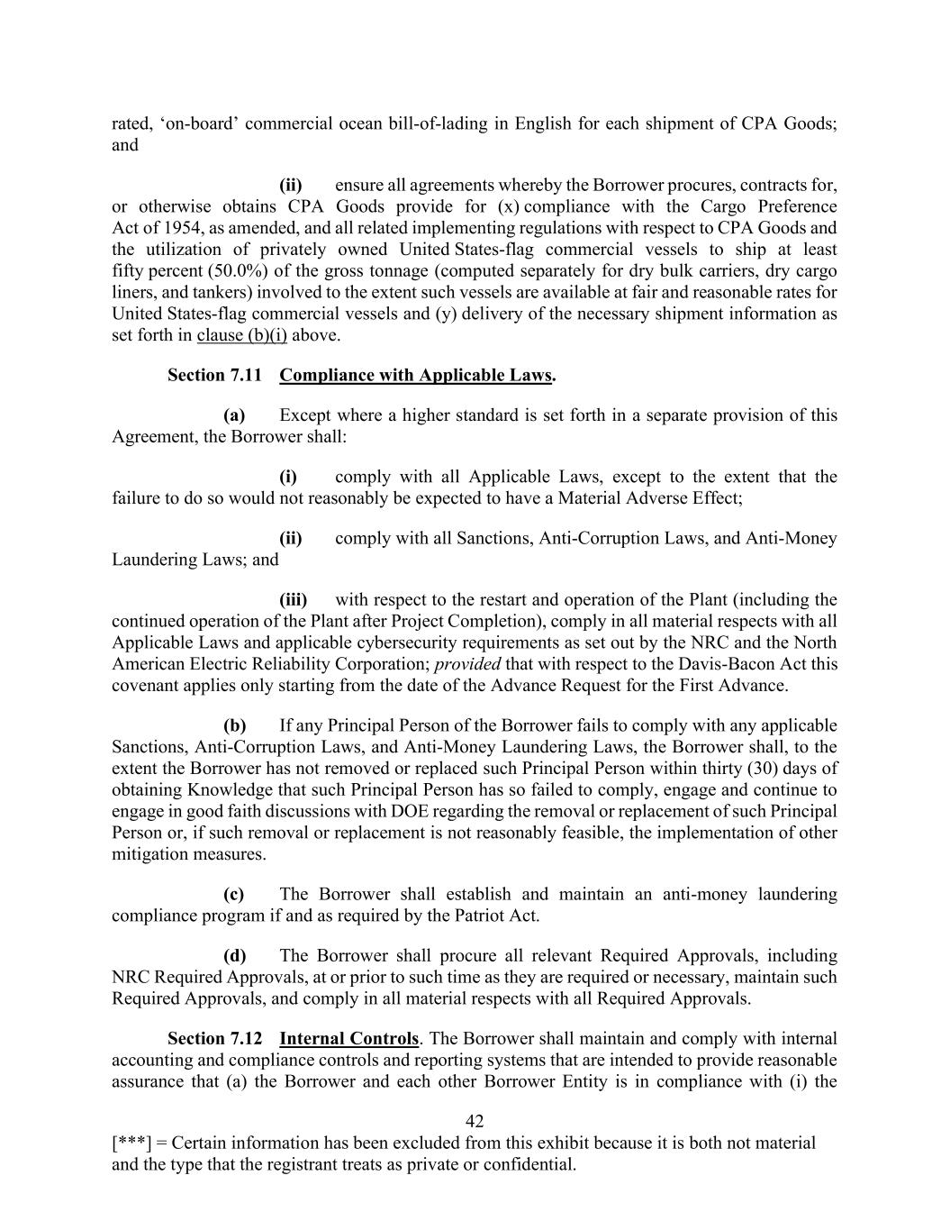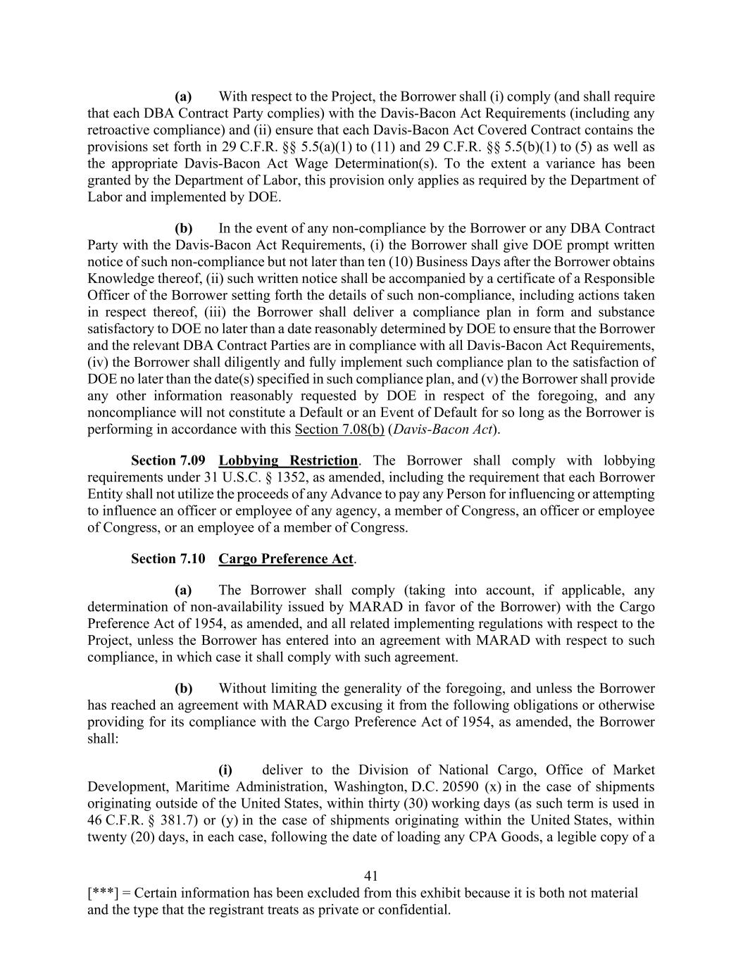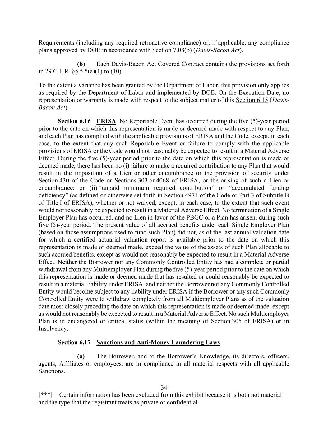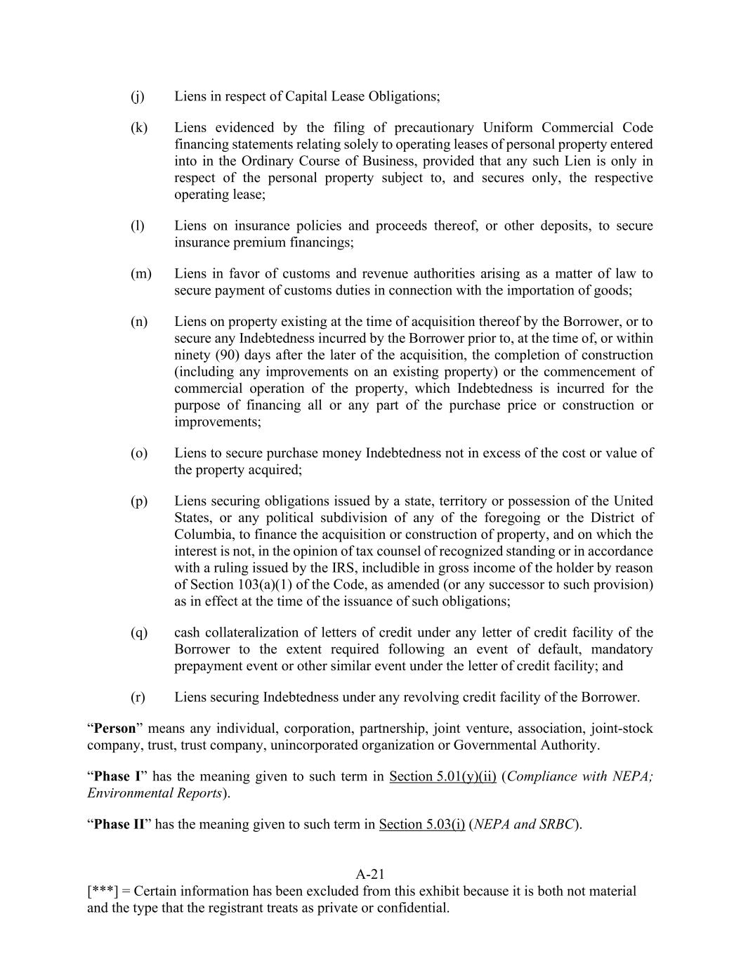 ii [***] = Certain information has been excluded from this exhibit because it is both not material and the type that the registrant treats as private or confidential. Section 6.06 Litigation ................................................................................................... 30 Section 6.07 Required Approvals .................................................................................. 31 Section 6.08 Taxes ......................................................................................................... 31 Section 6.09 Financial Statements ................................................................................. 32 Section 6.10 Ownership of Property .............................................................................. 32 Section 6.11 Investment Company Act ......................................................................... 32 Section 6.12 Margin Stock ............................................................................................. 32 Section 6.13 Anti-Corruption Laws ............................................................................... 33 Section 6.14 Environmental Laws ................................................................................. 33 Section 6.15 Davis-Bacon Act ....................................................................................... 33 Section 6.16 ERISA ....................................................................................................... 34 Section 6.17 Sanctions and Anti-Money Laundering Laws .......................................... 34 Section 6.18 Regulatory Matters.................................................................................... 35 Section 6.19 Cargo Preference Act ................................................................................ 35 Section 6.20 Lobbying Restriction ................................................................................ 35 Section 6.21 Federal Funding ........................................................................................ 35 Section 6.22 No Federal Debt Delinquency .................................................................. 35 Section 6.23 No Tax-Exempt Indebtedness ................................................................... 36 Section 6.24 Use of Proceeds......................................................................................... 36 Section 6.25 Disclosure ................................................................................................. 36 Section 6.26 Commissions/Contingency Fees ............................................................... 36 Section 6.27 Internal Controls ....................................................................................... 36 Section 6.28 No Default ................................................................................................. 37 Section 6.29 No Material Adverse Effect ...................................................................... 37 Section 6.30 Cybersecurity ............................................................................................ 37 ARTICLE VII AFFIRMATIVE COVENANTS .......................................................................... 37 Section 7.01 Maintenance of Existence; Property; Etc. ................................................. 37 Section 7.02 Insurance ................................................................................................... 37 Section 7.03 Further Assurances.................................................................................... 37 Section 7.04 Taxes ......................................................................................................... 38 Section 7.05 Construction and Operation of the Project................................................ 38 Section 7.06 Use of Proceeds......................................................................................... 38 Section 7.07 Books, Records and Inspections ............................................................... 38 Section 7.08 Davis-Bacon Act ....................................................................................... 40 Section 7.09 Lobbying Restriction ................................................................................ 41 Section 7.10 Cargo Preference Act ................................................................................ 41 Section 7.11 Compliance with Applicable Laws ........................................................... 42 Section 7.12 Internal Controls ....................................................................................... 42 Section 7.13 SAM Registration ..................................................................................... 43 Section 7.14 Environmental Laws ................................................................................. 43 Section 7.15 Maintenance of Licenses, etc. ................................................................... 43 Section 7.16 Public Announcements ............................................................................. 43 Section 7.17 Prohibited Persons .................................................................................... 43 Section 7.18 Maintenance of Credit Rating ................................................................... 44 Section 7.19 MFN Provision.......................................................................................... 44