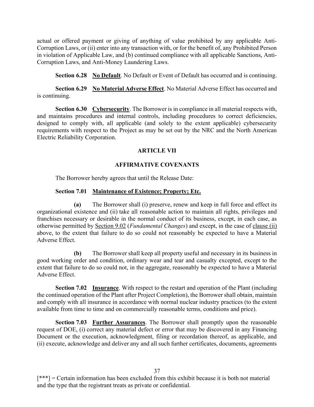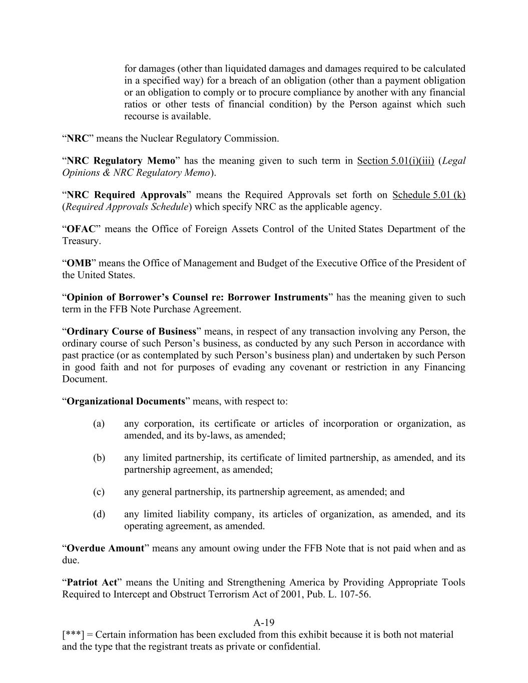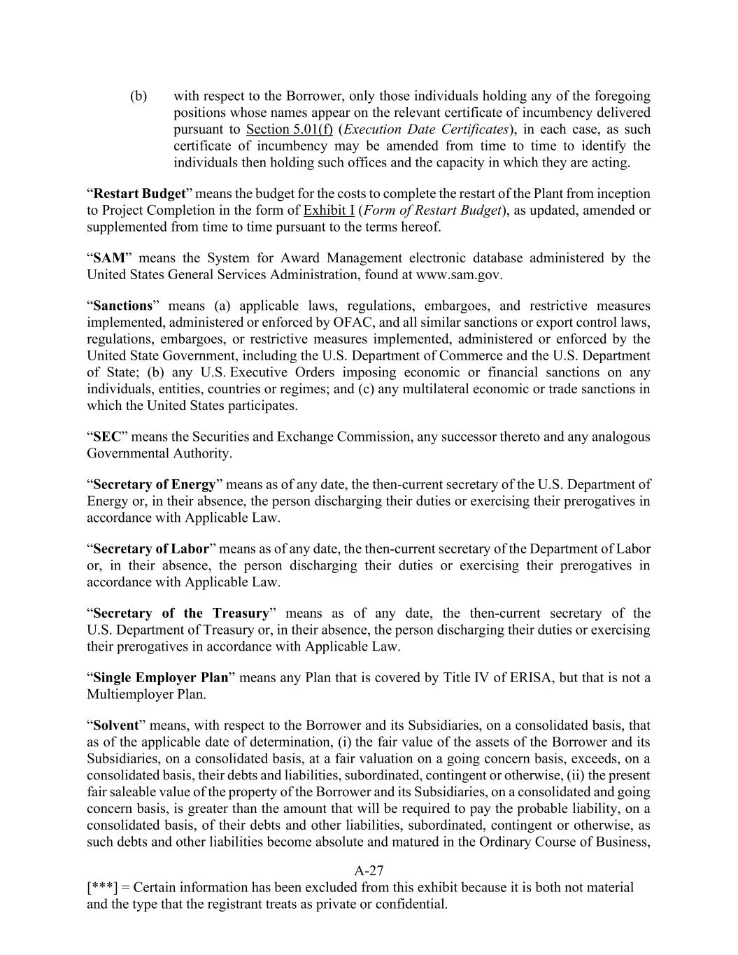 iv [***] = Certain information has been excluded from this exhibit because it is both not material and the type that the registrant treats as private or confidential. Section 11.20 Independence of Covenants .................................................................... 64 Section 11.21 Marshaling .............................................................................................. 64 Section 11.22 Cooperation Regarding DOE Announcements ....................................... 64 ANNEXES, SCHEDULES AND EXHIBITS Annex A Definitions Schedule 2.04(d) Permitted Costs Schedule 5.01(k) Required Approvals Schedule Schedule 5.01(z) Project Milestone Schedule Schedule 9.09(a) Debarment Regulations Schedule Schedule 11.04 Notices Exhibit A Form of Advance Request Exhibit B Form of Drawstop Notice Exhibit C Form of Officer’s Certificate Exhibit D Form of Closing Certificate Exhibit E Form of Tax Certificate Exhibit F Davis-Bacon Act Contract Provisions Exhibit G Form of Compliance Certificate Exhibit H Form of Monthly Restart Progress Report Exhibit I Form of Restart Budget Exhibit J Form of Project Completion Certificate