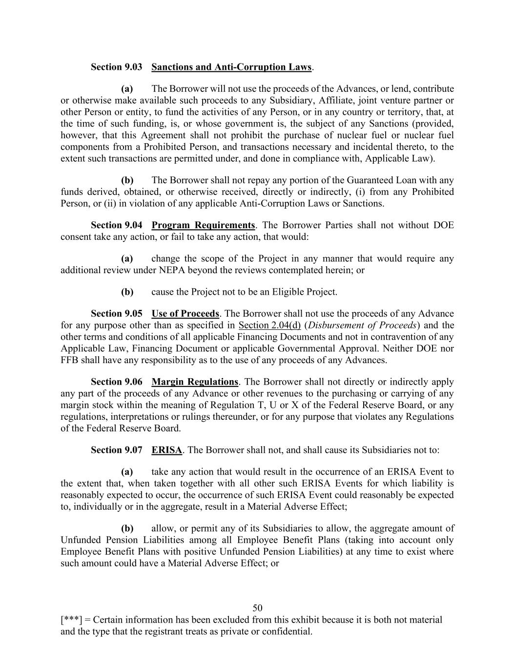 8 [***] = Certain information has been excluded from this exhibit because it is both not material and the type that the registrant treats as private or confidential. (d) Disbursement of Proceeds. (i) The Borrower shall apply the proceeds of any Advance solely to reimburse the Borrower for Eligible Project Costs previously incurred and either expended or accrued by the Borrower, as evidenced by accruals, invoices or other documentation delivered in connection with the applicable Advance Request under Section 2.03(a) (Advance Requests). (ii) In no event shall the proceeds of the Advances be: (A) applied towards any portion of the Project Costs incurred prior to the Eligibility Effective Date; (B) used to pay interest payments on the Guaranteed Loan or programmatic fees charged by or paid to DOE relating to the Guaranteed Loan; (C) used to pay any portion of the Project Costs that are not Permitted Costs at the time of the Advance Request; or (D) used to pay any portion of Project Costs that are not Eligible Project Costs. Section 2.05 Advance Requirements under the FFB Documents. Notwithstanding anything to the contrary contained in this Article II (Funding), the Borrower shall comply with each disbursement requirement set forth in the FFB Documents. Unless otherwise specified in the FFB Documents, all determinations to be made with respect to the FFB Documents shall be made by DOE. Section 2.06 No Approval of Work. The making of any Advance or Advances under the Financing Documents shall not be deemed an approval or acceptance by any Guaranteed Party of any work, labor, supplies, materials or equipment furnished or supplied with respect to the Project. Section 2.07 Determination of Advance Amounts. As of any date of any requested Advance, after giving effect to the Advance: (a) the aggregate outstanding principal amount of all Advances then made to the Borrower under the FFB Note (including, for the avoidance of doubt, the principal amount of such requested Advance) shall not exceed eighty percent (80%) of the amount of Eligible Project Costs incurred and either expended or accrued on or prior to the date of such requested Advance; and (b) the aggregate outstanding principal amount of all Advances shall not exceed the Guaranteed Loan Commitment Amount (collectively, clauses (a) and (b) are referred to as the “Debt Sizing Parameters”).