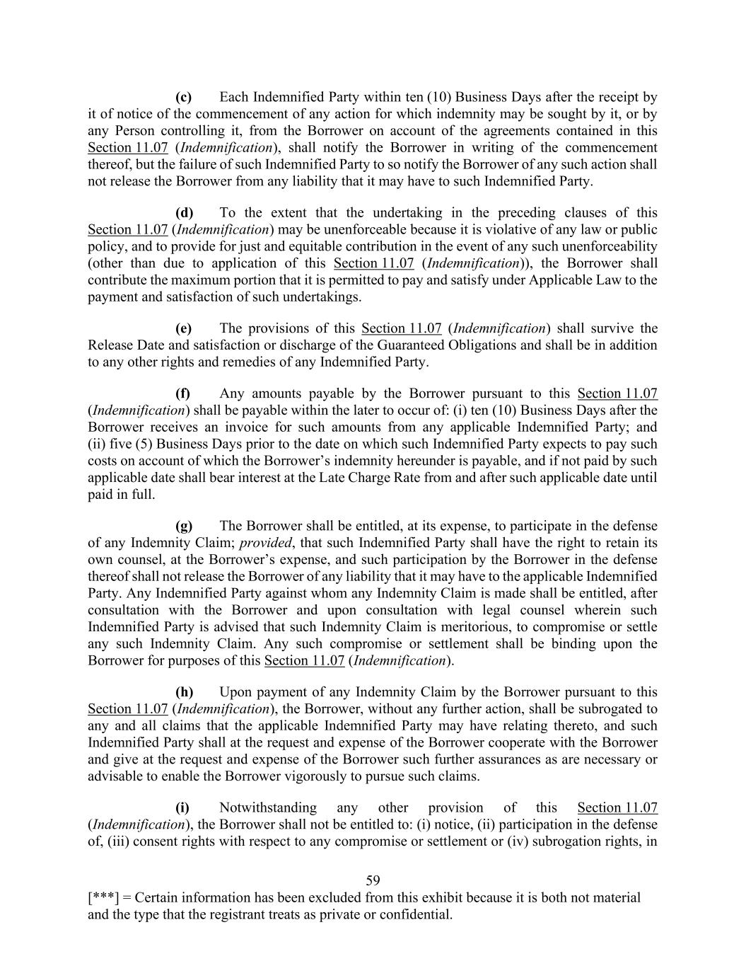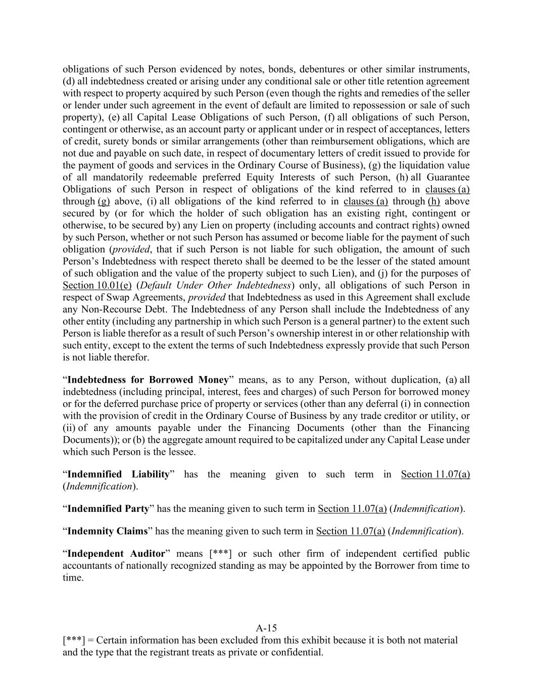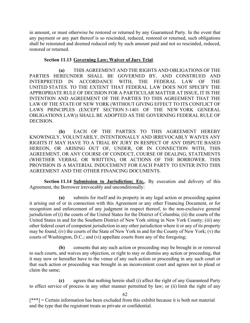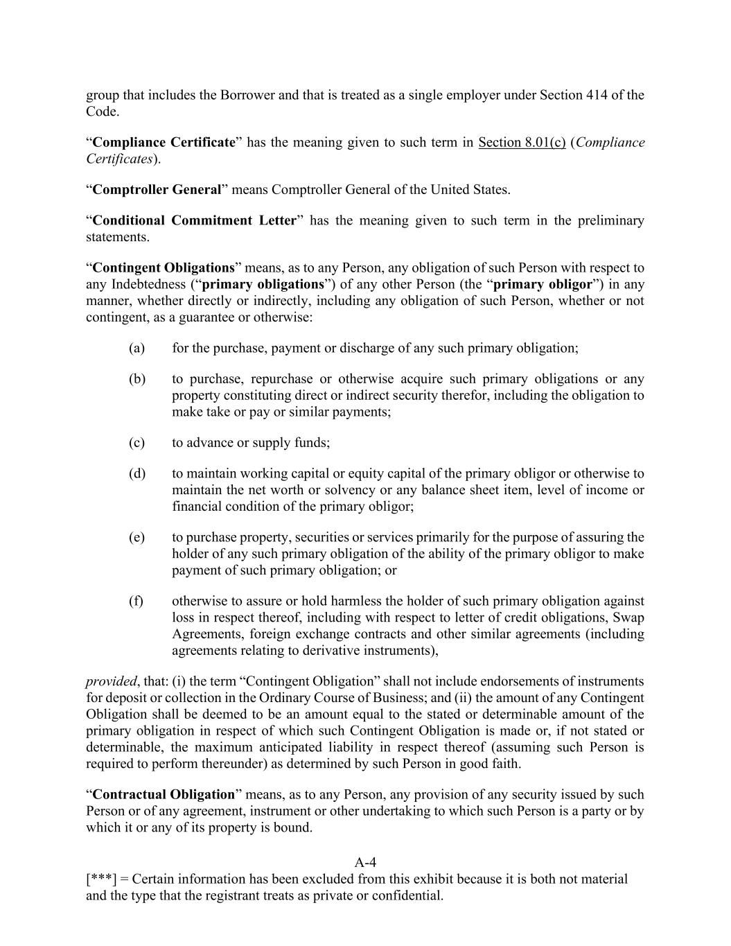 iii [***] = Certain information has been excluded from this exhibit because it is both not material and the type that the registrant treats as private or confidential. Section 7.20 Compliance with Program Requirements ................................................. 44 ARTICLE VIII INFORMATION COVENANTS ....................................................................... 44 Section 8.01 Financial Statements ................................................................................. 44 Section 8.02 Reporting................................................................................................... 46 Section 8.03 Notices ...................................................................................................... 47 Section 8.04 Other Information ..................................................................................... 48 ARTICLE IX NEGATIVE COVENANTS .................................................................................. 49 Section 9.01 Liens .......................................................................................................... 49 Section 9.02 Fundamental Changes ............................................................................... 49 Section 9.03 Sanctions and Anti-Corruption Laws........................................................ 50 Section 9.04 Program Requirements.............................................................................. 50 Section 9.05 Use of Proceeds......................................................................................... 50 Section 9.06 Margin Regulations ................................................................................... 50 Section 9.07 ERISA ....................................................................................................... 50 Section 9.08 Investment Company Act ......................................................................... 51 Section 9.09 Debarment Regulations. ............................................................................ 51 Section 9.10 Prohibited Person ...................................................................................... 51 Section 9.11 No Federal Funding .................................................................................. 51 Section 9.12 Financial Covenant Test ........................................................................... 51 ARTICLE X EVENTS OF DEFAULT AND REMEDIES ......................................................... 52 Section 10.01 Events of Default .................................................................................... 52 Section 10.02 Remedies; Waivers ................................................................................. 54 Section 10.03 Accelerated Advances ............................................................................. 55 ARTICLE XI MISCELLANEOUS .............................................................................................. 56 Section 11.01 Waiver and Amendment ......................................................................... 56 Section 11.02 Right of Set-Off ...................................................................................... 56 Section 11.03 Survival of Representations and Warranties ........................................... 57 Section 11.04 Notices .................................................................................................... 57 Section 11.05 Severability ............................................................................................. 57 Section 11.06 Judgment Currency ................................................................................. 57 Section 11.07 Indemnification ....................................................................................... 58 Section 11.08 Limitation on Liability ............................................................................ 60 Section 11.09 Successors and Assigns........................................................................... 60 Section 11.10 FFB Right to Sell Loan ........................................................................... 61 Section 11.11 Further Assurances and Corrective Instruments ..................................... 61 Section 11.12 Reinstatement .......................................................................................... 61 Section 11.13 Governing Law; Waiver of Jury Trial .................................................... 62 Section 11.14 Submission to Jurisdiction; Etc. .............................................................. 62 Section 11.15 Entire Agreement .................................................................................... 63 Section 11.16 Benefits of Agreement ............................................................................ 63 Section 11.17 Headings ................................................................................................. 63 Section 11.18 Counterparts; Electronic Signatures ....................................................... 63 Section 11.19 No Partnership; Etc. ................................................................................ 64