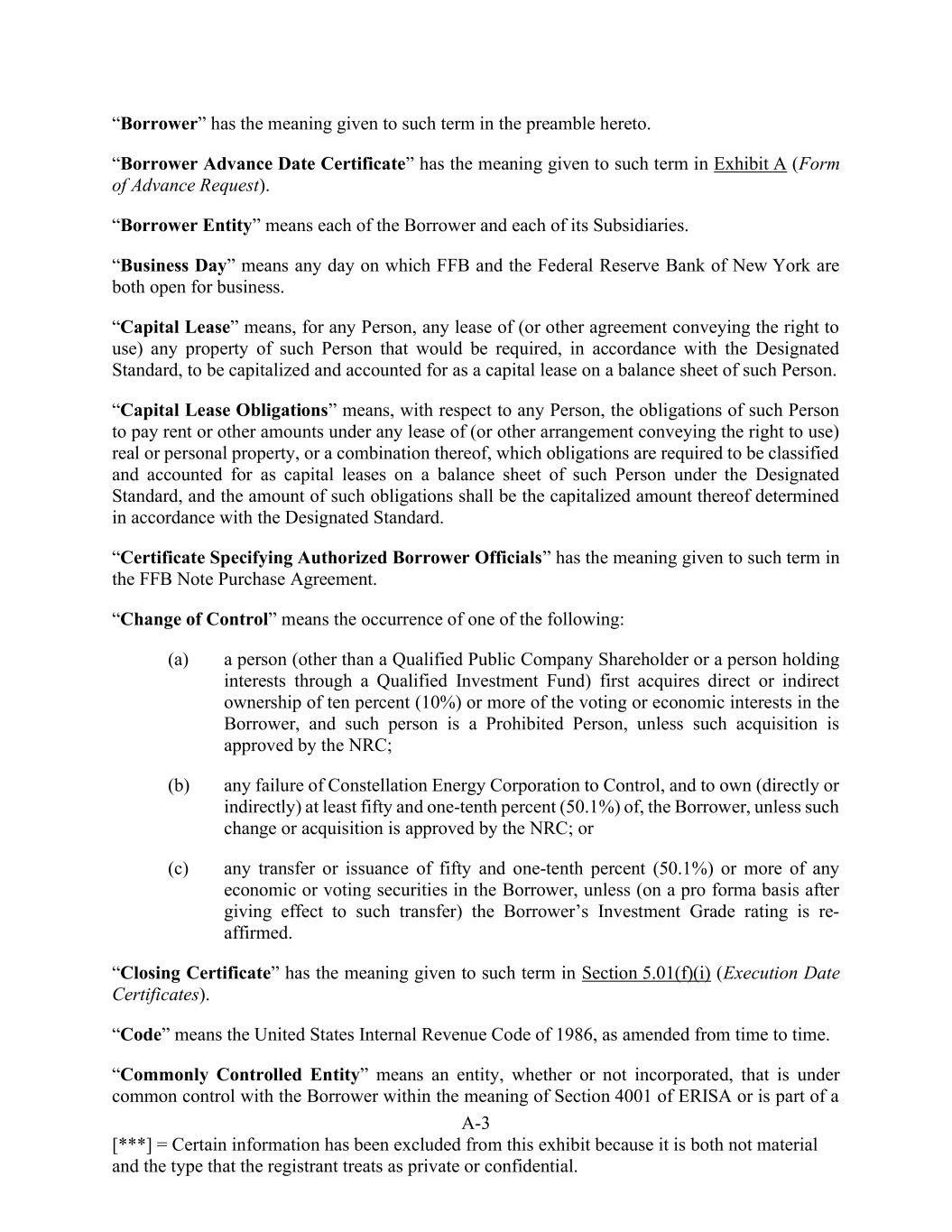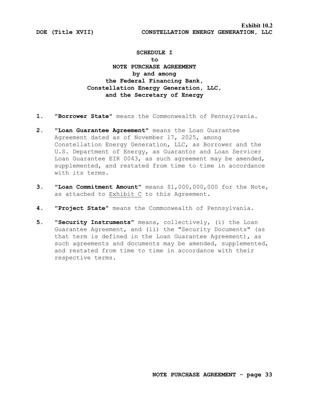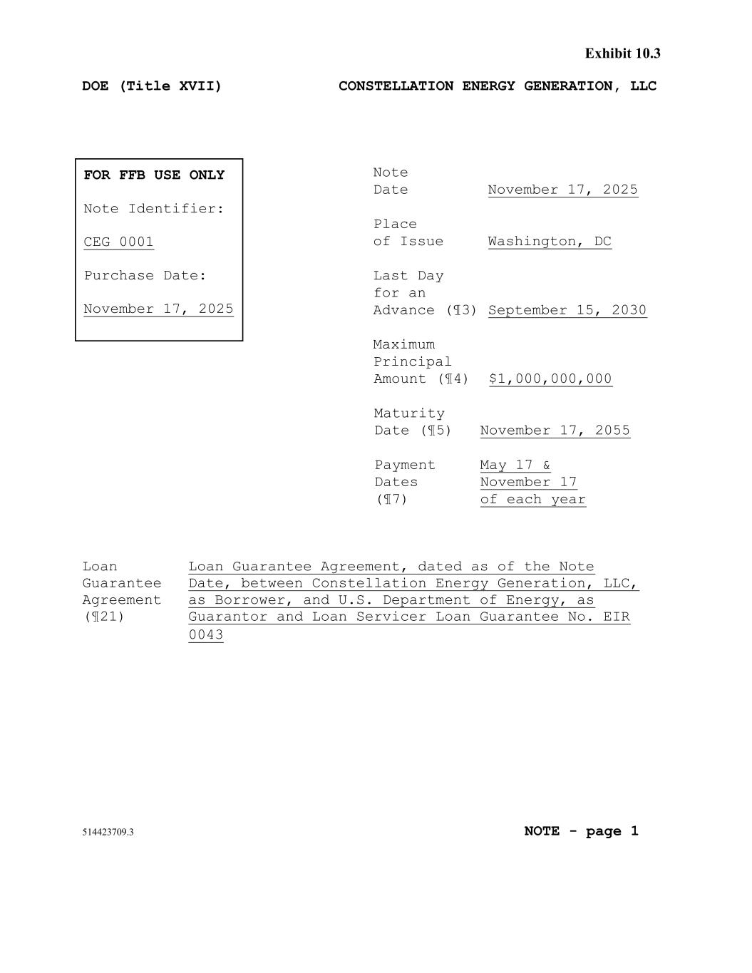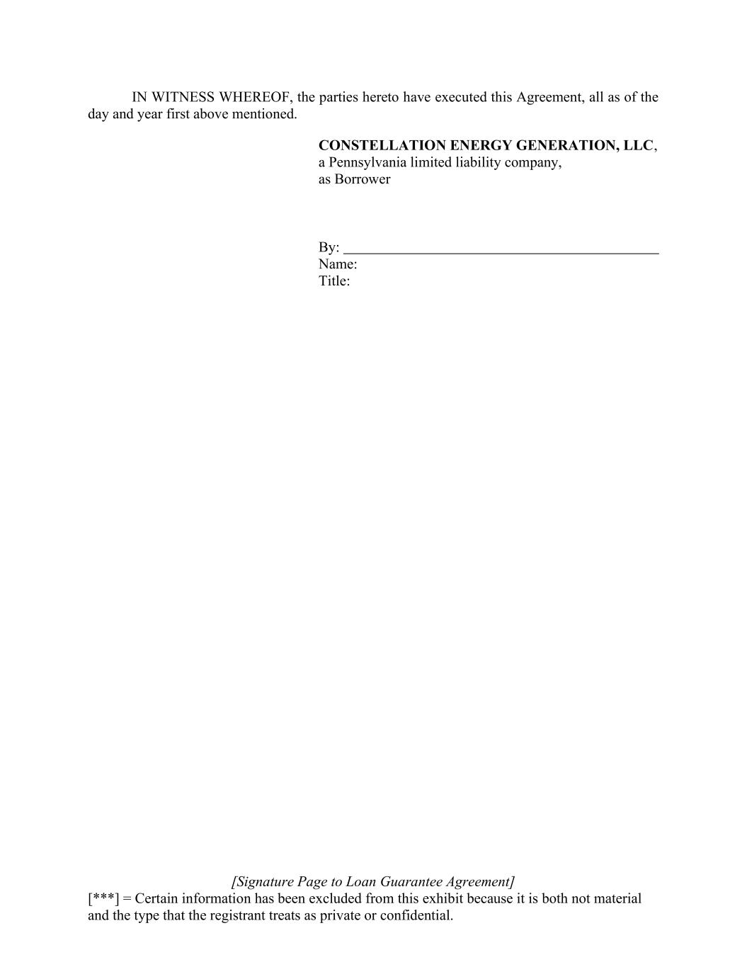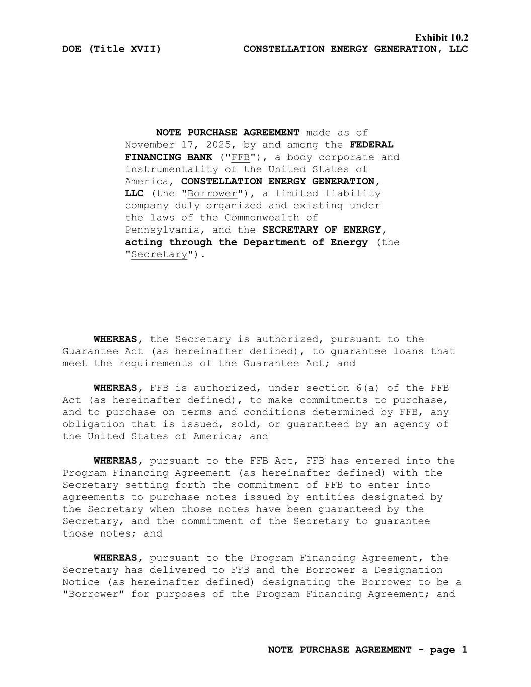 1 [***] = Certain information has been excluded from this exhibit because it is both not material and the type that the registrant treats as private or confidential. This LOAN GUARANTEE AGREEMENT, dated as of November 17, 2025 (this “Agreement”), is entered into by and between the UNITED STATES DEPARTMENT OF ENERGY, an agency of the United States of America, acting in its capacity as guarantor and loan servicer of the Guaranteed Loan (“DOE”), and CONSTELLATION ENERGY GENERATION, LLC, a limited liability company organized and existing under the laws of the Commonwealth of Pennsylvania (the “Borrower”). PRELIMINARY STATEMENTS (A) DOE has been authorized to issue a guarantee for Federal Financing Bank (“FFB”), a wholly-owned instrumentality of the United States government created by the Federal Financing Bank Act of 1973, as amended, to make loans for the restart and repowering of the Christopher M. Crane Clean Energy Center (f/k/a Three Mile Island Nuclear Station, Unit 1), an 835 MW nuclear generating station located in Londonderry Township, Pennsylvania (the “Plant”), pursuant to Title XVII of the Energy Policy Act of 2005, Pub. L. 109-58, as amended by Pub. L. 117–169, title V, § 50144(c), and as further amended from time to time (“Title XVII”). (B) The Borrower has undertaken, or intends to undertake, the financing, licensing, permitting, development, design, engineering, procurement, restart, testing, startup and commissioning of the Plant (the “Project”). (C) The Borrower submitted an application for the issuance by DOE of a guarantee of a multi- draw term loan facility to be authorized and approved by DOE under Title XVII, subject to the requirements of Section 1706 and the Applicable Regulations. (D) The Borrower and DOE entered into that certain Conditional Commitment Letter, dated as of the date hereof (the “Conditional Commitment Letter”), pursuant to which DOE agreed to arrange for FFB to purchase the FFB Note from the Borrower and to make Advances from time to time thereunder, in each case, upon the terms and subject to the conditions of this Agreement and the other Financing Documents. (E) Subject to the terms and conditions hereof, DOE will, in connection with arranging financing for the Borrower from FFB, issue and deliver to FFB the DOE Guarantee pursuant to which it will guarantee the Borrower’s repayment of principal and interest on the Advances as and when required pursuant to the FFB Note and any other liabilities, losses, costs or expenses incurred by FFB from time to time with respect to the FFB Note or the related FFB Note Purchase Agreement. (F) The execution of this Agreement is a condition precedent to DOE’s issuance of the DOE Guarantee, and FFB’s receipt of the DOE Guarantee is a condition precedent to FFB’s execution of the FFB Documents. (G) The parties hereto desire (a) to specify, among other things, the terms and conditions for (i) the delivery by DOE of the DOE Guarantee and other FFB Secretary’s Instruments required for FFB to purchase the FFB Note pursuant to the FFB Note Purchase Agreement; (ii) the delivery by DOE of Advance Request Approval Notices; and (iii) certain indemnity