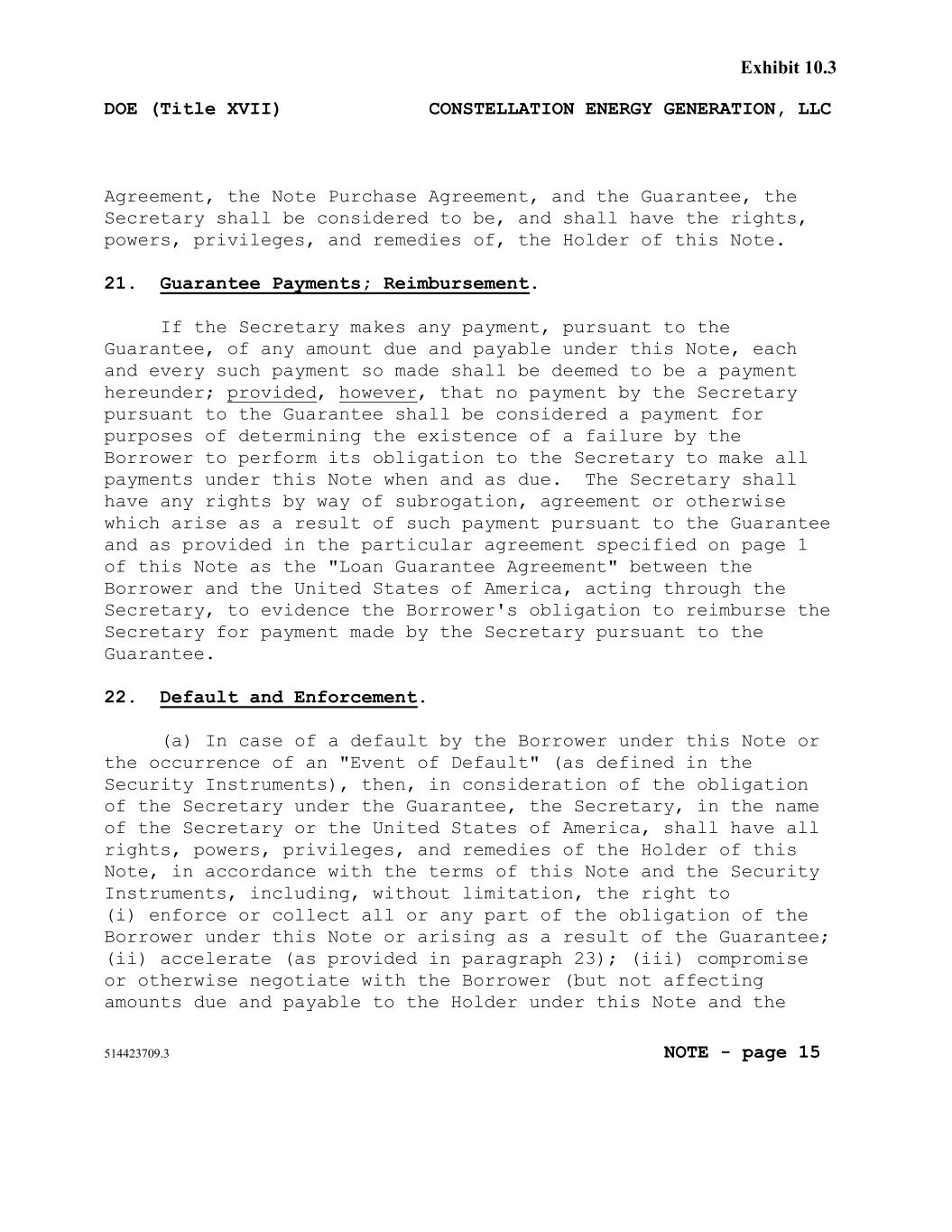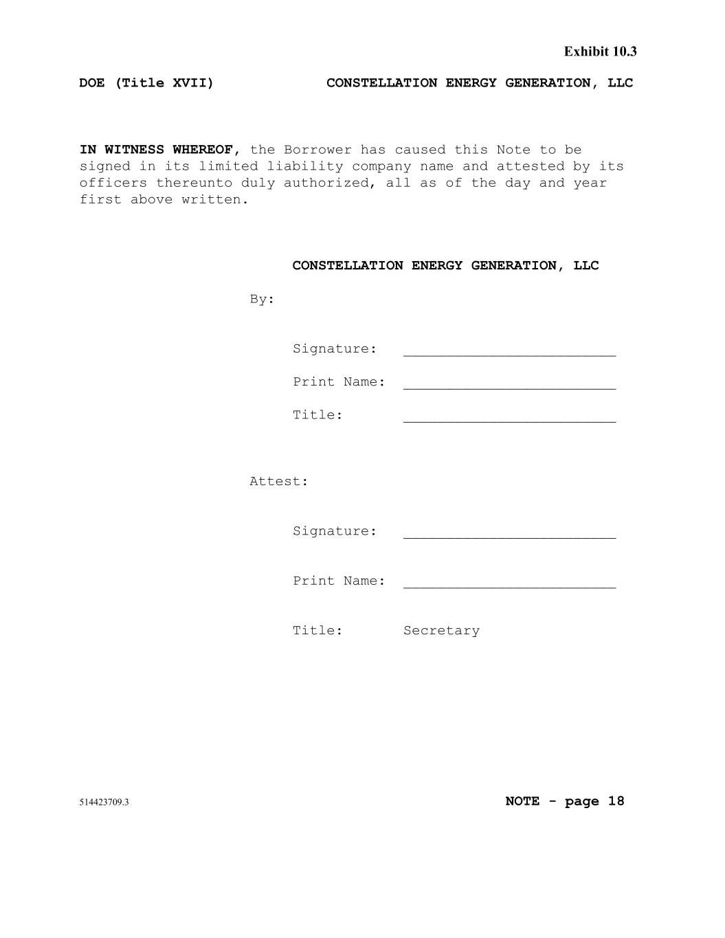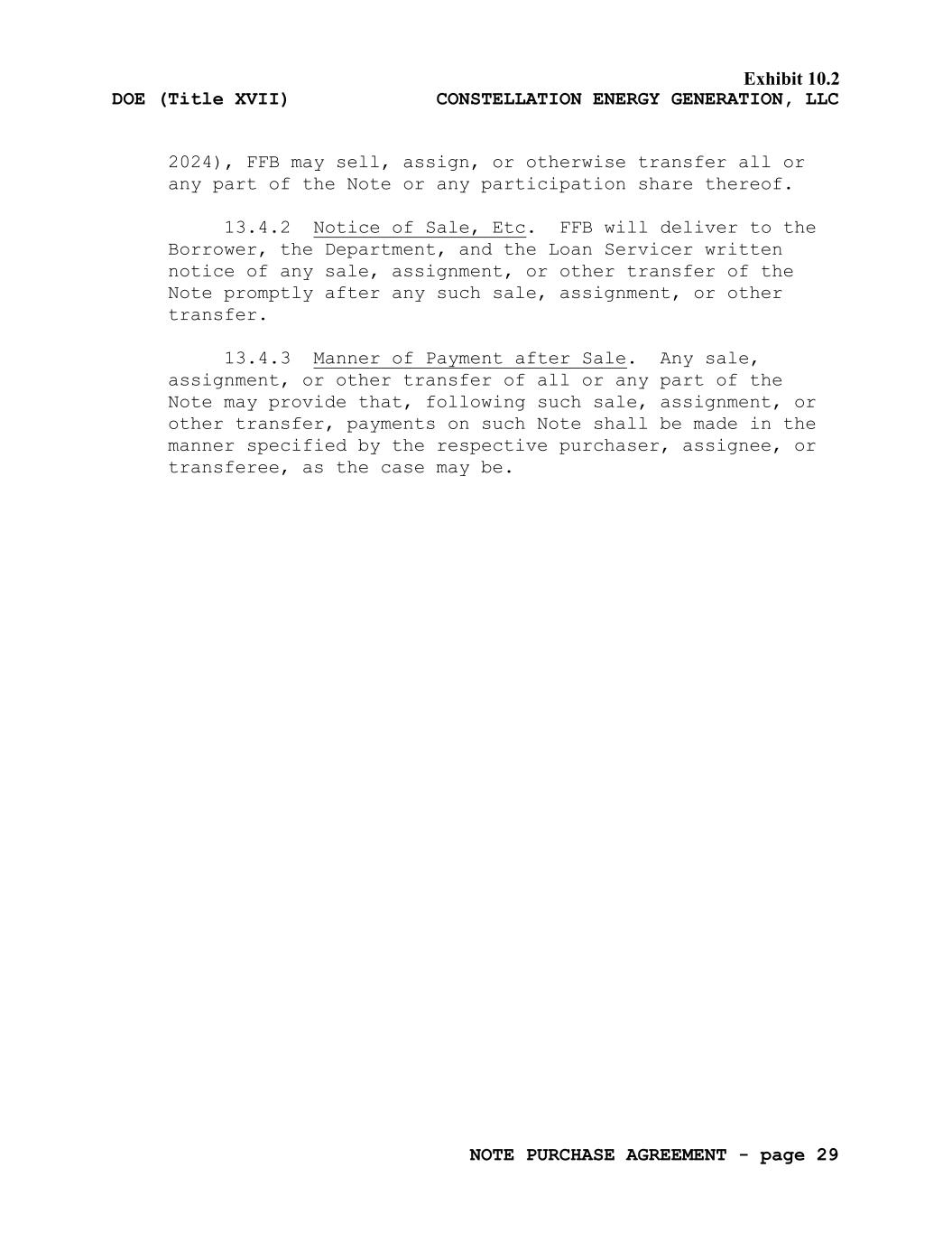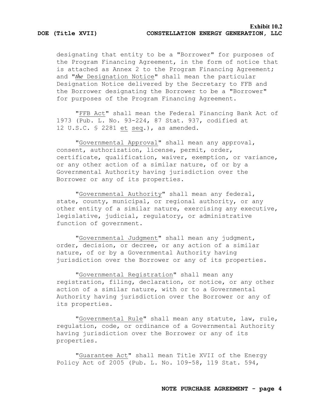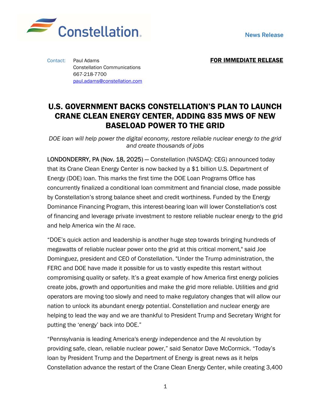 1 [***] = Certain information has been excluded from this exhibit because it is both not material and the type that the registrant treats as private or confidential. This LOAN GUARANTEE AGREEMENT, dated as of November 17, 2025 (this “Agreement”), is entered into by and between the UNITED STATES DEPARTMENT OF ENERGY, an agency of the United States of America, acting in its capacity as guarantor and loan servicer of the Guaranteed Loan (“DOE”), and CONSTELLATION ENERGY GENERATION, LLC, a limited liability company organized and existing under the laws of the Commonwealth of Pennsylvania (the “Borrower”). PRELIMINARY STATEMENTS (A) DOE has been authorized to issue a guarantee for Federal Financing Bank (“FFB”), a wholly-owned instrumentality of the United States government created by the Federal Financing Bank Act of 1973, as amended, to make loans for the restart and repowering of the Christopher M. Crane Clean Energy Center (f/k/a Three Mile Island Nuclear Station, Unit 1), an 835 MW nuclear generating station located in Londonderry Township, Pennsylvania (the “Plant”), pursuant to Title XVII of the Energy Policy Act of 2005, Pub. L. 109-58, as amended by Pub. L. 117–169, title V, § 50144(c), and as further amended from time to time (“Title XVII”). (B) The Borrower has undertaken, or intends to undertake, the financing, licensing, permitting, development, design, engineering, procurement, restart, testing, startup and commissioning of the Plant (the “Project”). (C) The Borrower submitted an application for the issuance by DOE of a guarantee of a multi- draw term loan facility to be authorized and approved by DOE under Title XVII, subject to the requirements of Section 1706 and the Applicable Regulations. (D) The Borrower and DOE entered into that certain Conditional Commitment Letter, dated as of the date hereof (the “Conditional Commitment Letter”), pursuant to which DOE agreed to arrange for FFB to purchase the FFB Note from the Borrower and to make Advances from time to time thereunder, in each case, upon the terms and subject to the conditions of this Agreement and the other Financing Documents. (E) Subject to the terms and conditions hereof, DOE will, in connection with arranging financing for the Borrower from FFB, issue and deliver to FFB the DOE Guarantee pursuant to which it will guarantee the Borrower’s repayment of principal and interest on the Advances as and when required pursuant to the FFB Note and any other liabilities, losses, costs or expenses incurred by FFB from time to time with respect to the FFB Note or the related FFB Note Purchase Agreement. (F) The execution of this Agreement is a condition precedent to DOE’s issuance of the DOE Guarantee, and FFB’s receipt of the DOE Guarantee is a condition precedent to FFB’s execution of the FFB Documents. (G) The parties hereto desire (a) to specify, among other things, the terms and conditions for (i) the delivery by DOE of the DOE Guarantee and other FFB Secretary’s Instruments required for FFB to purchase the FFB Note pursuant to the FFB Note Purchase Agreement; (ii) the delivery by DOE of Advance Request Approval Notices; and (iii) certain indemnity