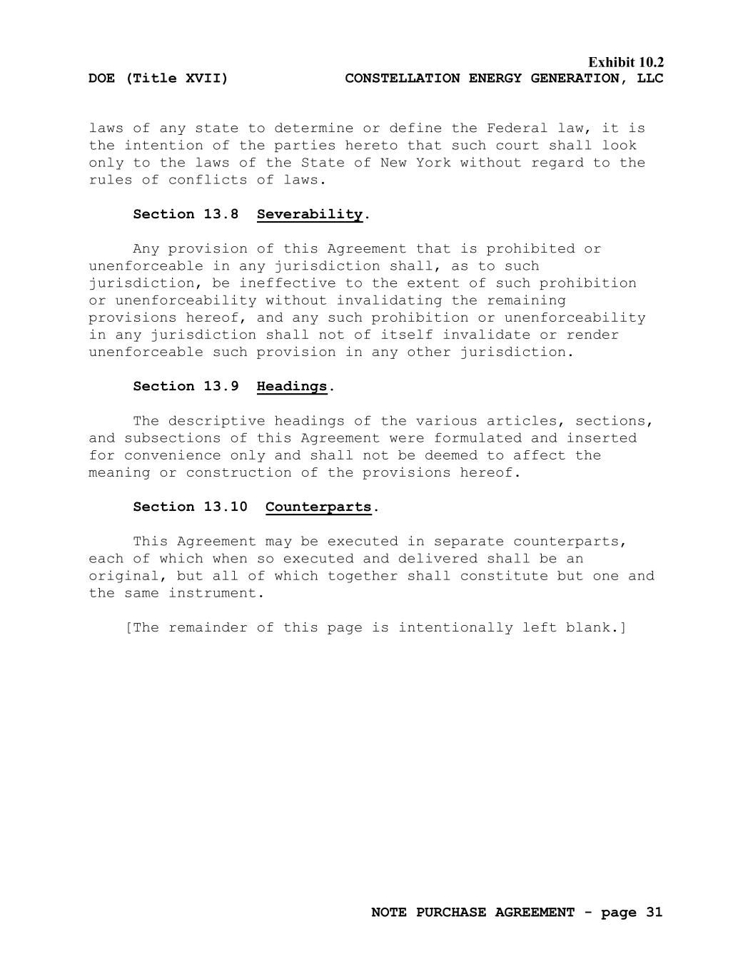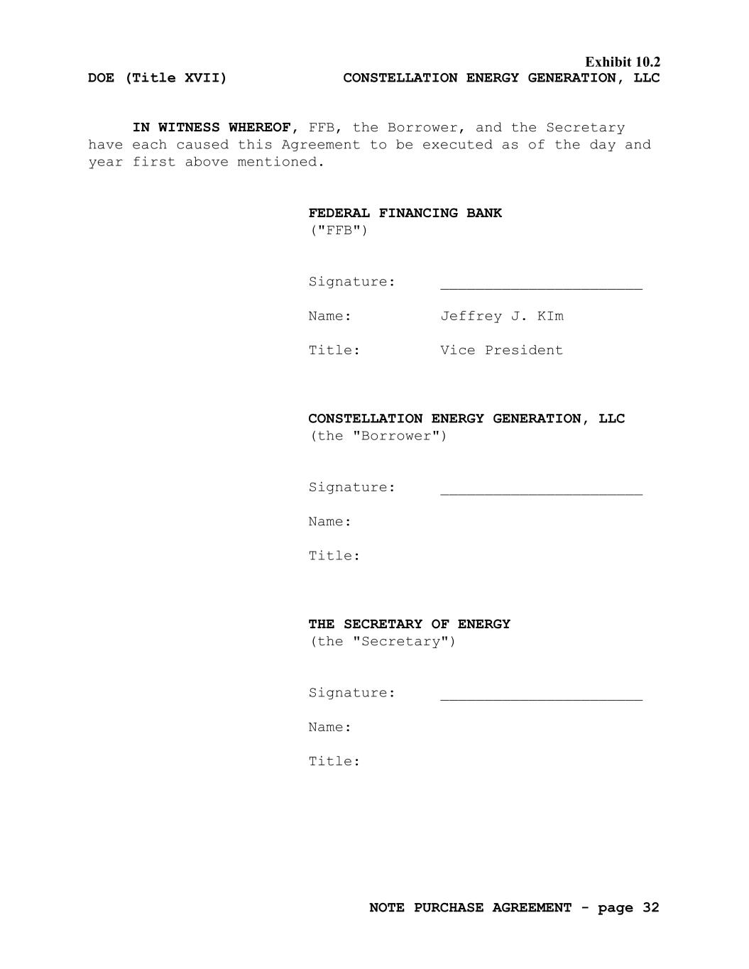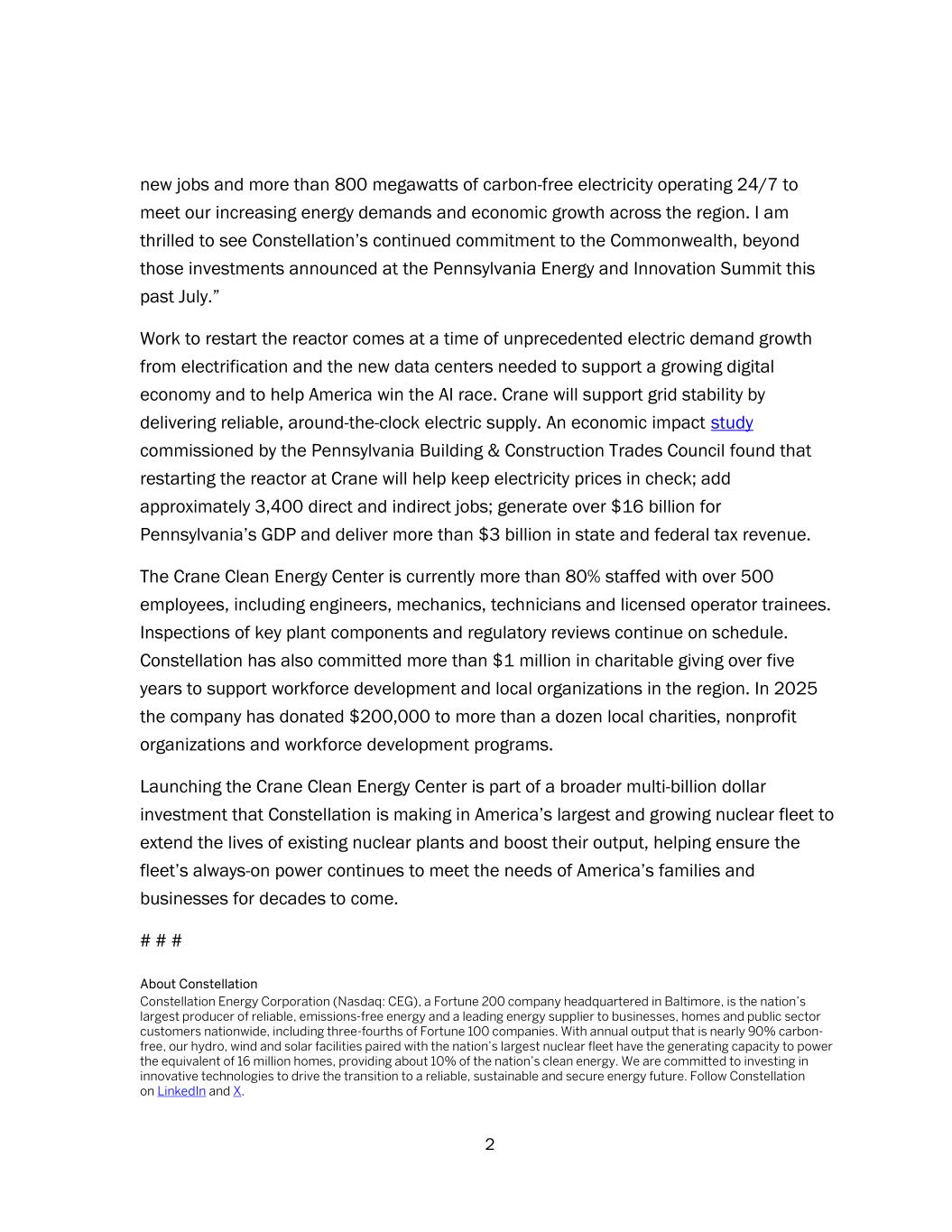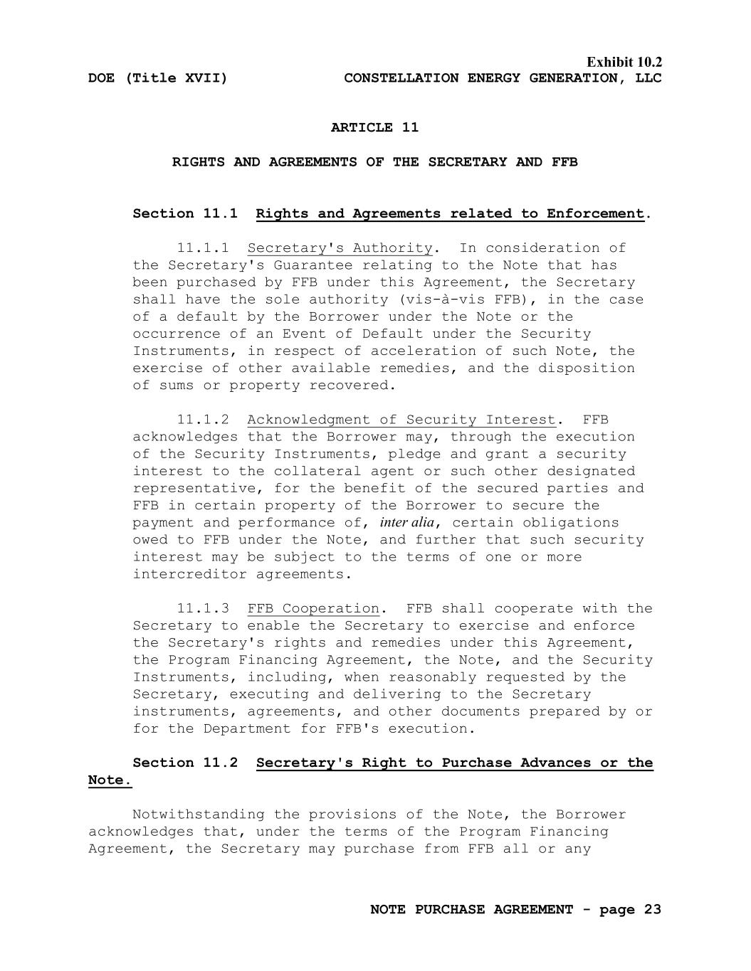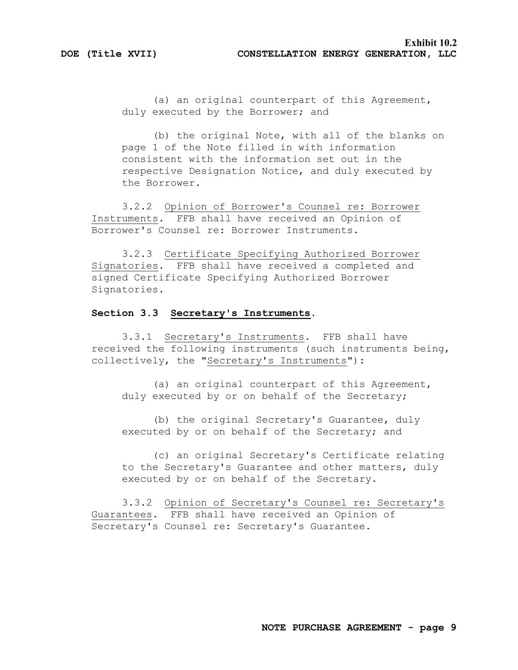 1 [***] = Certain information has been excluded from this exhibit because it is both not material and the type that the registrant treats as private or confidential. This LOAN GUARANTEE AGREEMENT, dated as of November 17, 2025 (this “Agreement”), is entered into by and between the UNITED STATES DEPARTMENT OF ENERGY, an agency of the United States of America, acting in its capacity as guarantor and loan servicer of the Guaranteed Loan (“DOE”), and CONSTELLATION ENERGY GENERATION, LLC, a limited liability company organized and existing under the laws of the Commonwealth of Pennsylvania (the “Borrower”). PRELIMINARY STATEMENTS (A) DOE has been authorized to issue a guarantee for Federal Financing Bank (“FFB”), a wholly-owned instrumentality of the United States government created by the Federal Financing Bank Act of 1973, as amended, to make loans for the restart and repowering of the Christopher M. Crane Clean Energy Center (f/k/a Three Mile Island Nuclear Station, Unit 1), an 835 MW nuclear generating station located in Londonderry Township, Pennsylvania (the “Plant”), pursuant to Title XVII of the Energy Policy Act of 2005, Pub. L. 109-58, as amended by Pub. L. 117–169, title V, § 50144(c), and as further amended from time to time (“Title XVII”). (B) The Borrower has undertaken, or intends to undertake, the financing, licensing, permitting, development, design, engineering, procurement, restart, testing, startup and commissioning of the Plant (the “Project”). (C) The Borrower submitted an application for the issuance by DOE of a guarantee of a multi- draw term loan facility to be authorized and approved by DOE under Title XVII, subject to the requirements of Section 1706 and the Applicable Regulations. (D) The Borrower and DOE entered into that certain Conditional Commitment Letter, dated as of the date hereof (the “Conditional Commitment Letter”), pursuant to which DOE agreed to arrange for FFB to purchase the FFB Note from the Borrower and to make Advances from time to time thereunder, in each case, upon the terms and subject to the conditions of this Agreement and the other Financing Documents. (E) Subject to the terms and conditions hereof, DOE will, in connection with arranging financing for the Borrower from FFB, issue and deliver to FFB the DOE Guarantee pursuant to which it will guarantee the Borrower’s repayment of principal and interest on the Advances as and when required pursuant to the FFB Note and any other liabilities, losses, costs or expenses incurred by FFB from time to time with respect to the FFB Note or the related FFB Note Purchase Agreement. (F) The execution of this Agreement is a condition precedent to DOE’s issuance of the DOE Guarantee, and FFB’s receipt of the DOE Guarantee is a condition precedent to FFB’s execution of the FFB Documents. (G) The parties hereto desire (a) to specify, among other things, the terms and conditions for (i) the delivery by DOE of the DOE Guarantee and other FFB Secretary’s Instruments required for FFB to purchase the FFB Note pursuant to the FFB Note Purchase Agreement; (ii) the delivery by DOE of Advance Request Approval Notices; and (iii) certain indemnity