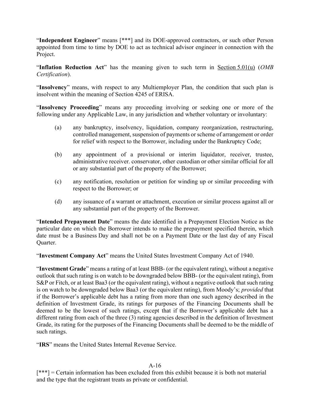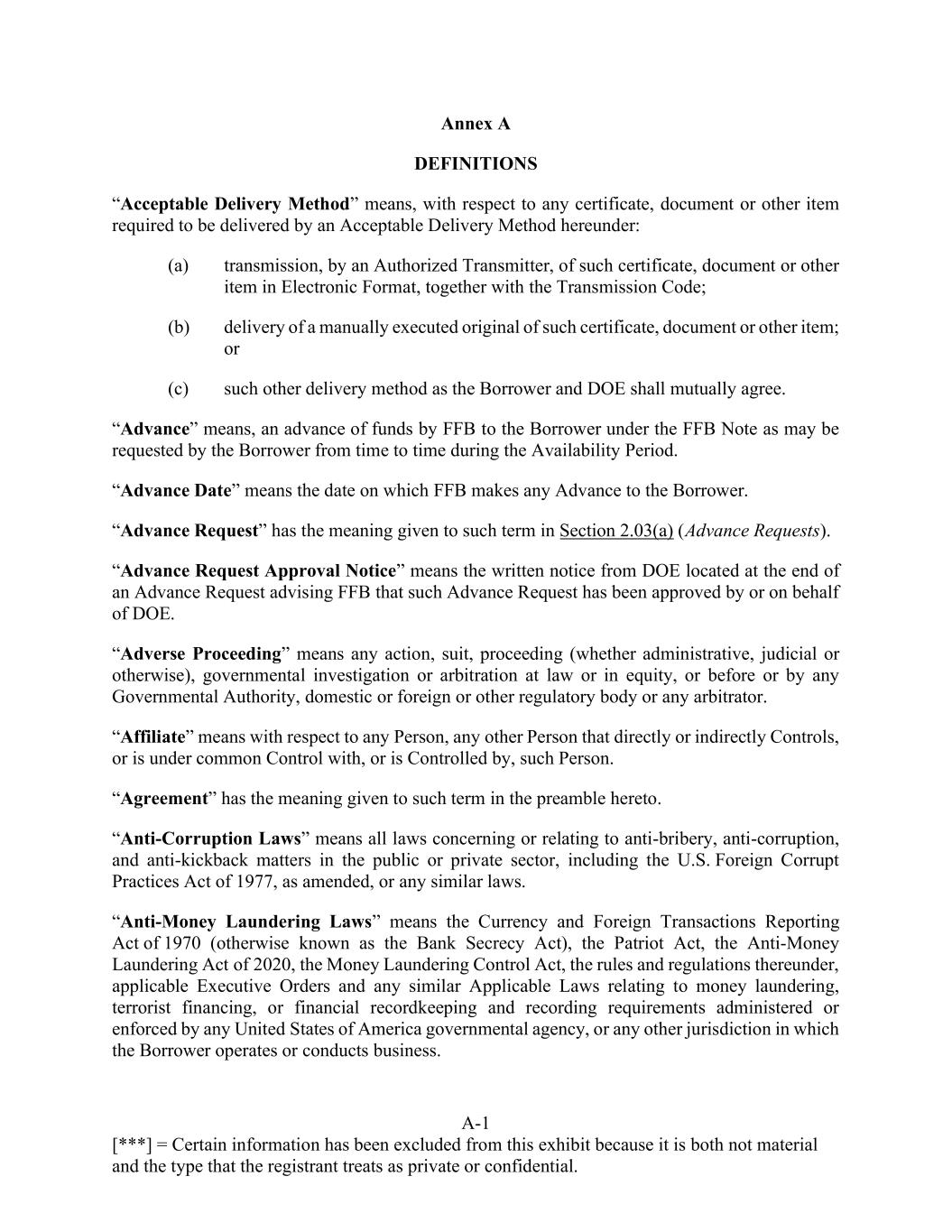 2 [***] = Certain information has been excluded from this exhibit because it is both not material and the type that the registrant treats as private or confidential. and reimbursement obligations of the Borrower to DOE; and (b) to provide for certain other matters related thereto. NOW, THEREFORE, in consideration of the foregoing and for other good and valuable consideration, the receipt and adequacy of which are hereby acknowledged, the parties hereby agree as follows: ARTICLE I DEFINITIONS AND OTHER RULES OF CONSTRUCTION Section 1.01 Terms Generally. Capitalized terms used herein, including in the preliminary statements, without definition shall have the respective meanings assigned to such terms in Annex A (Definitions). Section 1.02 Other Rules of Construction. Unless the contrary is expressly stated herein: (a) words in this Agreement denoting one gender only shall be construed to include all genders; (b) when used in this Agreement, the words “including,” “includes” and “include” shall be deemed to be followed in each instance by the words “without limitation”; (c) when used in this Agreement, the word “or” is not exclusive; (d) when used in this Agreement, the words “herein,” “hereby,” “hereunder,” “hereof,” “hereto,” “hereinbefore,” and “hereinafter,” and words of similar import, unless otherwise specified, shall refer to this Agreement in its entirety and not to any particular article, section, subsection, paragraph, clause or other subdivision, annex, exhibit, schedule or appendix of this Agreement; (e) when used in this Agreement, the expression “disclosed to DOE in writing” and expressions of similar import shall include email correspondence addressed to DOE or its advisors in accordance with Section 11.04 (Notices) and uploads to any virtual data room or similar platform accessible by DOE or its advisors; (f) each reference in this Agreement to any article, section, subsection, paragraph, clause or other subdivision, annex, exhibit, schedule or appendix shall mean, unless otherwise specified, the respective article, section, subsection, paragraph, clause or other subdivision, annex, exhibit, schedule or appendix of this Agreement; (g) capitalized terms in this Agreement referring to any Person or party to any Financing Document or to any other agreement, instrument, deed or other document shall refer to such Person or party together with its successors and permitted assigns, and in the case of any Governmental Authority, any Person succeeding to its functions and capacities;