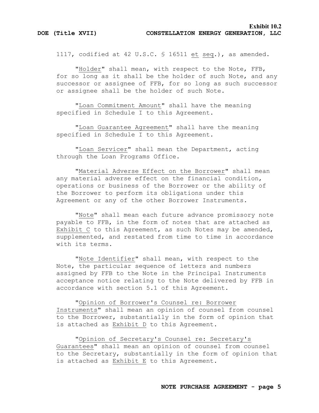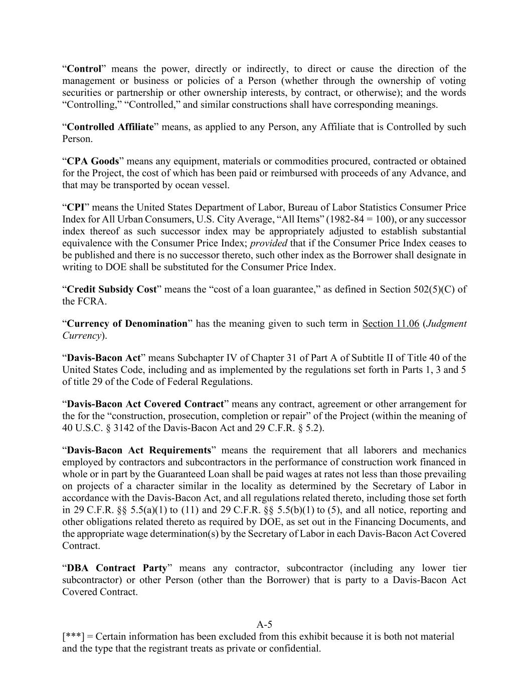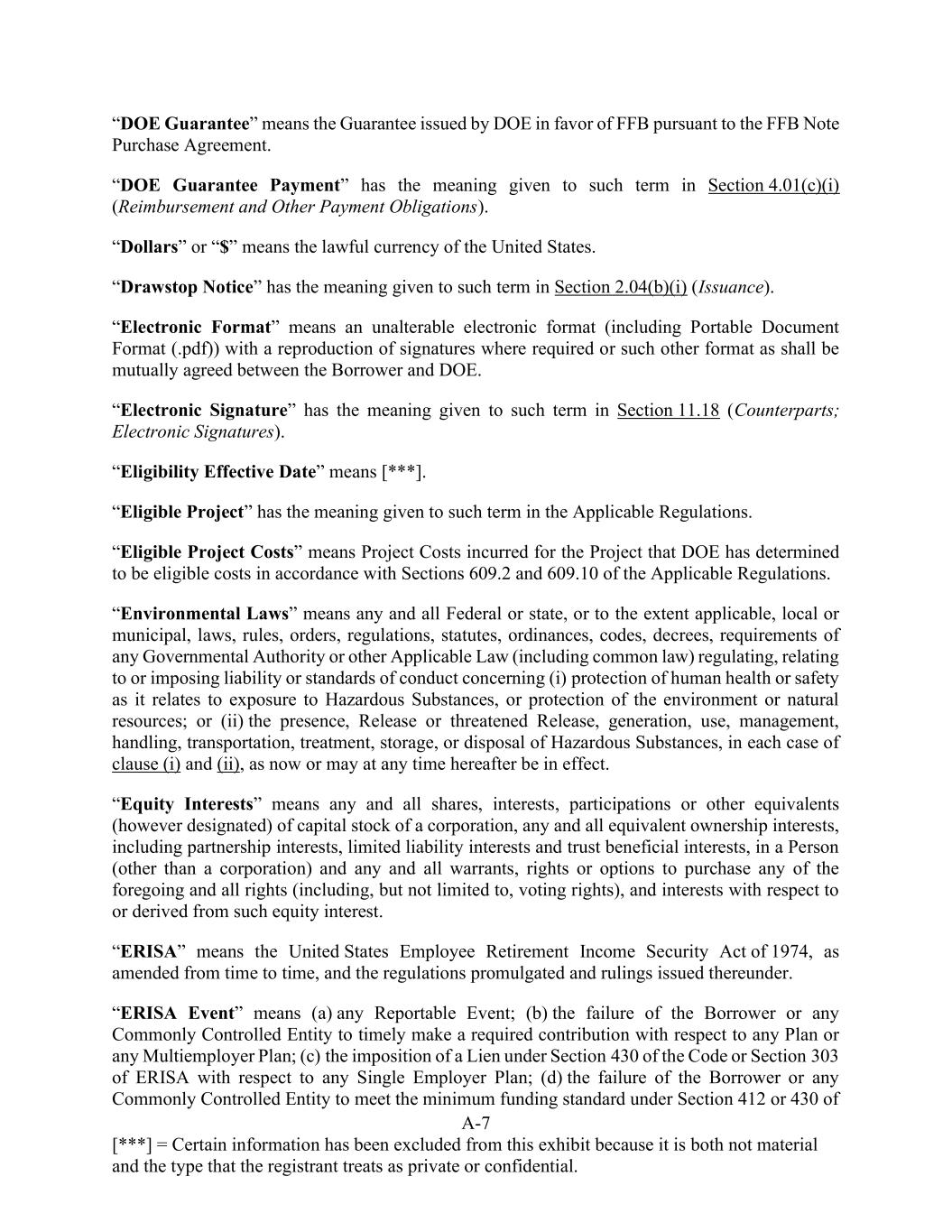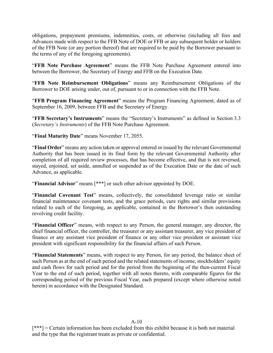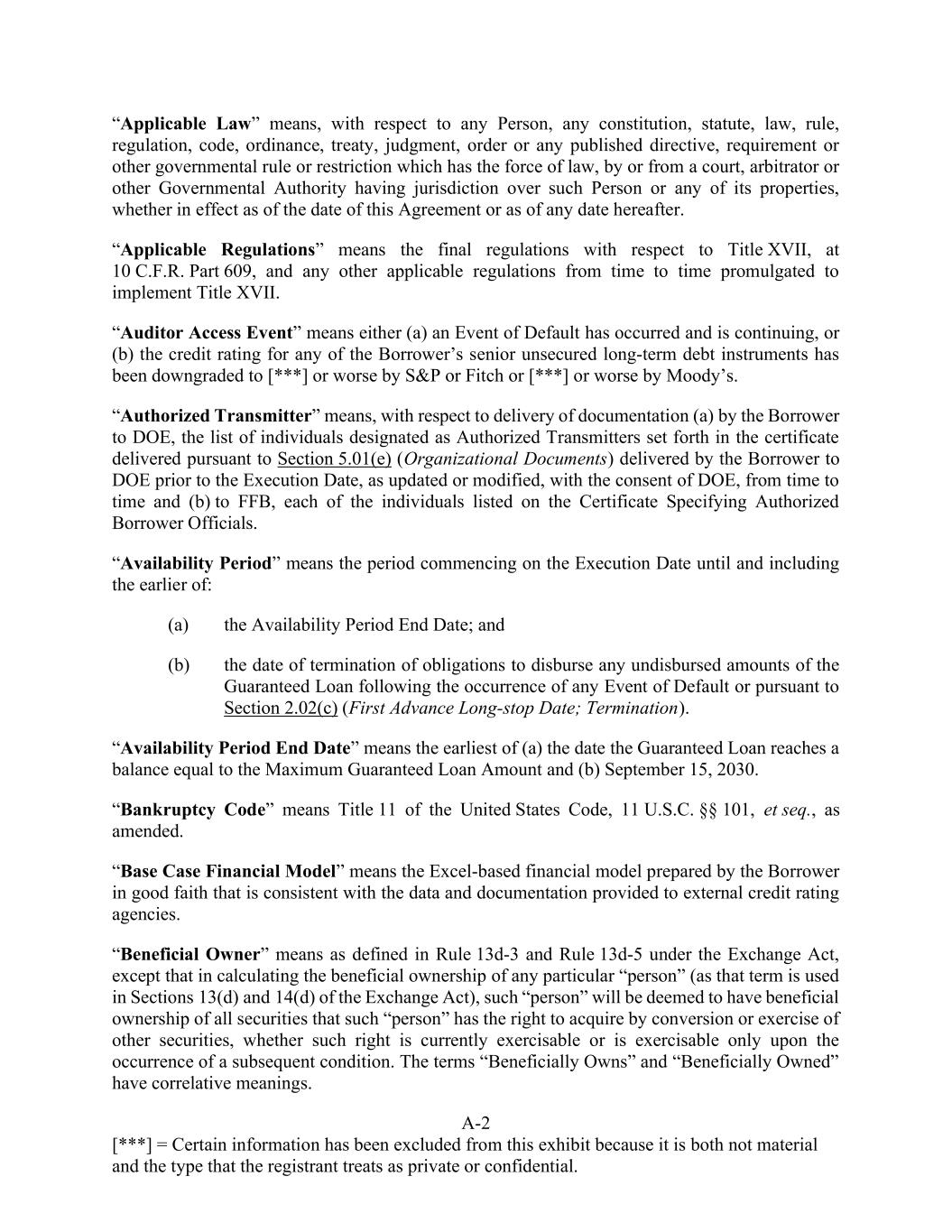 4 [***] = Certain information has been excluded from this exhibit because it is both not material and the type that the registrant treats as private or confidential. (p) the word “will” shall be construed as having the same meaning and effect as the word “shall;” and (q) the definitions of the terms herein shall apply equally to the singular and plural forms of the terms defined. Section 1.03 Definitions in Other Written Communications. Unless the contrary intention appears, any capitalized term used without definition in any notice or other written communication given under or pursuant to this Agreement shall have the same meaning in that notice or other written communication as in this Agreement. Section 1.04 Conflict with FFB Documents. In the case of any conflict between the terms of this Agreement and the terms of any FFB Document (a) as between the Borrower and DOE the terms of this Agreement shall control, unless expressly stated to the contrary herein, and (b) as (i) between the Borrower and FFB or (ii) between DOE and FFB, the terms of such FFB Document shall control. Section 1.05 Accounting Terms. Except as otherwise expressly provided herein, all accounting terms used herein and in the other Financing Documents, and in any certificate or other document made or delivered pursuant hereto or thereto, but not otherwise defined in Annex A (Definitions) hereto shall have the respective meanings assigned to them in conformity with GAAP. ARTICLE II FUNDING Section 2.01 Guaranteed Loan Purchase of the FFB Note. (a) Purchase of the FFB Note. Subject to the terms and conditions hereof and of the FFB Documents, on the Execution Date, DOE shall deliver to FFB the FFB Secretary’s Instruments required, in accordance with Section 3.3 (Secretary’s Instruments) of the FFB Note Purchase Agreement, in connection with the offer by FFB to purchase, on the Execution Date, the FFB Note contemplated thereunder in an aggregate maximum principal amount not to exceed one billion Dollars ($1,000,000,000) (the “Maximum Guaranteed Loan Amount”). The loan or loans extended under the FFB Note are referred to herein as the “Guaranteed Loan”. (b) Loans. The Guaranteed Loan will be disbursed as set forth herein and the FFB Note shall be issued on the Execution Date. Section 2.02 Availability and Reductions. (a) Guaranteed Loan Amount; Availability Period. Subject to the terms and conditions hereof and of the FFB Documents, DOE shall, during the Availability Period, deliver to FFB an Advance Request Approval Notice authorizing FFB to make Advances in accordance with Section 2.04(a)(ii) (Advance Request Approval Notice); provided, that after giving effect to any Advances and the use of proceeds thereof and subject to Section 2.07 (Determination of