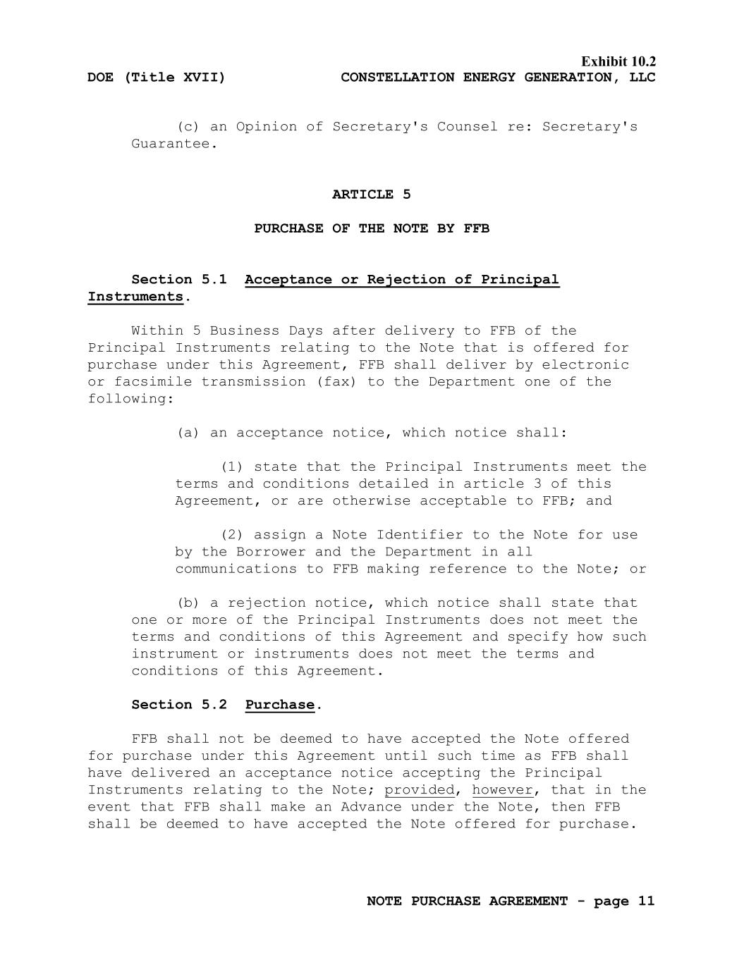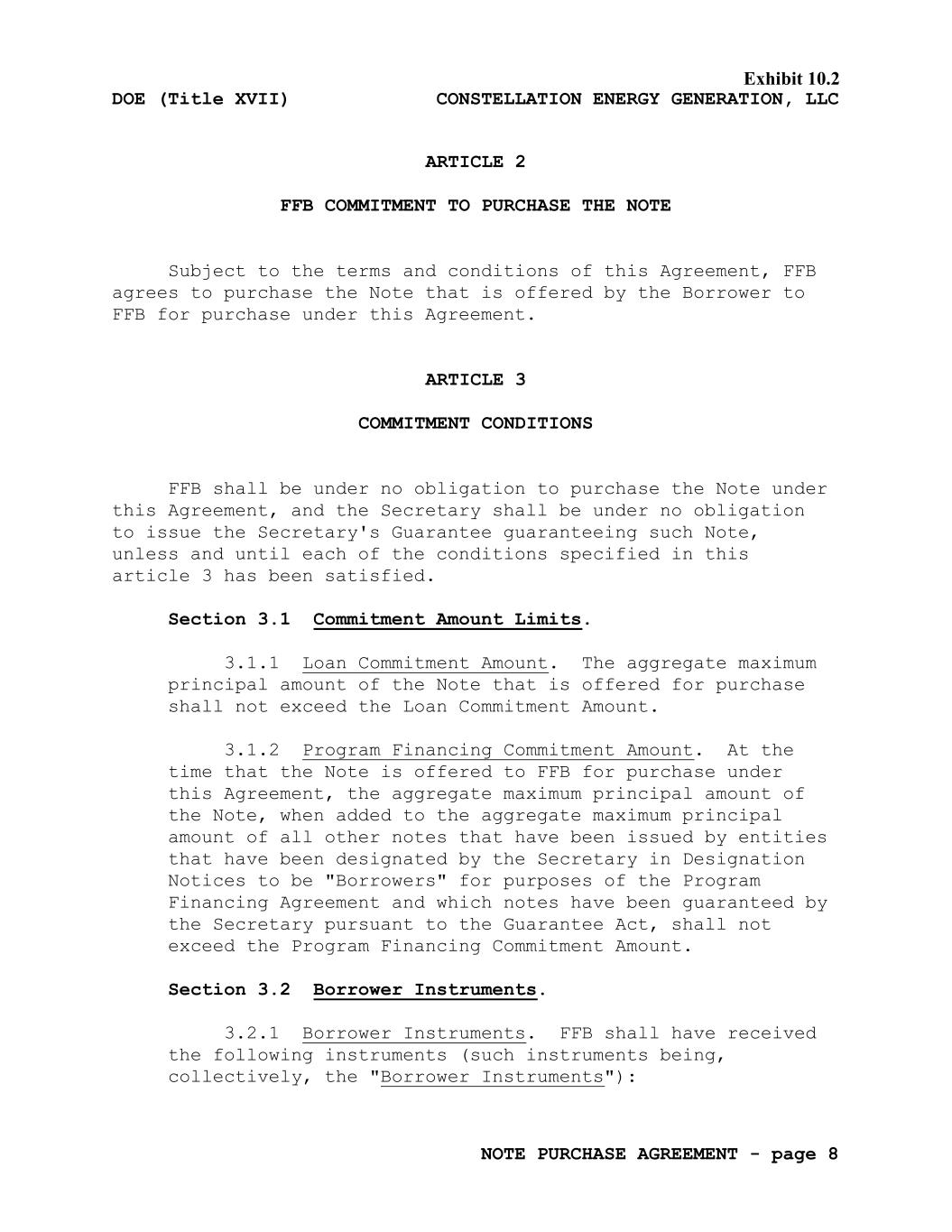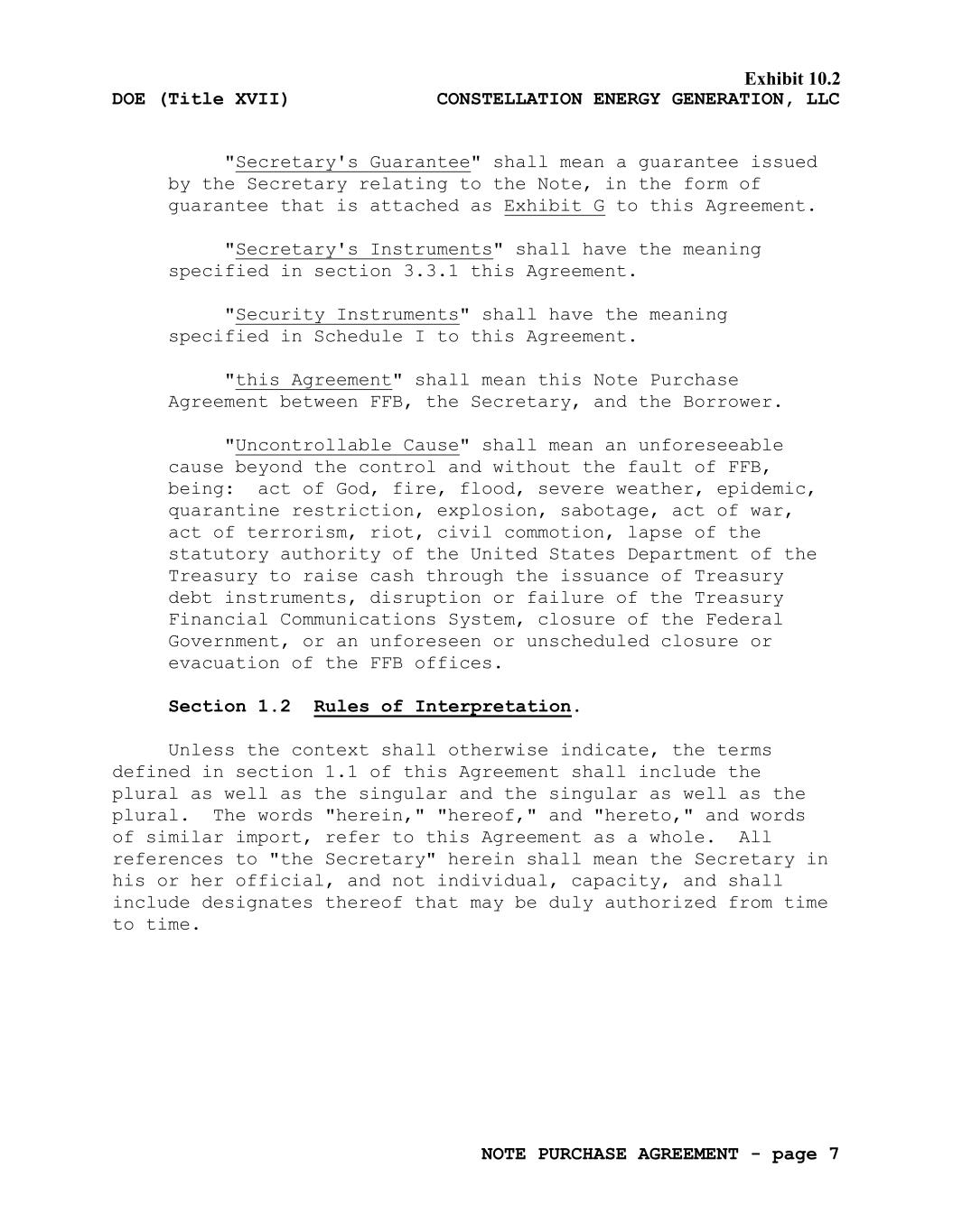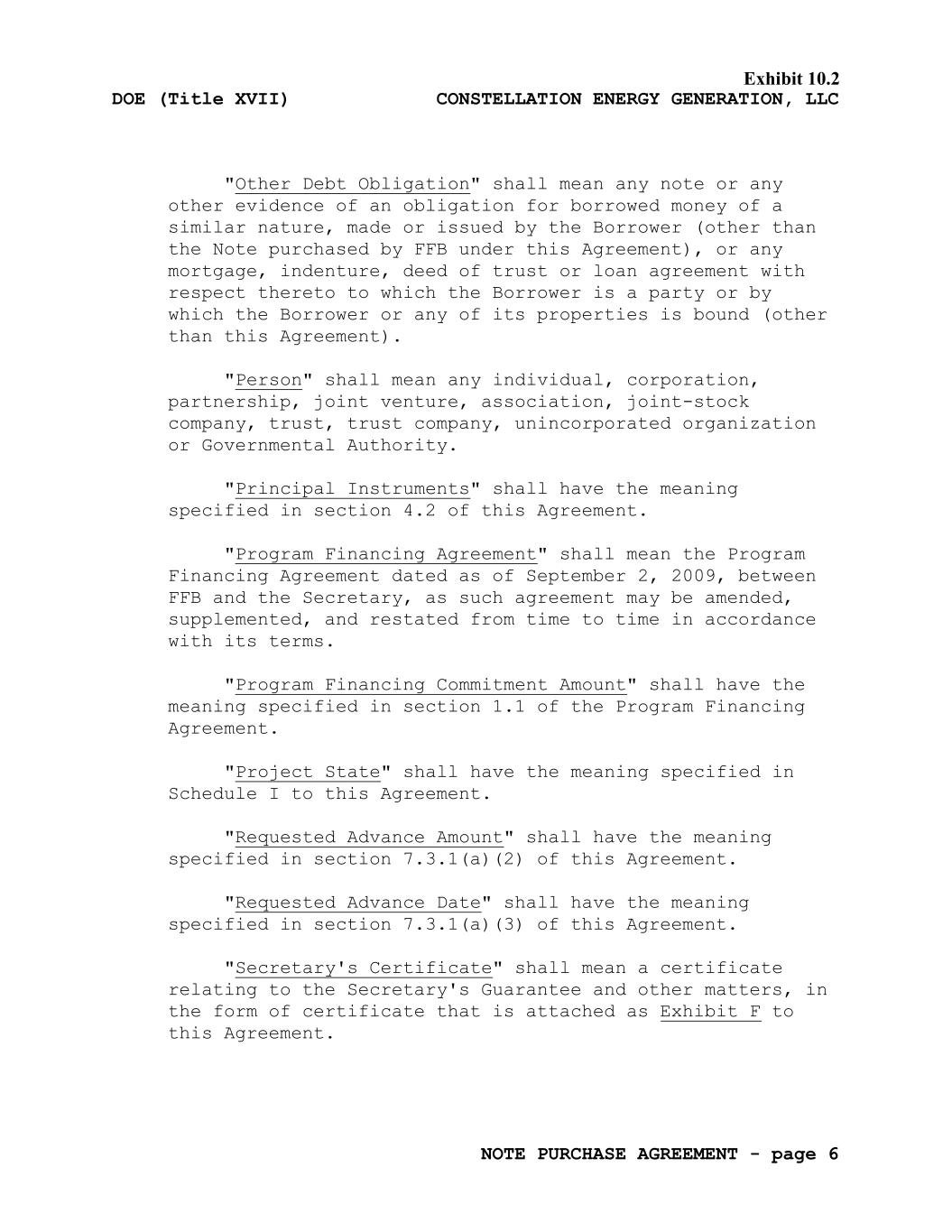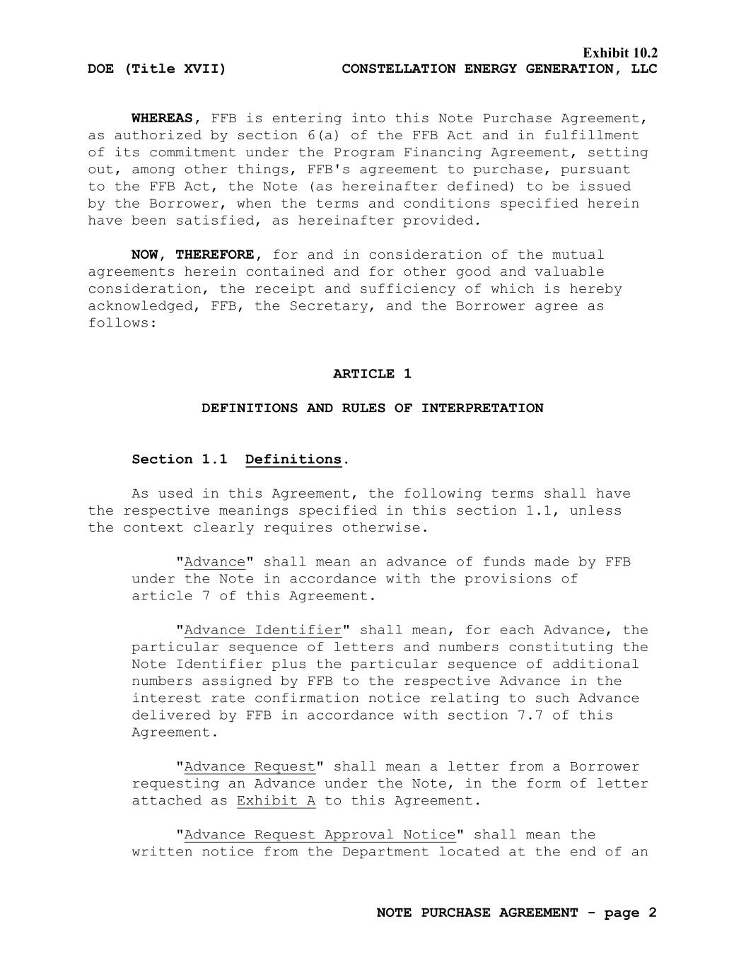 4 [***] = Certain information has been excluded from this exhibit because it is both not material and the type that the registrant treats as private or confidential. (p) the word “will” shall be construed as having the same meaning and effect as the word “shall;” and (q) the definitions of the terms herein shall apply equally to the singular and plural forms of the terms defined. Section 1.03 Definitions in Other Written Communications. Unless the contrary intention appears, any capitalized term used without definition in any notice or other written communication given under or pursuant to this Agreement shall have the same meaning in that notice or other written communication as in this Agreement. Section 1.04 Conflict with FFB Documents. In the case of any conflict between the terms of this Agreement and the terms of any FFB Document (a) as between the Borrower and DOE the terms of this Agreement shall control, unless expressly stated to the contrary herein, and (b) as (i) between the Borrower and FFB or (ii) between DOE and FFB, the terms of such FFB Document shall control. Section 1.05 Accounting Terms. Except as otherwise expressly provided herein, all accounting terms used herein and in the other Financing Documents, and in any certificate or other document made or delivered pursuant hereto or thereto, but not otherwise defined in Annex A (Definitions) hereto shall have the respective meanings assigned to them in conformity with GAAP. ARTICLE II FUNDING Section 2.01 Guaranteed Loan Purchase of the FFB Note. (a) Purchase of the FFB Note. Subject to the terms and conditions hereof and of the FFB Documents, on the Execution Date, DOE shall deliver to FFB the FFB Secretary’s Instruments required, in accordance with Section 3.3 (Secretary’s Instruments) of the FFB Note Purchase Agreement, in connection with the offer by FFB to purchase, on the Execution Date, the FFB Note contemplated thereunder in an aggregate maximum principal amount not to exceed one billion Dollars ($1,000,000,000) (the “Maximum Guaranteed Loan Amount”). The loan or loans extended under the FFB Note are referred to herein as the “Guaranteed Loan”. (b) Loans. The Guaranteed Loan will be disbursed as set forth herein and the FFB Note shall be issued on the Execution Date. Section 2.02 Availability and Reductions. (a) Guaranteed Loan Amount; Availability Period. Subject to the terms and conditions hereof and of the FFB Documents, DOE shall, during the Availability Period, deliver to FFB an Advance Request Approval Notice authorizing FFB to make Advances in accordance with Section 2.04(a)(ii) (Advance Request Approval Notice); provided, that after giving effect to any Advances and the use of proceeds thereof and subject to Section 2.07 (Determination of
