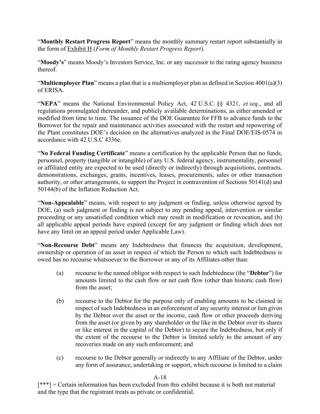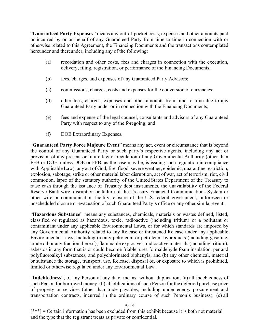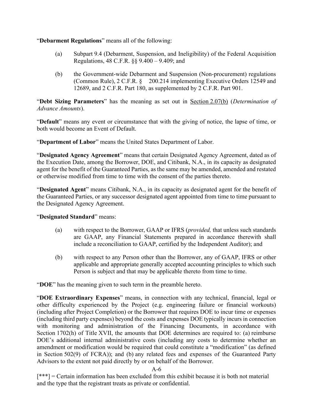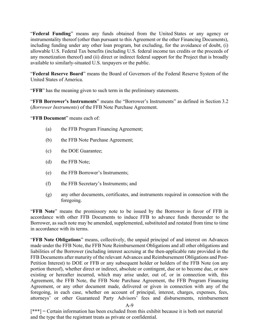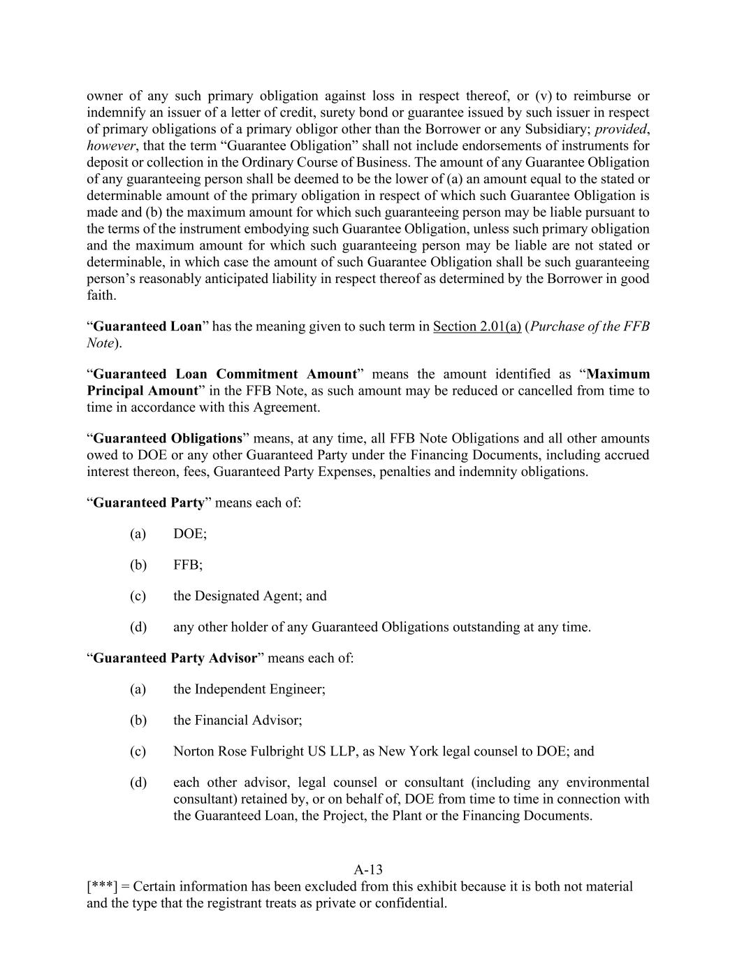 3 [***] = Certain information has been excluded from this exhibit because it is both not material and the type that the registrant treats as private or confidential. (h) each reference in this Agreement to any Financing Document or to any other agreement, instrument, deed or other document, shall be deemed to be a reference to such Financing Document or such other agreement, instrument, deed or document, as the case may be, as the same may be amended, supplemented, novated or otherwise modified from time to time in accordance with the terms hereof and thereof; (i) each reference in this Agreement to any Applicable Law or Environmental Law shall be construed as a reference to such Applicable Law or Environmental Law, as applied, amended, modified, extended or re-enacted from time to time, and includes any rules or regulations promulgated thereunder; (j) each reference in this Agreement to any provision of any other Financing Document will include reference to any definition or provision incorporated by reference within that provision; (k) except where expressly provided otherwise, whenever any matter is required to be satisfactory to, or determined or approved by, DOE or FFB, or DOE or FFB is required or permitted to exercise any discretion (including any discretion to waive, select, require, deem appropriate, deem necessary, permit, determine or approve any matter), the satisfaction, determination or approval of DOE or FFB, or the exercise by DOE or FFB of such discretion, shall be in its respective sole and absolute discretion, as applicable, and further DOE shall be entitled to consult with its Guaranteed Party Advisors in making such determination or exercising such discretion; (l) except where expressly provided otherwise, the words “days”, “weeks”, “months” and “years” shall mean calendar days, weeks, months and years, respectively, and each reference to a time of day shall mean such time in Washington, D.C.; (m) the table of contents and article and section headings and other captions have been inserted as a matter of convenience for the purpose of reference only and do not limit or affect the meaning of the terms and provisions thereof; (n) the expression “reasonable efforts” and expressions of like import, when used in connection with an obligation, means taking in good faith and with due diligence all commercially reasonable steps to achieve the objective and to perform the obligation, including doing all that can reasonably be done in the circumstances taking into account each party’s obligations hereunder to mitigate delays and additional costs to the other party, and in any event taking no fewer steps and efforts than those that would be taken by a commercially reasonable and prudent person in comparable circumstances, where the whole of the benefit of the obligation and where all the results of taking such steps and efforts accrue solely to that person’s own benefit; (o) the words “asset” and “property,” unless otherwise defined herein, shall be construed to have the same meaning and effect and to refer to any and all tangible and intangible assets and properties, including cash, Equity Interests, securities, revenues, accounts, leasehold interests, intellectual property and contract rights;