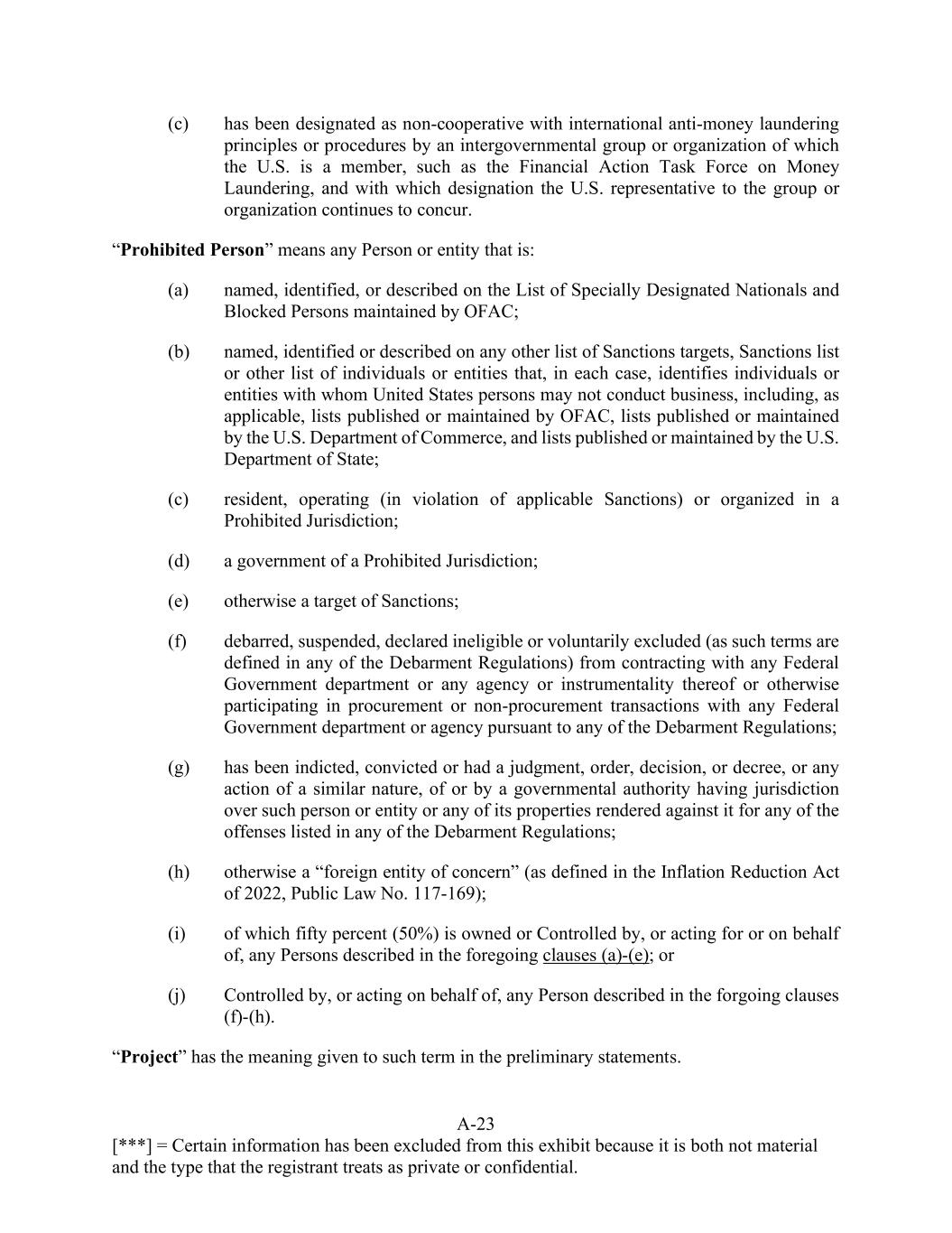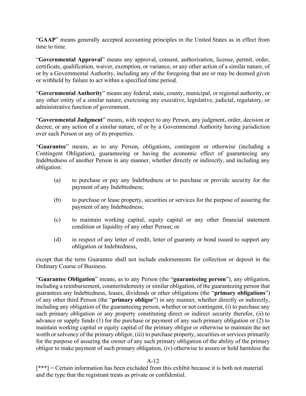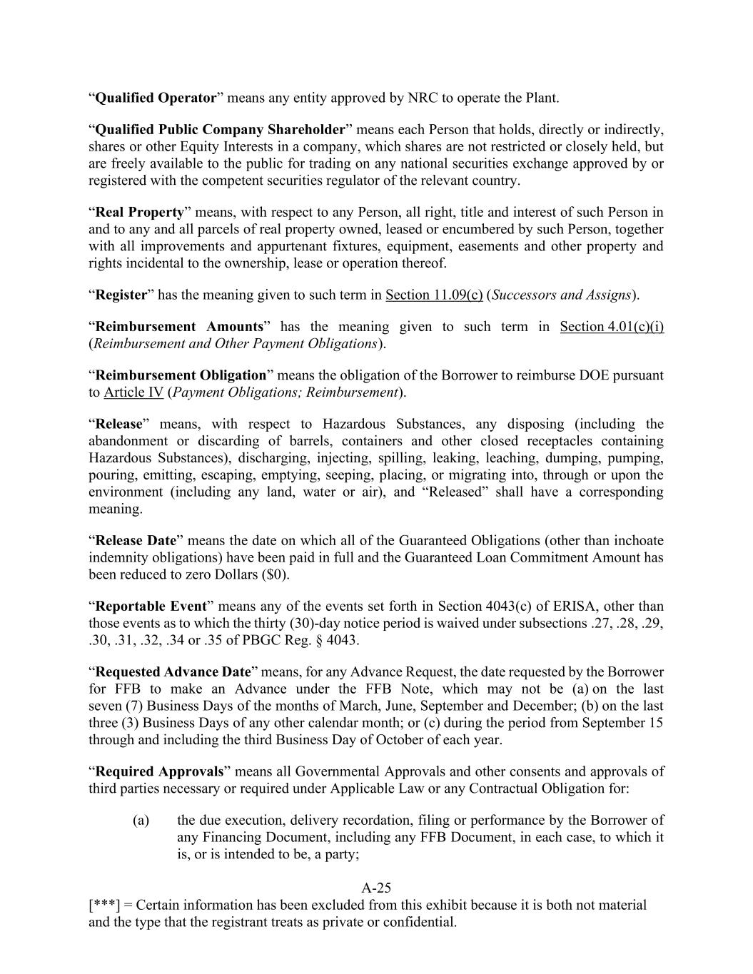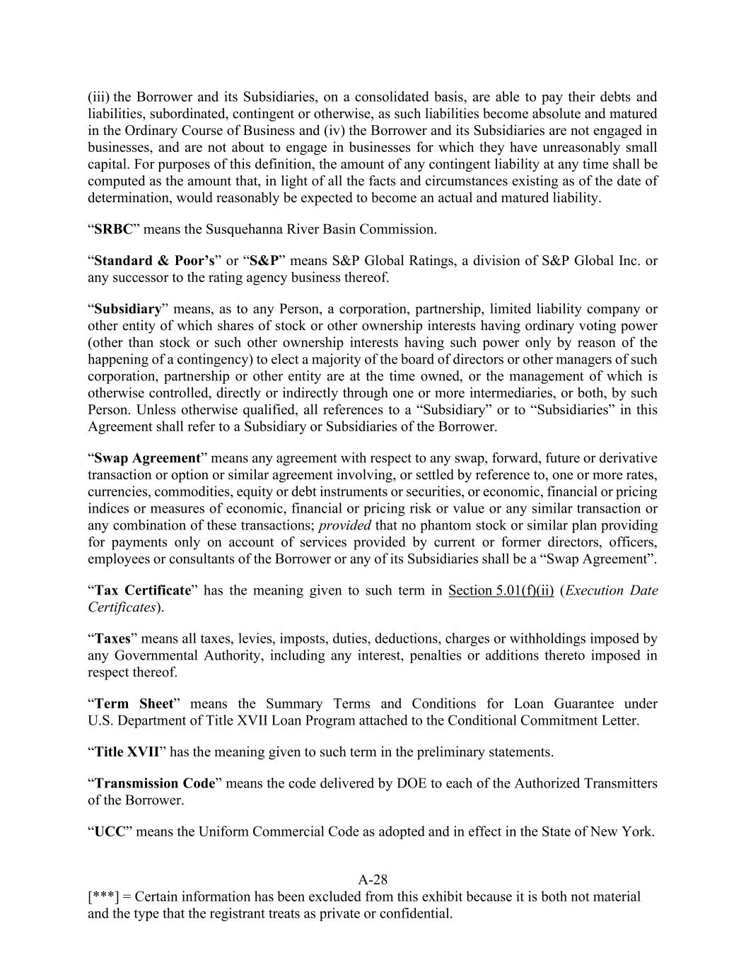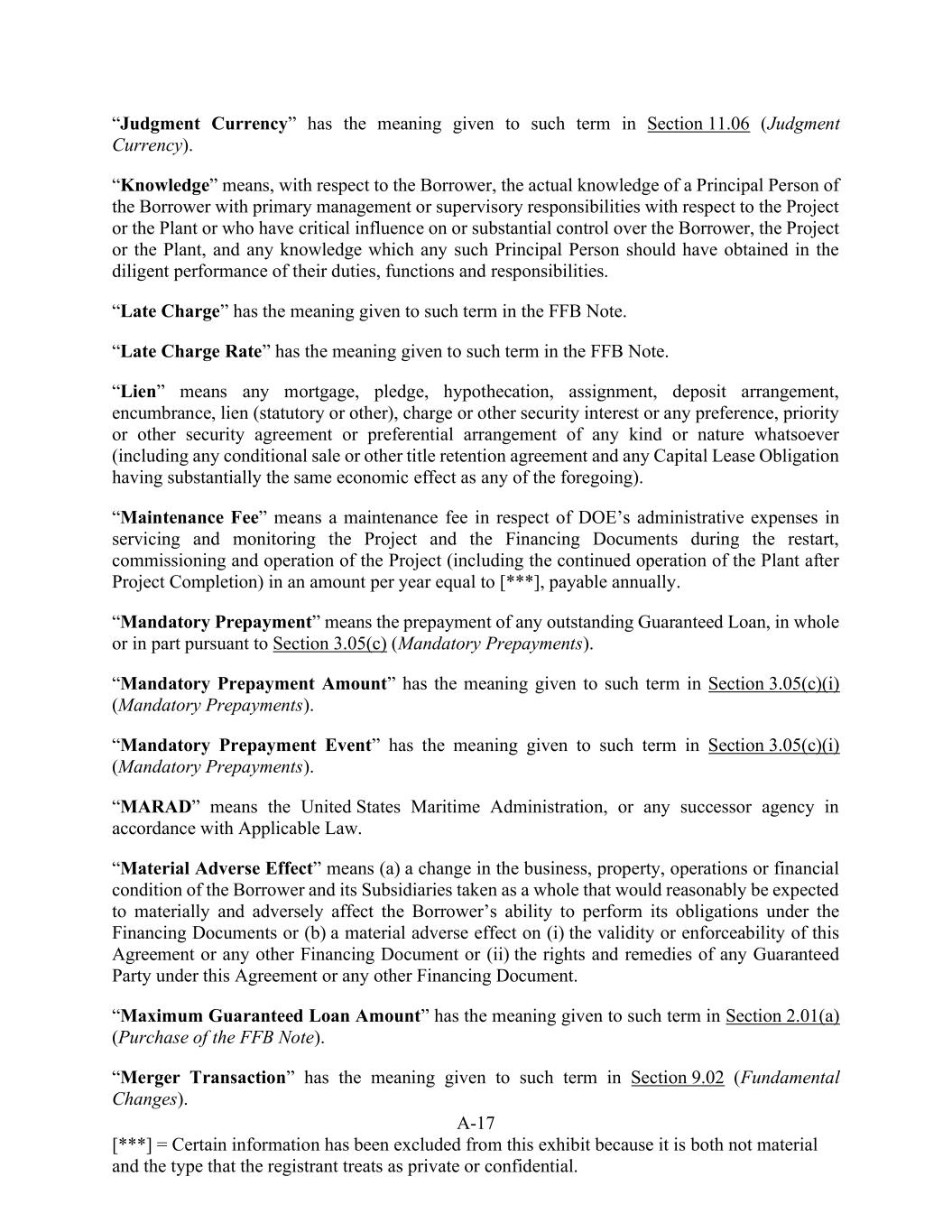 3 [***] = Certain information has been excluded from this exhibit because it is both not material and the type that the registrant treats as private or confidential. (h) each reference in this Agreement to any Financing Document or to any other agreement, instrument, deed or other document, shall be deemed to be a reference to such Financing Document or such other agreement, instrument, deed or document, as the case may be, as the same may be amended, supplemented, novated or otherwise modified from time to time in accordance with the terms hereof and thereof; (i) each reference in this Agreement to any Applicable Law or Environmental Law shall be construed as a reference to such Applicable Law or Environmental Law, as applied, amended, modified, extended or re-enacted from time to time, and includes any rules or regulations promulgated thereunder; (j) each reference in this Agreement to any provision of any other Financing Document will include reference to any definition or provision incorporated by reference within that provision; (k) except where expressly provided otherwise, whenever any matter is required to be satisfactory to, or determined or approved by, DOE or FFB, or DOE or FFB is required or permitted to exercise any discretion (including any discretion to waive, select, require, deem appropriate, deem necessary, permit, determine or approve any matter), the satisfaction, determination or approval of DOE or FFB, or the exercise by DOE or FFB of such discretion, shall be in its respective sole and absolute discretion, as applicable, and further DOE shall be entitled to consult with its Guaranteed Party Advisors in making such determination or exercising such discretion; (l) except where expressly provided otherwise, the words “days”, “weeks”, “months” and “years” shall mean calendar days, weeks, months and years, respectively, and each reference to a time of day shall mean such time in Washington, D.C.; (m) the table of contents and article and section headings and other captions have been inserted as a matter of convenience for the purpose of reference only and do not limit or affect the meaning of the terms and provisions thereof; (n) the expression “reasonable efforts” and expressions of like import, when used in connection with an obligation, means taking in good faith and with due diligence all commercially reasonable steps to achieve the objective and to perform the obligation, including doing all that can reasonably be done in the circumstances taking into account each party’s obligations hereunder to mitigate delays and additional costs to the other party, and in any event taking no fewer steps and efforts than those that would be taken by a commercially reasonable and prudent person in comparable circumstances, where the whole of the benefit of the obligation and where all the results of taking such steps and efforts accrue solely to that person’s own benefit; (o) the words “asset” and “property,” unless otherwise defined herein, shall be construed to have the same meaning and effect and to refer to any and all tangible and intangible assets and properties, including cash, Equity Interests, securities, revenues, accounts, leasehold interests, intellectual property and contract rights;
