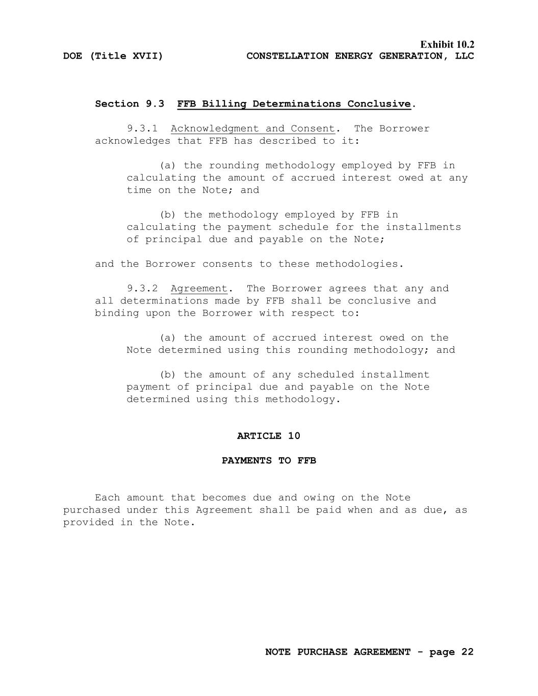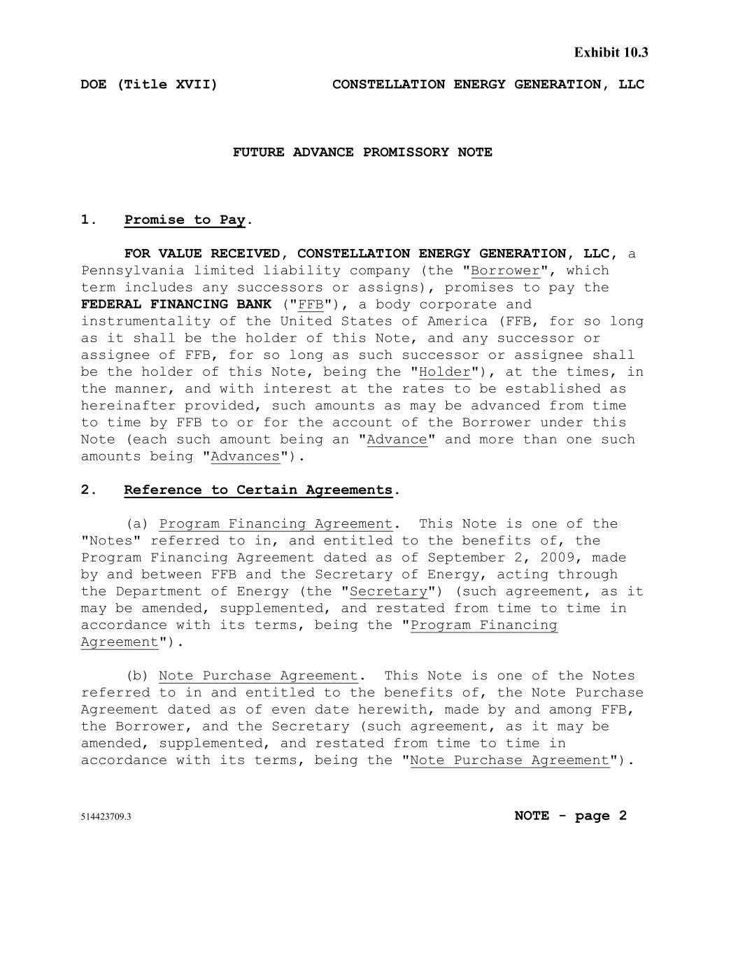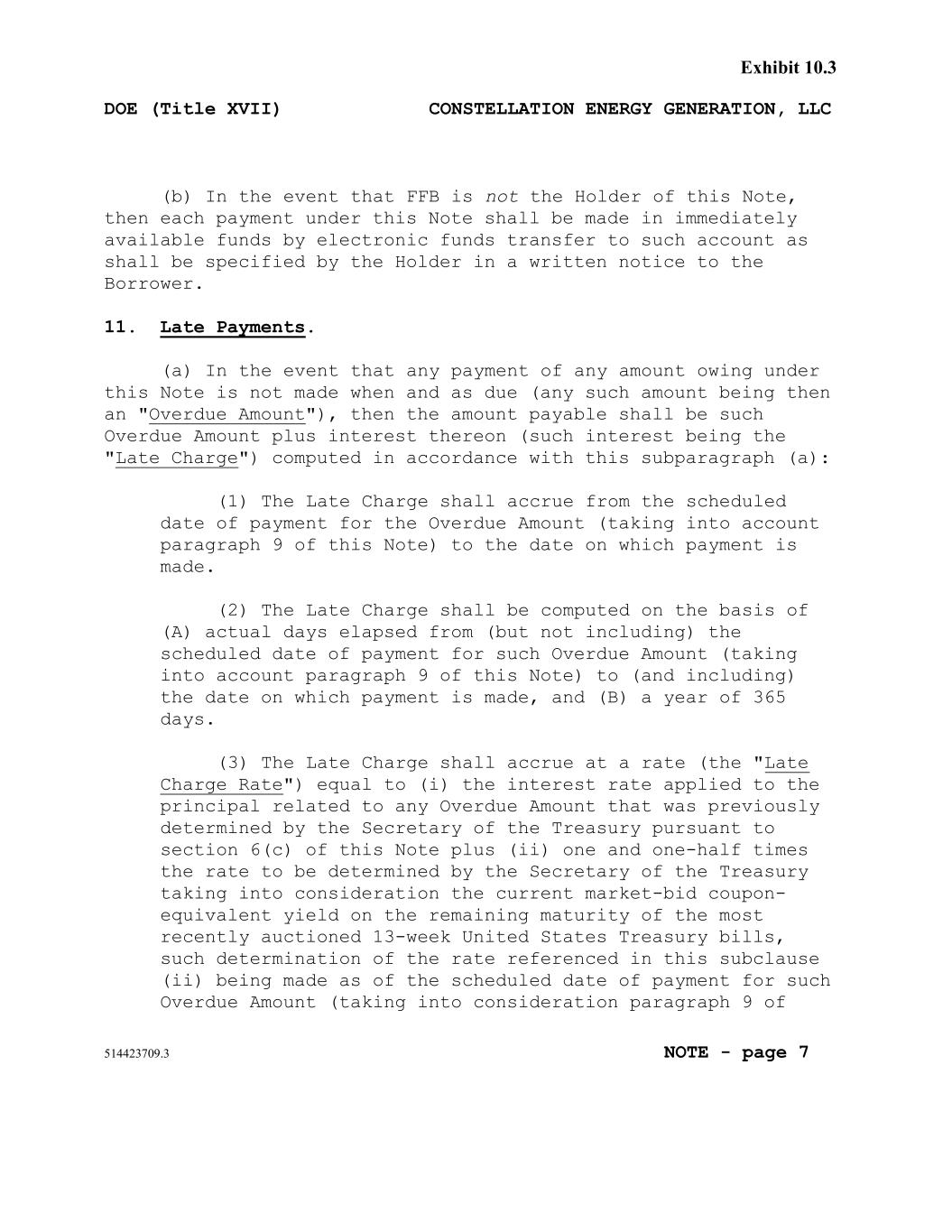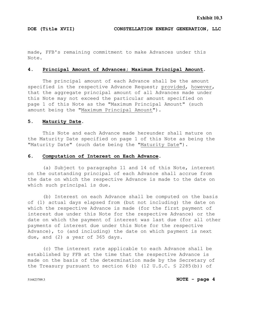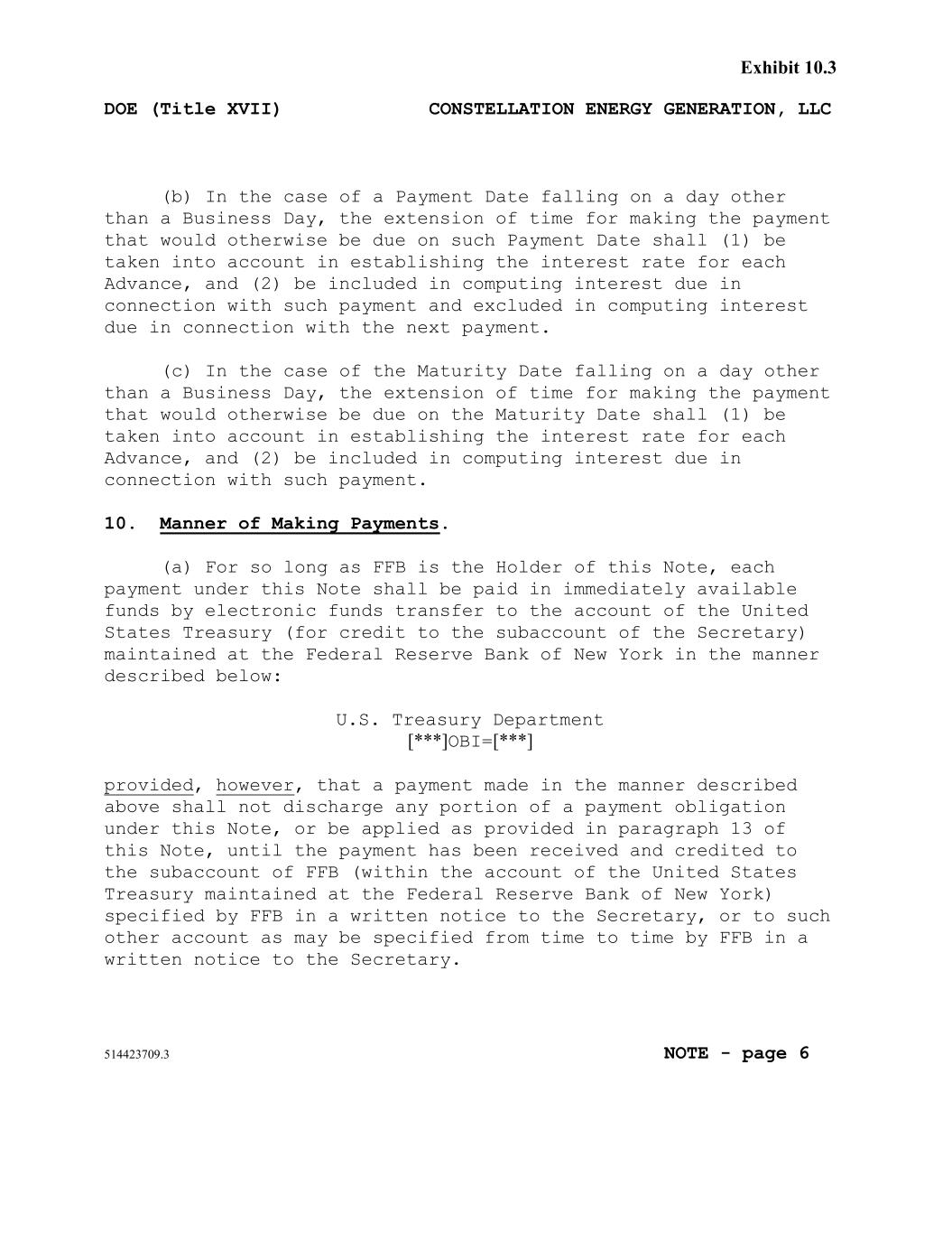 10 [***] = Certain information has been excluded from this exhibit because it is both not material and the type that the registrant treats as private or confidential. in accordance with Section 3.04 (Interest Provisions Relating to All Advances) and the FFB Documents. Section 3.03 Evidence of Debt. The entries made in the internal records maintained by or on behalf of DOE evidencing the amounts from time to time (i) advanced by FFB under the FFB Note Purchase Agreement and the FFB Note; or (ii) paid by or on behalf of the Borrower from time to time in respect thereof, shall constitute, absent manifest error, evidence of the existence and amount of the FFB Note Obligations of the Borrower as therein recorded. Section 3.04 Interest Provisions Relating to All Advances. (a) Interest Amount and Interest Computations. (i) Interest shall accrue on the outstanding principal amount of each Advance from the date such Advance is disbursed to the Borrower pursuant to the FFB Note Purchase Agreement and the FFB Note, to the date such Advance is due, in each case, at a rate per annum as specified in the FFB Note Purchase Agreement. Except as provided in Section 3.04(a)(ii) (Interest Amount and Interest Computations), interest accrued on the outstanding principal balance of each Advance shall be due and payable to FFB on each Payment Date beginning on the first Payment Date to occur after the First Advance Date, through and including the Final Maturity Date. (ii) Without limiting the foregoing, all Overdue Amounts on the Guaranteed Loan shall (A) accrue interest at the Late Charge Rate; and (B) be payable by the Borrower in accordance with the FFB Documents. (iii) The Borrower hereby authorizes FFB to record in an account or accounts maintained by FFB on its books (A) the interest rates applicable to all Advances; (B) the date and amount of each principal and interest payment on each Advance outstanding; and (C) such other information as FFB may determine is necessary for the computation of interest and the Prepayment Price payable by the Borrower under the FFB Note. The Borrower acknowledges and agrees that all computations of interest and the Prepayment Price by FFB pursuant to this Section 3.04 (Interest Provisions Relating to All Advances) and the FFB Note shall, in the absence of manifest error, be evidence of the amount thereof. All computations of interest shall be made as set forth in the relevant FFB Document. (b) Interest Payment Dates. Subject to the terms of the FFB Note Purchase Agreement and the FFB Note, the Borrower shall pay accrued interest on the outstanding principal amount of each Advance (i) on each Payment Date, as and to the extent specified in Section 3.04(a) (Interest Amount and Interest Computations); (ii) on each prepayment date (to the extent thereof); and (iii) at maturity (whether by acceleration or otherwise).