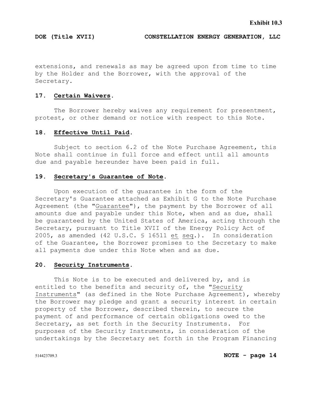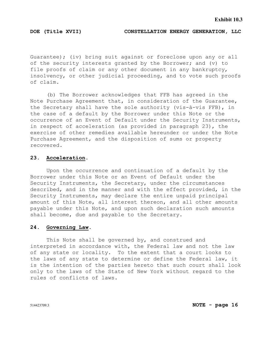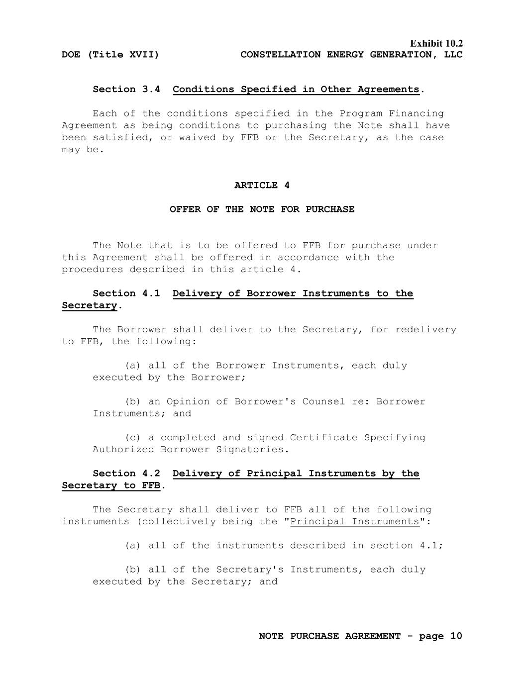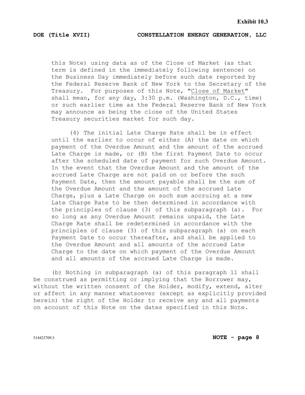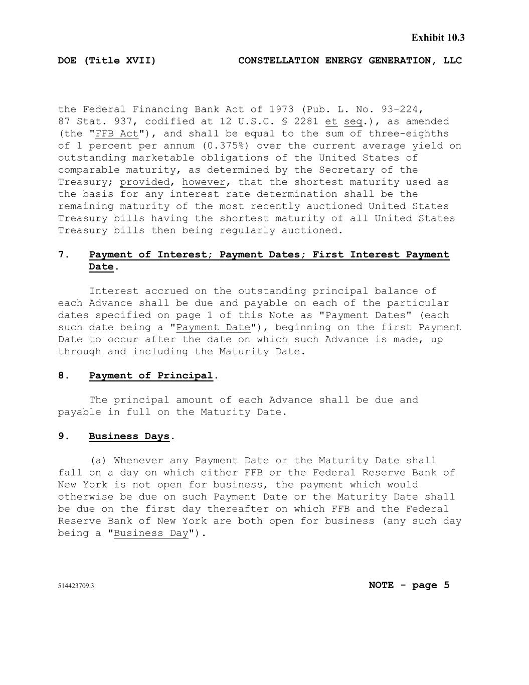 10 [***] = Certain information has been excluded from this exhibit because it is both not material and the type that the registrant treats as private or confidential. in accordance with Section 3.04 (Interest Provisions Relating to All Advances) and the FFB Documents. Section 3.03 Evidence of Debt. The entries made in the internal records maintained by or on behalf of DOE evidencing the amounts from time to time (i) advanced by FFB under the FFB Note Purchase Agreement and the FFB Note; or (ii) paid by or on behalf of the Borrower from time to time in respect thereof, shall constitute, absent manifest error, evidence of the existence and amount of the FFB Note Obligations of the Borrower as therein recorded. Section 3.04 Interest Provisions Relating to All Advances. (a) Interest Amount and Interest Computations. (i) Interest shall accrue on the outstanding principal amount of each Advance from the date such Advance is disbursed to the Borrower pursuant to the FFB Note Purchase Agreement and the FFB Note, to the date such Advance is due, in each case, at a rate per annum as specified in the FFB Note Purchase Agreement. Except as provided in Section 3.04(a)(ii) (Interest Amount and Interest Computations), interest accrued on the outstanding principal balance of each Advance shall be due and payable to FFB on each Payment Date beginning on the first Payment Date to occur after the First Advance Date, through and including the Final Maturity Date. (ii) Without limiting the foregoing, all Overdue Amounts on the Guaranteed Loan shall (A) accrue interest at the Late Charge Rate; and (B) be payable by the Borrower in accordance with the FFB Documents. (iii) The Borrower hereby authorizes FFB to record in an account or accounts maintained by FFB on its books (A) the interest rates applicable to all Advances; (B) the date and amount of each principal and interest payment on each Advance outstanding; and (C) such other information as FFB may determine is necessary for the computation of interest and the Prepayment Price payable by the Borrower under the FFB Note. The Borrower acknowledges and agrees that all computations of interest and the Prepayment Price by FFB pursuant to this Section 3.04 (Interest Provisions Relating to All Advances) and the FFB Note shall, in the absence of manifest error, be evidence of the amount thereof. All computations of interest shall be made as set forth in the relevant FFB Document. (b) Interest Payment Dates. Subject to the terms of the FFB Note Purchase Agreement and the FFB Note, the Borrower shall pay accrued interest on the outstanding principal amount of each Advance (i) on each Payment Date, as and to the extent specified in Section 3.04(a) (Interest Amount and Interest Computations); (ii) on each prepayment date (to the extent thereof); and (iii) at maturity (whether by acceleration or otherwise).