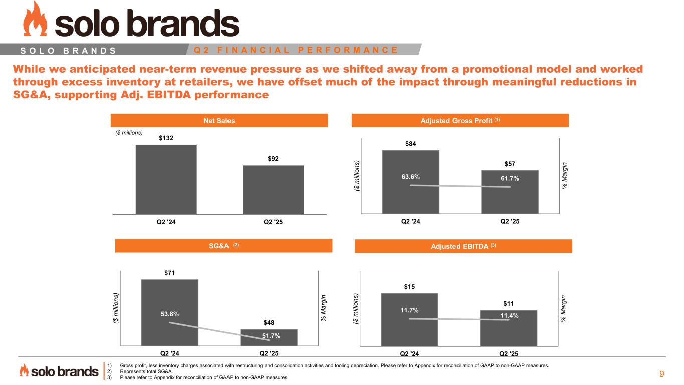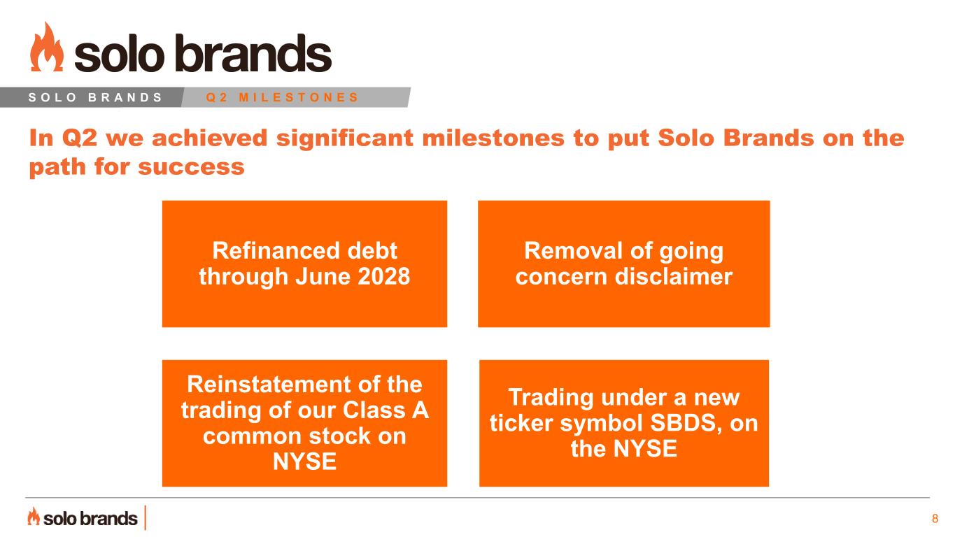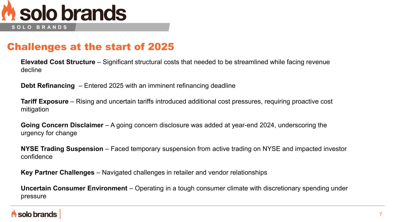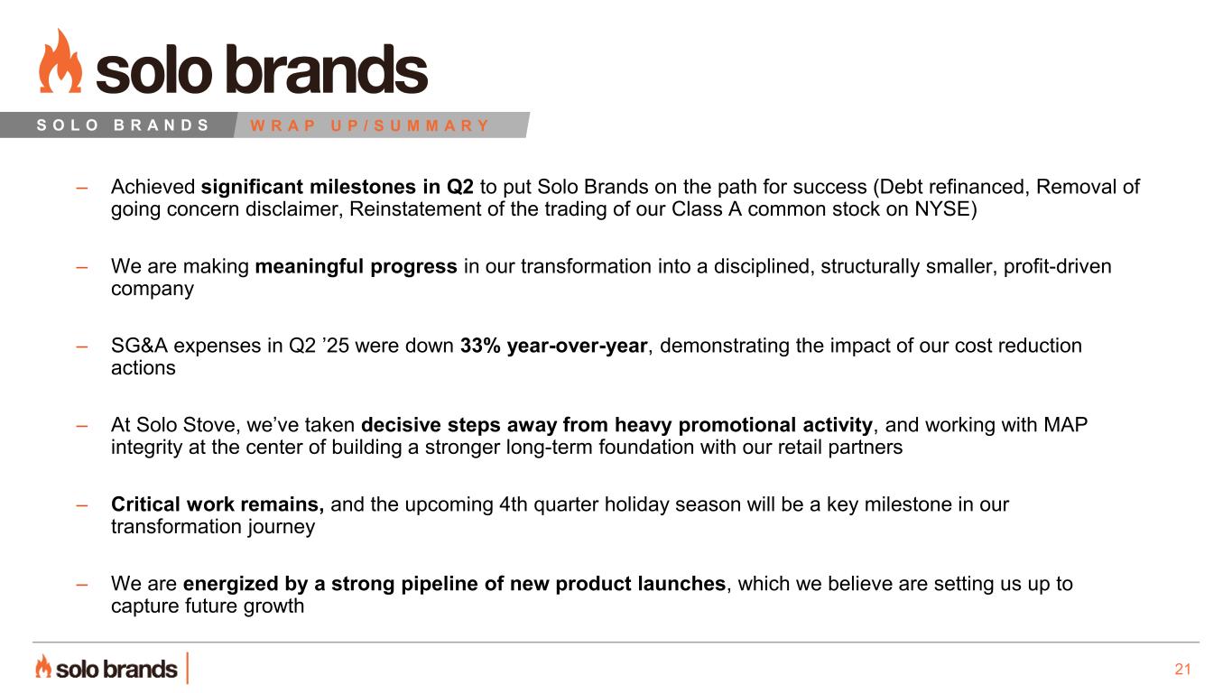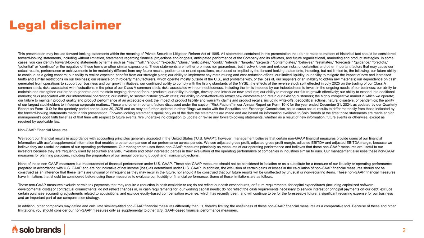 Legal disclaimer This presentation may include forward-looking statements within the meaning of Private Securities Litigation Reform Act of 1995. All statements contained in this presentation that do not relate to matters of historical fact should be considered forward-looking statements, including without limitation, statements regarding financial projections and/or goals, anticipated performance of the Company and its affiliates, and future organizational, marketing and product strategies. In some cases, you can identify forward-looking statements by terms such as “may,” “will,” “should,” “expects,” “plans,” “anticipates,” “could,” “intends,” “targets,” “projects,” “contemplates,” “believes,” “estimates,” “forecasts,” “guidance,” “predicts,” “potential” or “continue” or the negative of these terms or other similar expressions. These statements are neither promises nor guarantees, but involve known and unknown risks, uncertainties and other important factors that may cause our actual results, performance or achievements to be materially different from any future results, performance or and operations, expressed or implied by the forward-looking statements, including, but not limited to, the following: our future ability to continue as a going concern; our ability to realize expected benefits from our strategic plans; our ability to implement any restructuring and cost-reduction efforts; our limited liquidity; our ability to mitigate the impact of new and increased tariffs and similar restrictions on our business; our reliance on third-party manufacturers, which operate mostly outside of the U.S., and problems with, or the loss of, our suppliers or an inability to obtain raw materials; our dependence on cash generated from operations to support our business and our growth initiatives; our continued ability to comply with the listing standards of the NYSE; the effects of the reverse stock split effected in July 2025 on the trading of our Class A common stock; risks associated with fluctuations in the price of our Class A common stock; risks associated with our indebtedness, including the limits imposed by our indebtedness to invest in the ongoing needs of our business; our ability to maintain and strengthen our brand to generate and maintain ongoing demand for our products; our ability to design, develop and introduce new products; our ability to manage our future growth effectively; our ability to expand into additional markets; risks associated with our international operations; our inability to sustain historic growth rates; our ability to cost-effectively attract new customers and retain our existing customers; the highly competitive market in which we operate; our failure to maintain product quality and product performance at an acceptable cost; the impact of product liability and warranty claims and product recalls, including write-offs; geopolitical actions, natural disasters, or pandemics; the ability of our largest stockholders to influence corporate matters.. These and other important factors discussed under the caption “Risk Factors” in our Annual Report on Form 10-K for the year ended December 31, 2024, as updated by our Quarterly Report on Form 10-Q for the quarterly period ended June 30, 2025 and as may be further updated in other filings we make with the Securities and Exchange Commission, could cause actual results to differ materially from those indicated by the forward-looking statements made in this presentation. Forward-looking statements speak only as of the date the statements are made and are based on information available to Solo Brands at the time those statements are made and/or management's good faith belief as of that time with respect to future events. We undertake no obligation to update or revise any forward-looking statements, whether as a result of new information, future events or otherwise, except as required by applicable law. Non-GAAP Financial Measures We report our financial results in accordance with accounting principles generally accepted in the United States (“U.S. GAAP”); however, management believes that certain non-GAAP financial measures provide users of our financial information with useful supplemental information that enables a better comparison of our performance across periods. We use adjusted gross profit, adjusted gross profit margin, adjusted EBITDA and adjusted EBITDA margin, because we believe they are useful indicators of our operating performance. Our management uses these non-GAAP measures principally as measures of our operating performance and believes that these non-GAAP measures are useful to our investors because they are frequently used by securities analysts, investors and other interested parties in their evaluation of the operating performance of companies in industries similar to ours. Our management also uses these non-GAAP measures for planning purposes, including the preparation of our annual operating budget and financial projections. None of these non-GAAP measures is a measurement of financial performance under U.S. GAAP. These non-GAAP measures should not be considered in isolation or as a substitute for a measure of our liquidity or operating performance prepared in accordance with U.S. GAAP and are not indicative of net income (loss) as determined under U.S. GAAP. In addition, the exclusion of certain gains or losses in the calculation of non-GAAP financial measures should not be construed as an inference that these items are unusual or infrequent as they may recur in the future, nor should it be construed that our future results will be unaffected by unusual or non-recurring items. These non-GAAP financial measures have limitations that should be considered before using these measures to evaluate our liquidity or financial performance. Some of these limitations are as follows. These non-GAAP measures exclude certain tax payments th