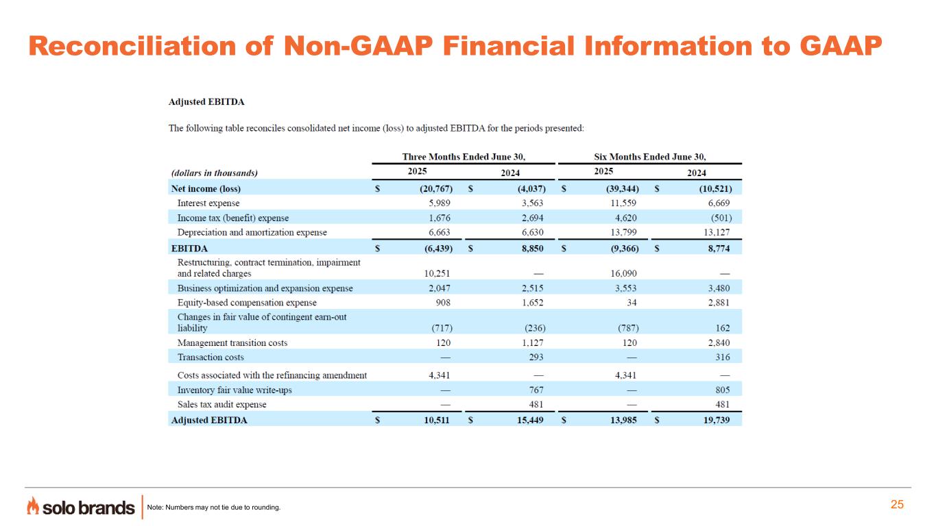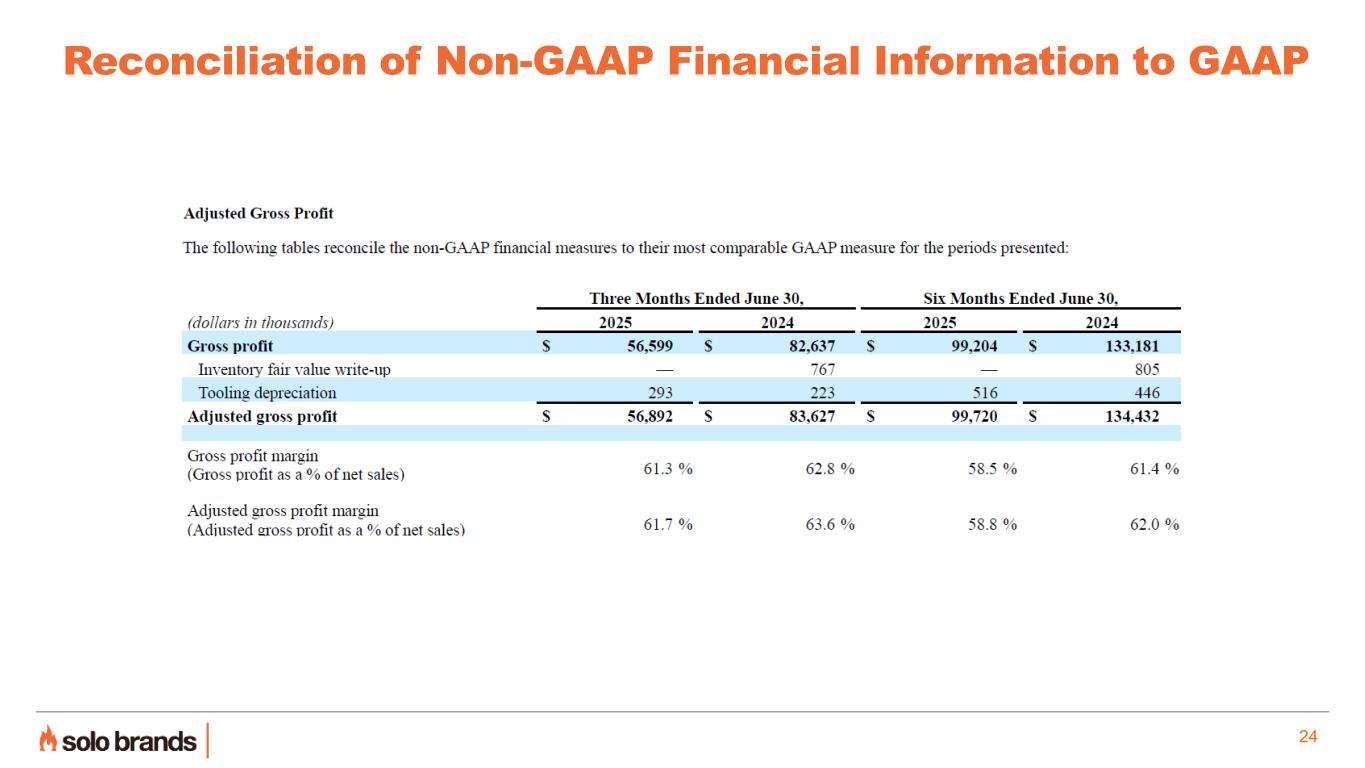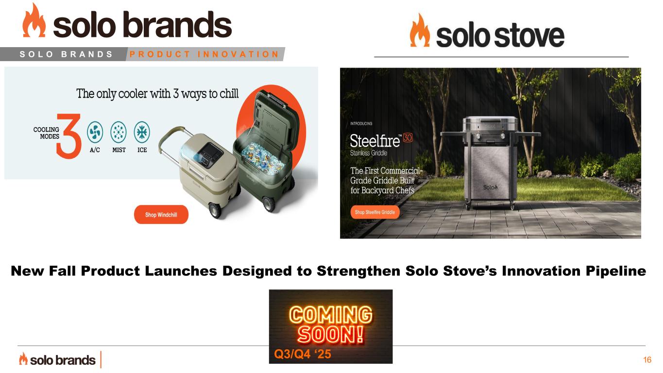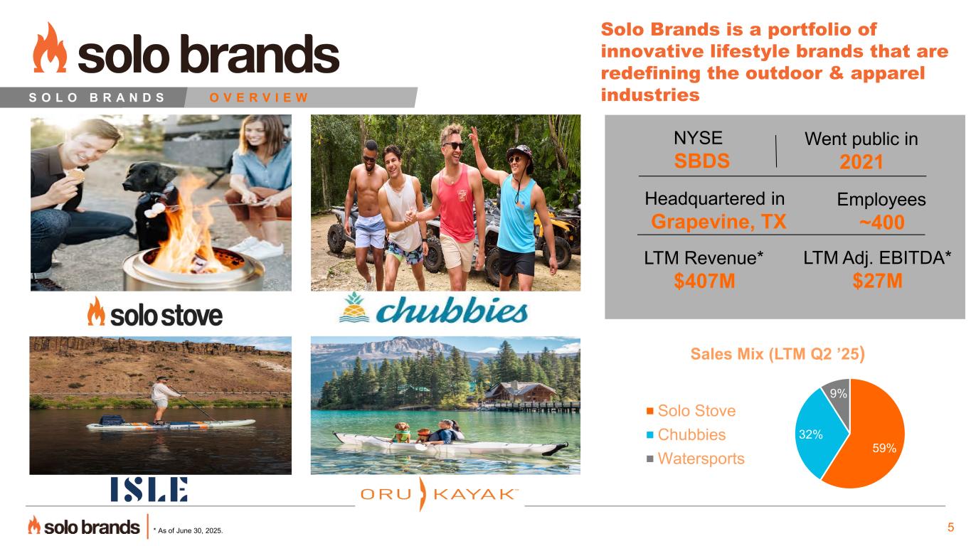 Legal disclaimer This presentation may include forward-looking statements within the meaning of Private Securities Litigation Reform Act of 1995. All statements contained in this presentation that do not relate to matters of historical fact should be considered forward-looking statements, including without limitation, statements regarding financial projections and/or goals, anticipated performance of the Company and its affiliates, and future organizational, marketing and product strategies. In some cases, you can identify forward-looking statements by terms such as “may,” “will,” “should,” “expects,” “plans,” “anticipates,” “could,” “intends,” “targets,” “projects,” “contemplates,” “believes,” “estimates,” “forecasts,” “guidance,” “predicts,” “potential” or “continue” or the negative of these terms or other similar expressions. These statements are neither promises nor guarantees, but involve known and unknown risks, uncertainties and other important factors that may cause our actual results, performance or achievements to be materially different from any future results, performance or and operations, expressed or implied by the forward-looking statements, including, but not limited to, the following: our future ability to continue as a going concern; our ability to realize expected benefits from our strategic plans; our ability to implement any restructuring and cost-reduction efforts; our limited liquidity; our ability to mitigate the impact of new and increased tariffs and similar restrictions on our business; our reliance on third-party manufacturers, which operate mostly outside of the U.S., and problems with, or the loss of, our suppliers or an inability to obtain raw materials; our dependence on cash generated from operations to support our business and our growth initiatives; our continued ability to comply with the listing standards of the NYSE; the effects of the reverse stock split effected in July 2025 on the trading of our Class A common stock; risks associated with fluctuations in the price of our Class A common stock; risks associated with our indebtedness, including the limits imposed by our indebtedness to invest in the ongoing needs of our business; our ability to maintain and strengthen our brand to generate and maintain ongoing demand for our products; our ability to design, develop and introduce new products; our ability to manage our future growth effectively; our ability to expand into additional markets; risks associated with our international operations; our inability to sustain historic growth rates; our ability to cost-effectively attract new customers and retain our existing customers; the highly competitive market in which we operate; our failure to maintain product quality and product performance at an acceptable cost; the impact of product liability and warranty claims and product recalls, including write-offs; geopolitical actions, natural disasters, or pandemics; the ability of our largest stockholders to influence corporate matters.. These and other important factors discussed under the caption “Risk Factors” in our Annual Report on Form 10-K for the year ended December 31, 2024, as updated by our Quarterly Report on Form 10-Q for the quarterly period ended June 30, 2025 and as may be further updated in other filings we make with the Securities and Exchange Commission, could cause actual results to differ materially from those indicated by the forward-looking statements made in this presentation. Forward-looking statements speak only as of the date the statements are made and are based on information available to Solo Brands at the time those statements are made and/or management's good faith belief as of that time with respect to future events. We undertake no obligation to update or revise any forward-looking statements, whether as a result of new information, future events or otherwise, except as required by applicable law. Non-GAAP Financial Measures We report our financial results in accordance with accounting principles generally accepted in the United States (“U.S. GAAP”); however, management believes that certain non-GAAP financial measures provide users of our financial information with useful supplemental information that enables a better comparison of our performance across periods. We use adjusted gross profit, adjusted gross profit margin, adjusted EBITDA and adjusted EBITDA margin, because we believe they are useful indicators of our operating performance. Our management uses these non-GAAP measures principally as measures of our operating performance and believes that these non-GAAP measures are useful to our investors because they are frequently used by securities analysts, investors and other interested parties in their evaluation of the operating performance of companies in industries similar to ours. Our management also uses these non-GAAP measures for planning purposes, including the preparation of our annual operating budget and financial projections. None of these non-GAAP measures is a measurement of financial performance under U.S. GAAP. These non-GAAP measures should not be considered in isolation or as a substitute for a measure of our liquidity or operating performance prepared in accordance with U.S. GAAP and are not indicative of net income (loss) as determined under U.S. GAAP. In addition, the exclusion of certain gains or losses in the calculation of non-GAAP financial measures should not be construed as an inference that these items are unusual or infrequent as they may recur in the future, nor should it be construed that our future results will be unaffected by unusual or non-recurring items. These non-GAAP financial measures have limitations that should be considered before using these measures to evaluate our liquidity or financial performance. Some of these limitations are as follows. These non-GAAP measures exclude certain tax payments th