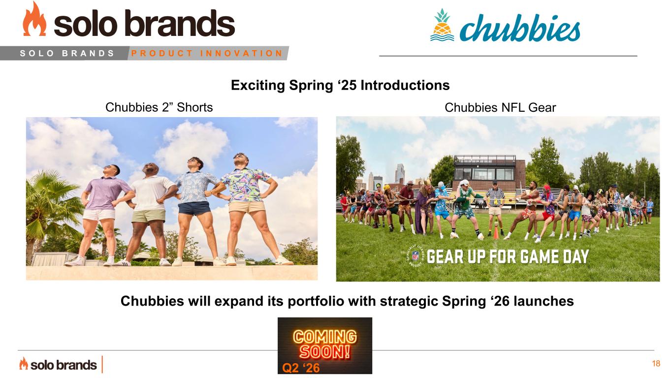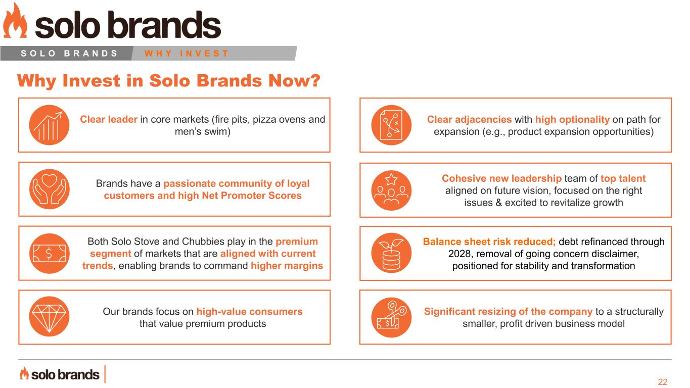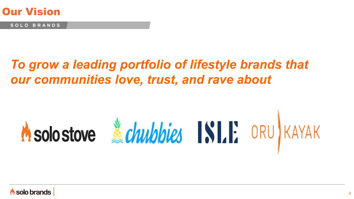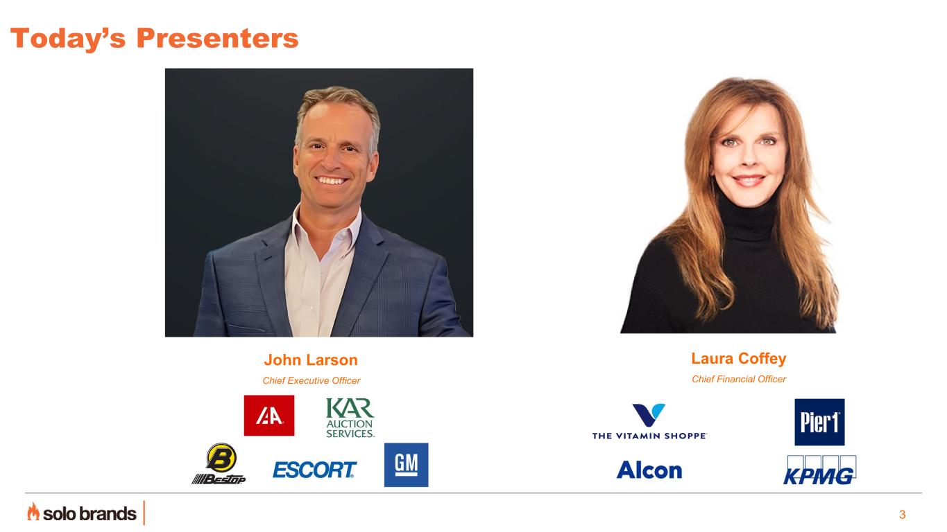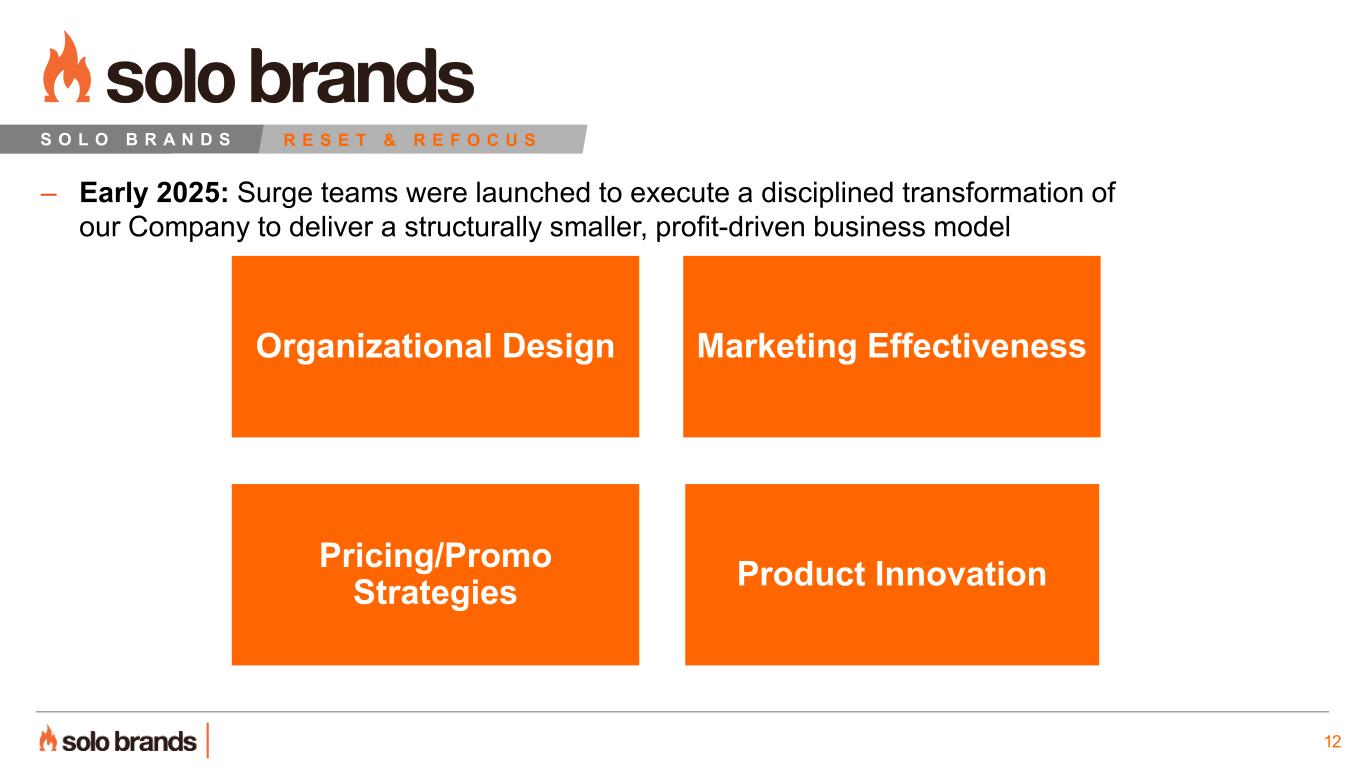 Legal disclaimer This presentation may include forward-looking statements within the meaning of Private Securities Litigation Reform Act of 1995. All statements contained in this presentation that do not relate to matters of historical fact should be considered forward-looking statements, including without limitation, statements regarding financial projections and/or goals, anticipated performance of the Company and its affiliates, and future organizational, marketing and product strategies. In some cases, you can identify forward-looking statements by terms such as “may,” “will,” “should,” “expects,” “plans,” “anticipates,” “could,” “intends,” “targets,” “projects,” “contemplates,” “believes,” “estimates,” “forecasts,” “guidance,” “predicts,” “potential” or “continue” or the negative of these terms or other similar expressions. These statements are neither promises nor guarantees, but involve known and unknown risks, uncertainties and other important factors that may cause our actual results, performance or achievements to be materially different from any future results, performance or and operations, expressed or implied by the forward-looking statements, including, but not limited to, the following: our future ability to continue as a going concern; our ability to realize expected benefits from our strategic plans; our ability to implement any restructuring and cost-reduction efforts; our limited liquidity; our ability to mitigate the impact of new and increased tariffs and similar restrictions on our business; our reliance on third-party manufacturers, which operate mostly outside of the U.S., and problems with, or the loss of, our suppliers or an inability to obtain raw materials; our dependence on cash generated from operations to support our business and our growth initiatives; our continued ability to comply with the listing standards of the NYSE; the effects of the reverse stock split effected in July 2025 on the trading of our Class A common stock; risks associated with fluctuations in the price of our Class A common stock; risks associated with our indebtedness, including the limits imposed by our indebtedness to invest in the ongoing needs of our business; our ability to maintain and strengthen our brand to generate and maintain ongoing demand for our products; our ability to design, develop and introduce new products; our ability to manage our future growth effectively; our ability to expand into additional markets; risks associated with our international operations; our inability to sustain historic growth rates; our ability to cost-effectively attract new customers and retain our existing customers; the highly competitive market in which we operate; our failure to maintain product quality and product performance at an acceptable cost; the impact of product liability and warranty claims and product recalls, including write-offs; geopolitical actions, natural disasters, or pandemics; the ability of our largest stockholders to influence corporate matters.. These and other important factors discussed under the caption “Risk Factors” in our Annual Report on Form 10-K for the year ended December 31, 2024, as updated by our Quarterly Report on Form 10-Q for the quarterly period ended June 30, 2025 and as may be further updated in other filings we make with the Securities and Exchange Commission, could cause actual results to differ materially from those indicated by the forward-looking statements made in this presentation. Forward-looking statements speak only as of the date the statements are made and are based on information available to Solo Brands at the time those statements are made and/or management's good faith belief as of that time with respect to future events. We undertake no obligation to update or revise any forward-looking statements, whether as a result of new information, future events or otherwise, except as required by applicable law. Non-GAAP Financial Measures We report our financial results in accordance with accounting principles generally accepted in the United States (“U.S. GAAP”); however, management believes that certain non-GAAP financial measures provide users of our financial information with useful supplemental information that enables a better comparison of our performance across periods. We use adjusted gross profit, adjusted gross profit margin, adjusted EBITDA and adjusted EBITDA margin, because we believe they are useful indicators of our operating performance. Our management uses these non-GAAP measures principally as measures of our operating performance and believes that these non-GAAP measures are useful to our investors because they are frequently used by securities analysts, investors and other interested parties in their evaluation of the operating performance of companies in industries similar to ours. Our management also uses these non-GAAP measures for planning purposes, including the preparation of our annual operating budget and financial projections. None of these non-GAAP measures is a measurement of financial performance under U.S. GAAP. These non-GAAP measures should not be considered in isolation or as a substitute for a measure of our liquidity or operating performance prepared in accordance with U.S. GAAP and are not indicative of net income (loss) as determined under U.S. GAAP. In addition, the exclusion of certain gains or losses in the calculation of non-GAAP financial measures should not be construed as an inference that these items are unusual or infrequent as they may recur in the future, nor should it be construed that our future results will be unaffected by unusual or non-recurring items. These non-GAAP financial measures have limitations that should be considered before using these measures to evaluate our liquidity or financial performance. Some of these limitations are as follows. These non-GAAP measures exclude certain tax payments th