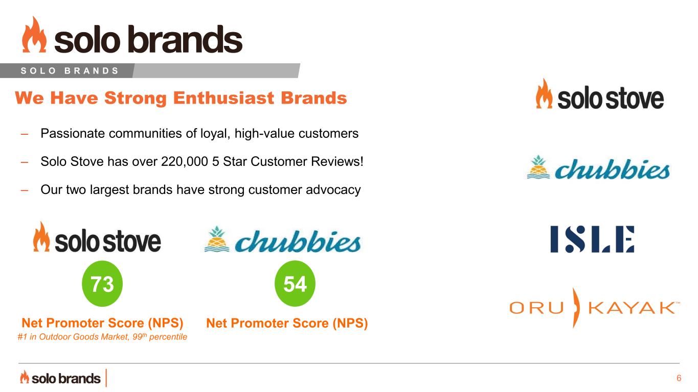 Solo Brands is a portfolio of innovative lifestyle brands that are redefining the outdoor & apparel industries 5 S O L O B R A N D S O V E R V I E W NYSE SBDS Went public in 2021 Headquartered in Grapevine, TX Employees ~400 LTM Revenue* $407M LTM Adj. EBITDA* $27M 59% 32% 9% Sales Mix (LTM Q2 ’25) Solo Stove Chubbies Watersports * As of June 30, 2025.