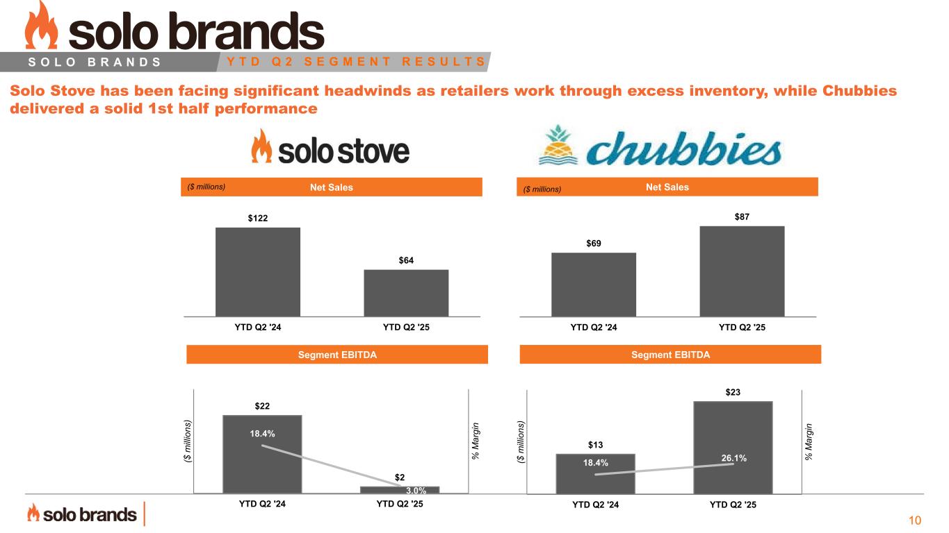 1) Gross profit, less inventory charges associated with restructuring and consolidation activities and tooling depreciation. Please refer to Appendix for reconciliation of GAAP to non-GAAP measures. 2) Represents total SG&A. 3) Please refer to Appendix for reconciliation of GAAP to non-GAAP measures. Net Sales Adjusted Gross Profit (1) Adjusted EBITDA (3) $132 $92 Q2 '24 Q2 '25 ($ millions) $84 $57 63.6% 61.7% Q2 '24 Q2 '25 % M ar gi n ($ m ill io ns ) $15 $11 11.7% 11.4% Q2 '24 Q2 '25 % M ar gi n ($ m ill io ns ) 9 SG&A (2) $71 $48 53.8% 51.7% Q2 '24 Q2 '25 % M ar gi n ($ m ill io ns ) While we anticipated near-term revenue pressure as we shifted away from a promotional model and worked through excess inventory at retailers, we have offset much of the impact through meaningful reductions in SG&A, supporting Adj. EBITDA performance S O L O B R A N D S Q 2 F I N A N C I A L P E R F O R M A N C E