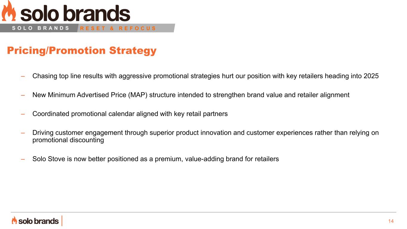 Organizational Design 13 ‒ Meaningful strides have been made in our transformation toward a disciplined, structurally smaller, profit-driven business model ‒ Established a Project Management Office to oversee and track profit-focused initiatives and headcount reductions on a weekly basis ‒ Reduced Q2 FY25 SG&A expenses by 33% year-over-year ‒ Thorough examination of all expenses including a nearly 20% reduction in workforce since January 1, 2025 ‒ Consolidated operations by closing two warehouses, with additional opportunities currently under review to optimize our footprint ‒ Lowered reliance on outside professional fees to further reduce costs ‒ Created enterprise-wide Centers of Expertise to drive efficiencies and standardize best practices across the portfolio S O L O B R A N D S R E S E T & R E F O C U S
