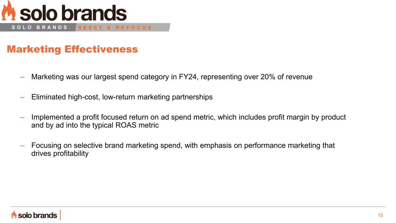 Pricing/Promotion Strategy 14 ‒ Chasing top line results with aggressive promotional strategies hurt our position with key retailers heading into 2025 ‒ New Minimum Advertised Price (MAP) structure intended to strengthen brand value and retailer alignment ‒ Coordinated promotional calendar aligned with key retail partners ‒ Driving customer engagement through superior product innovation and customer experiences rather than relying on promotional discounting ‒ Solo Stove is now better positioned as a premium, value-adding brand for retailers S O L O B R A N D S R E S E T & R E F O C U S